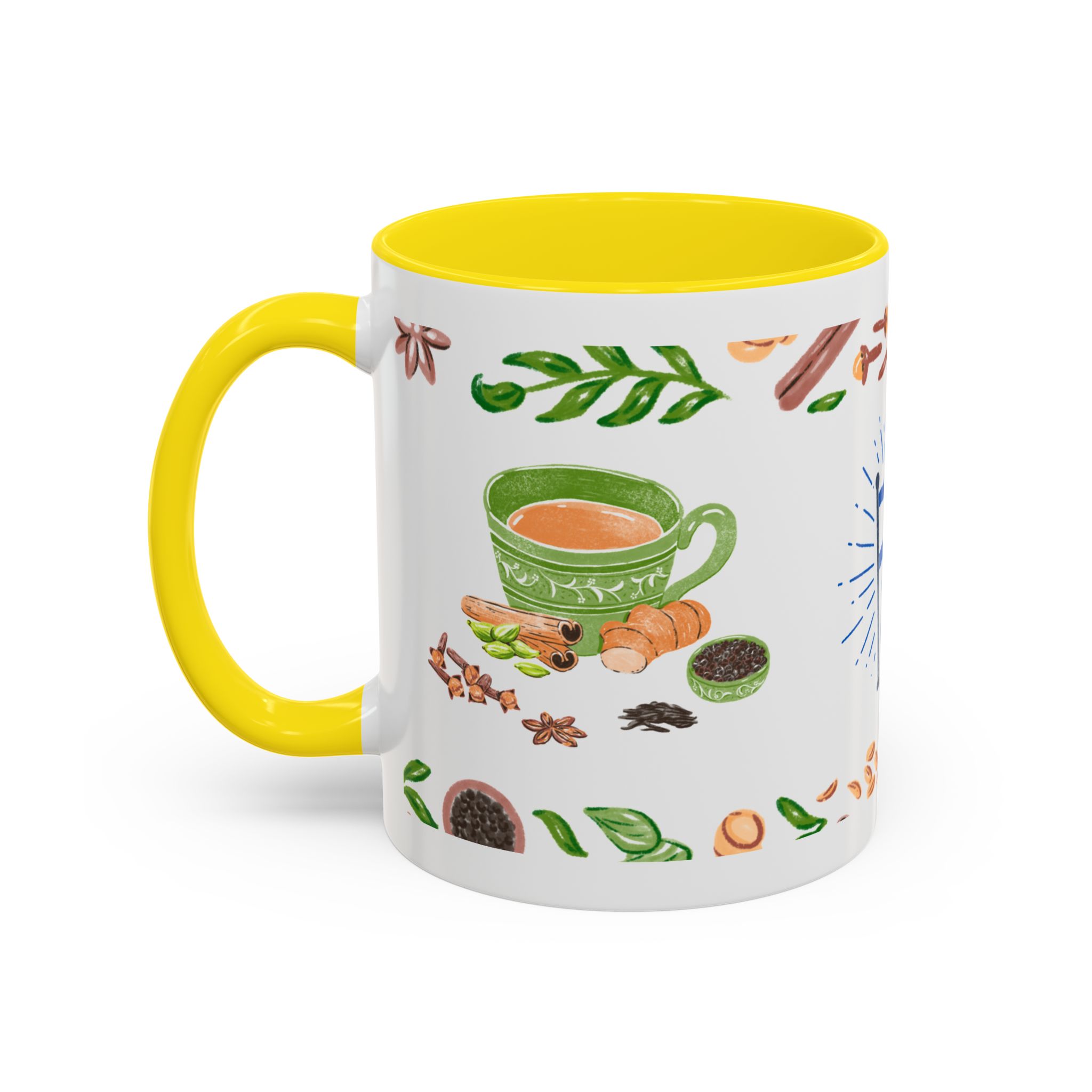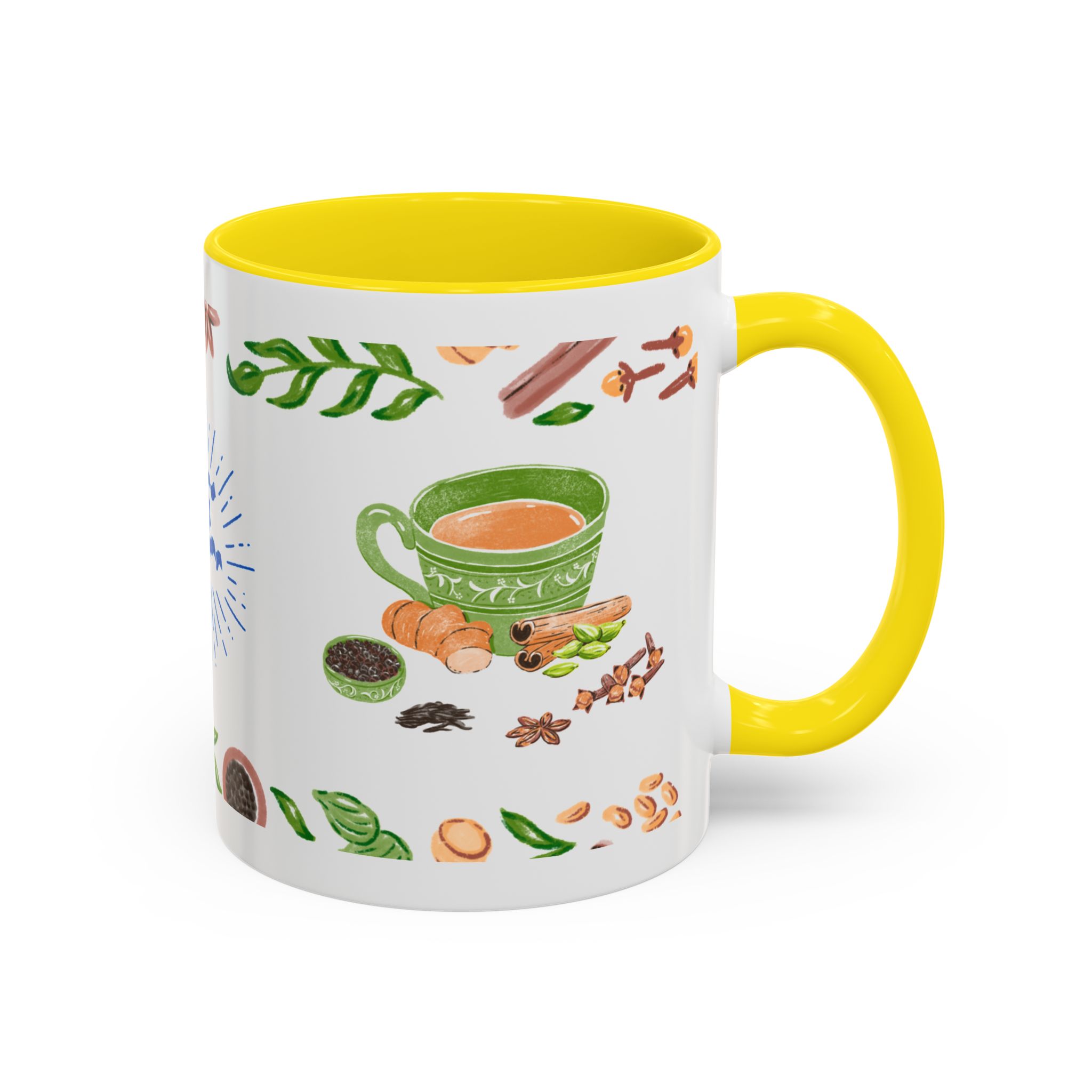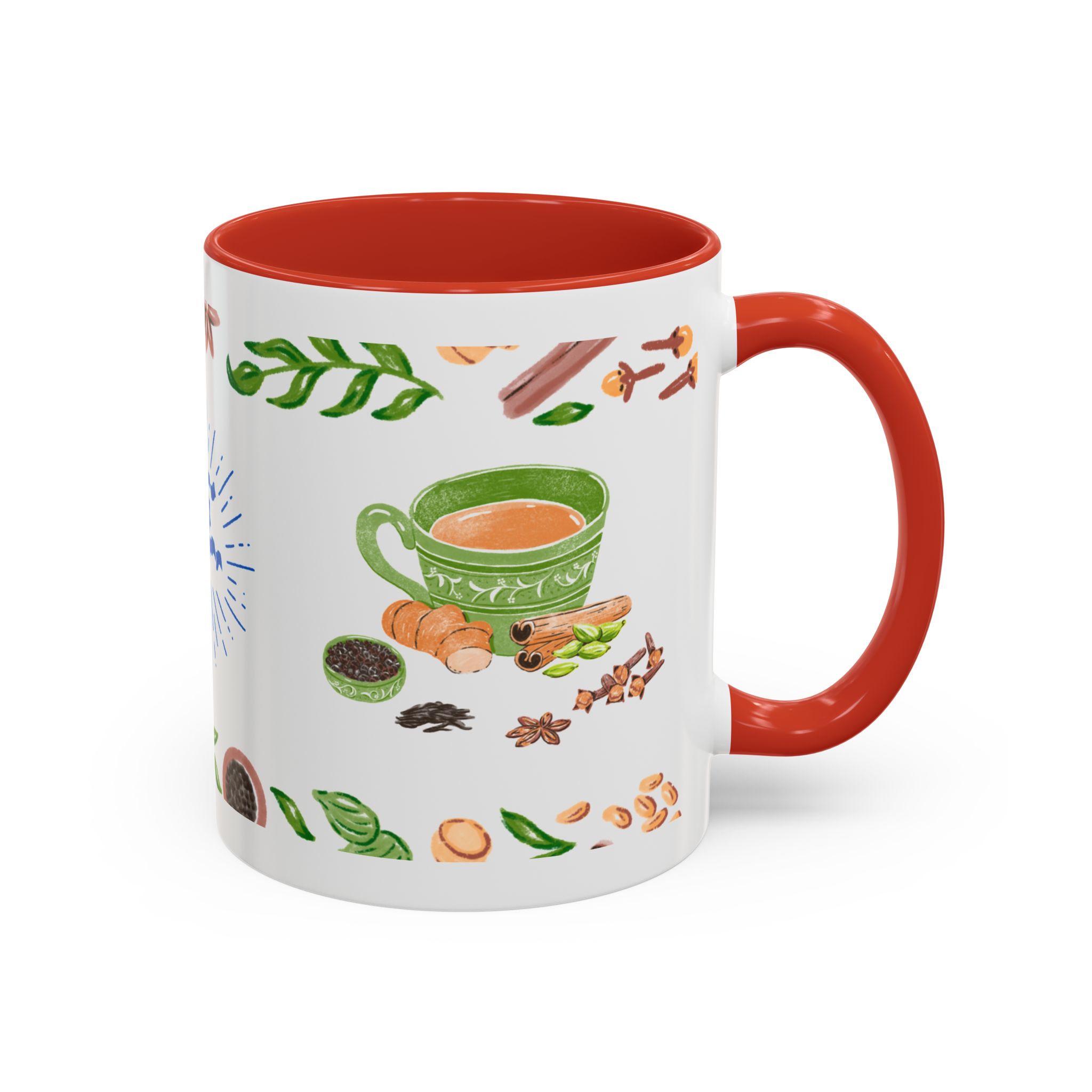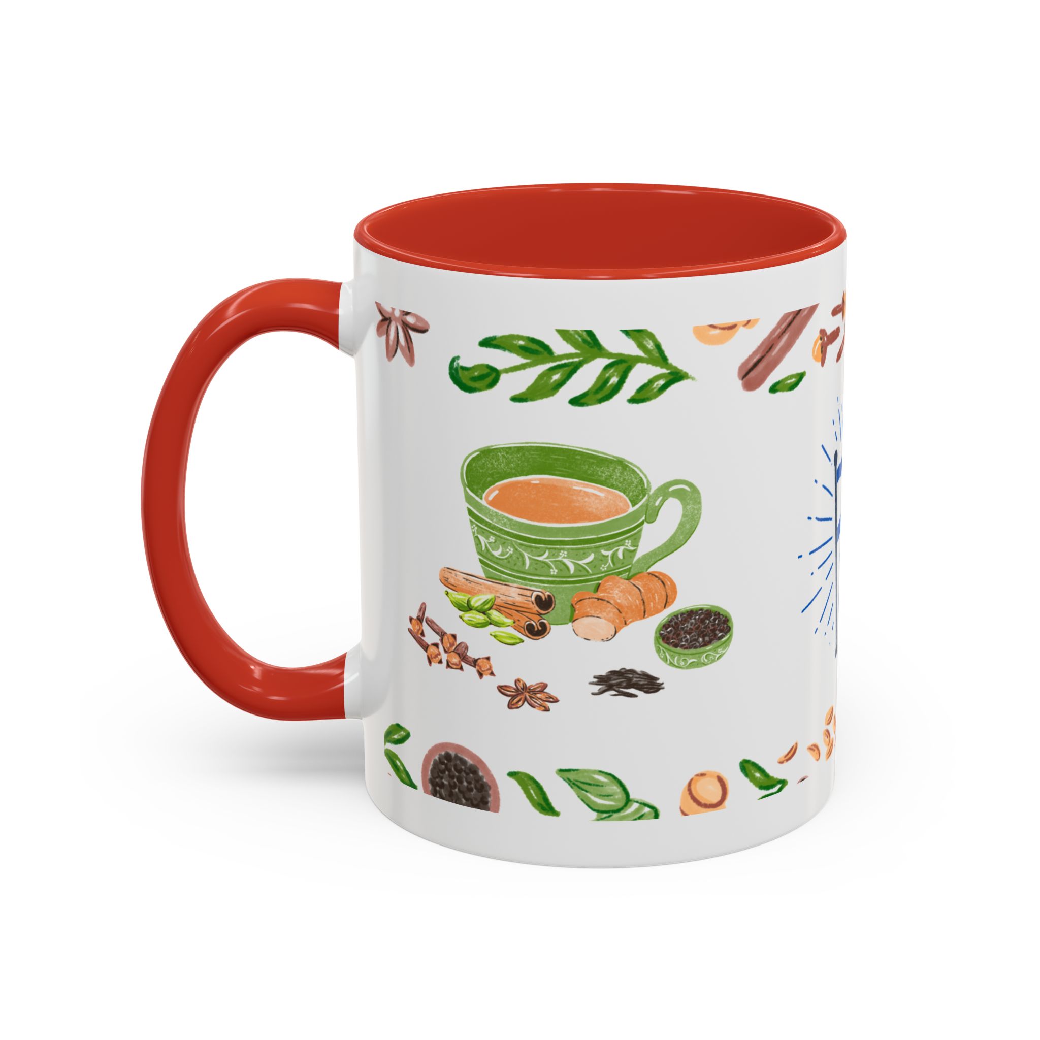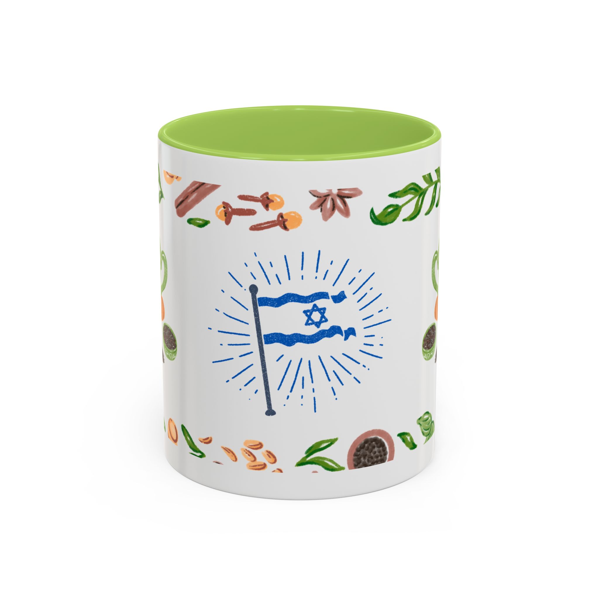Enjoy warm chai moments with this ceramic accent mug. It features hand-painted chai cups, spices, and an Israeli flag design that adds meaning and charm. The glossy white mug with a colored interior and handle feels cozy and cheerful. Perfect for tea, coffee, or cocoa, and a thoughtful gift for chai lovers and everyday rituals.