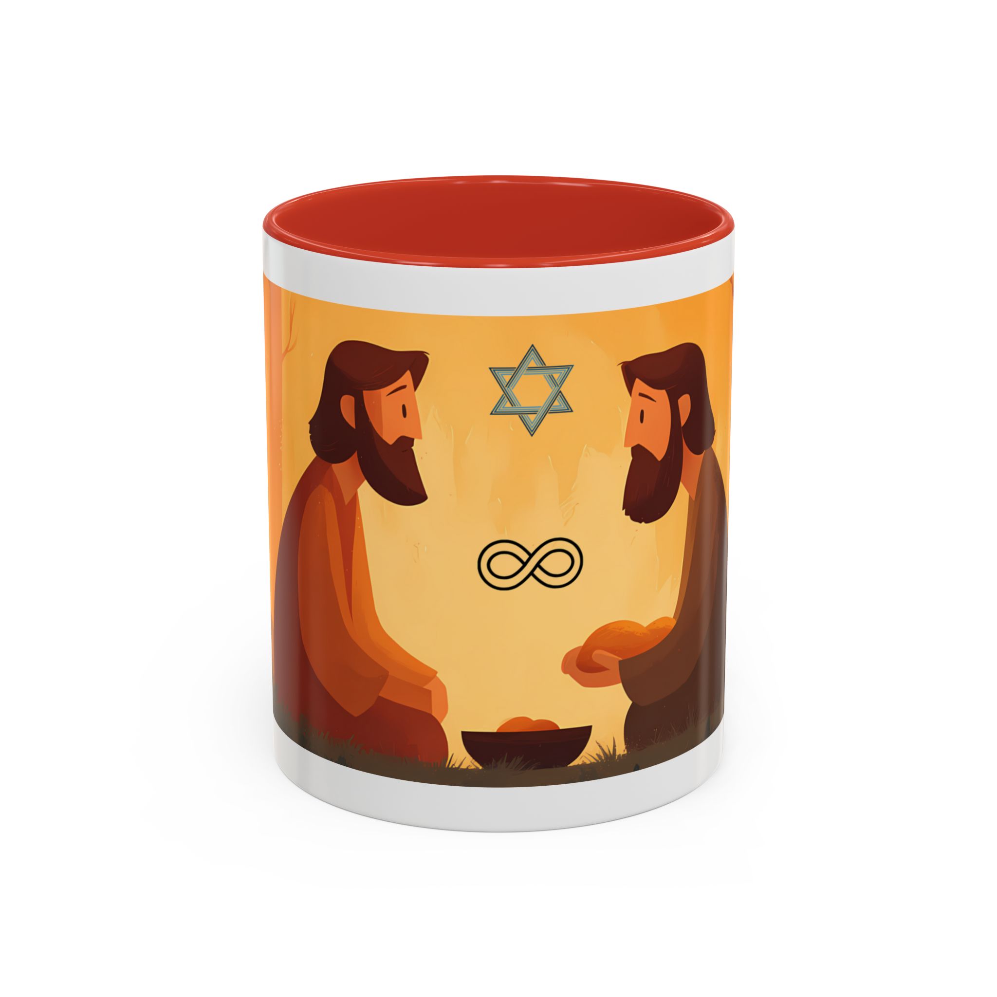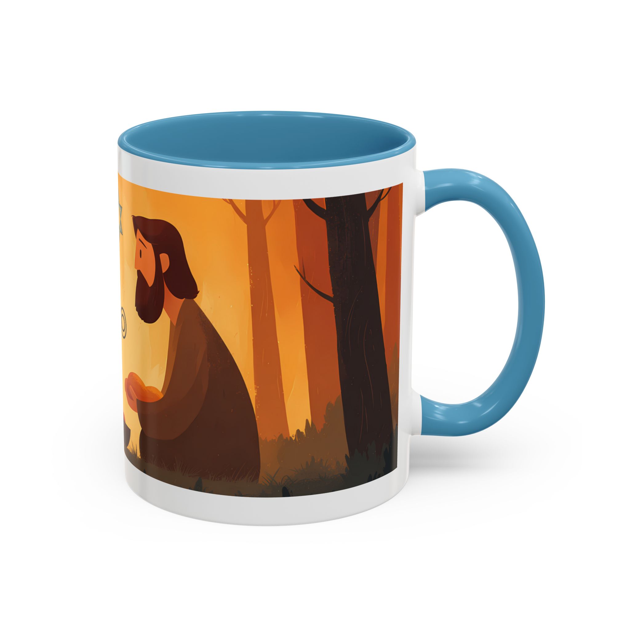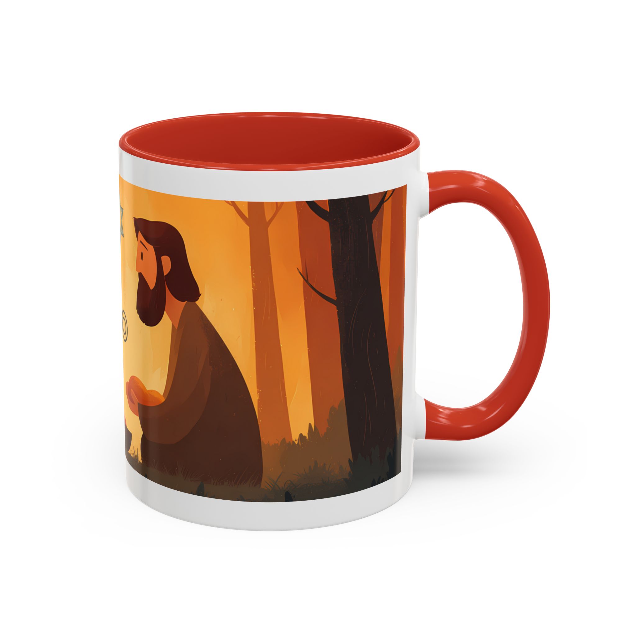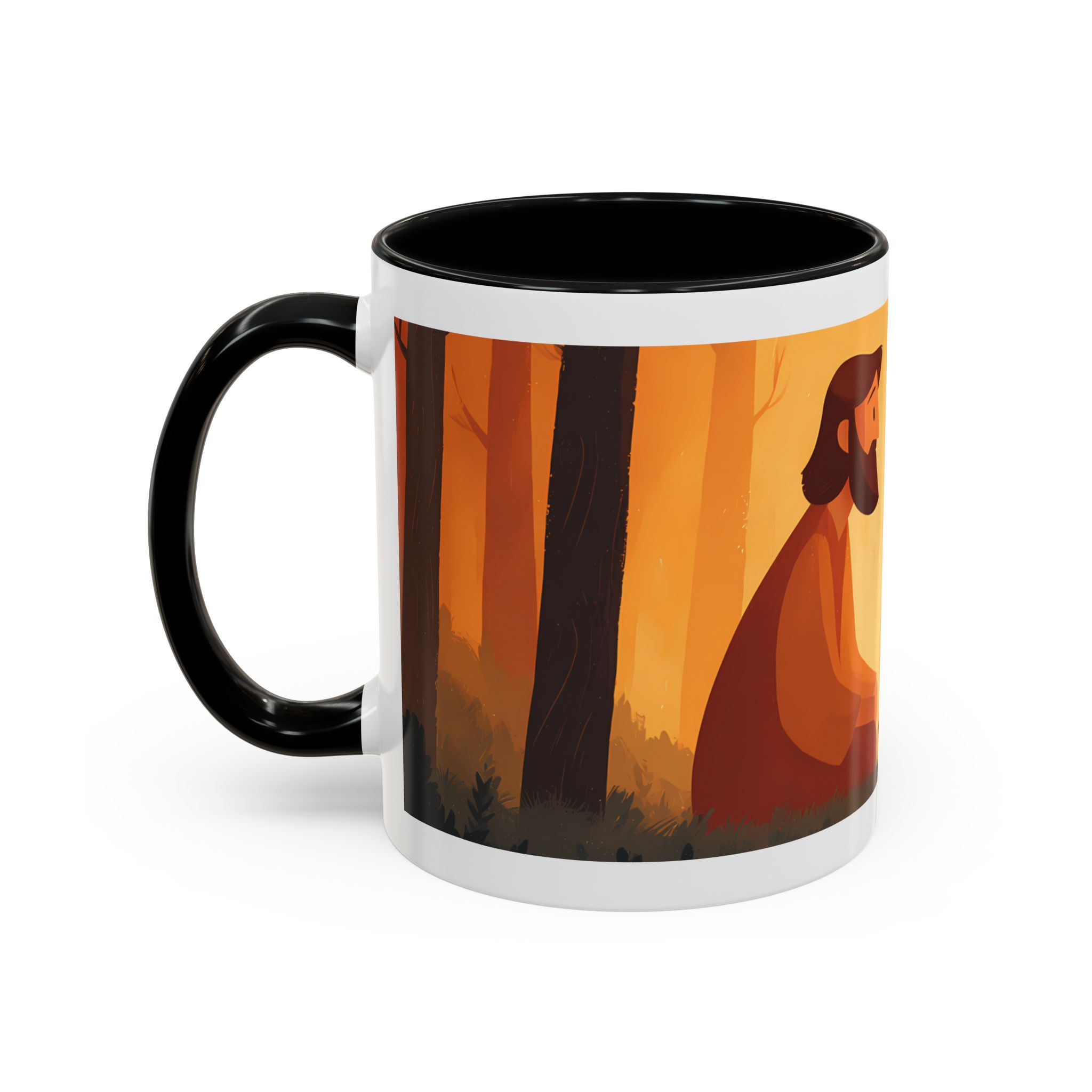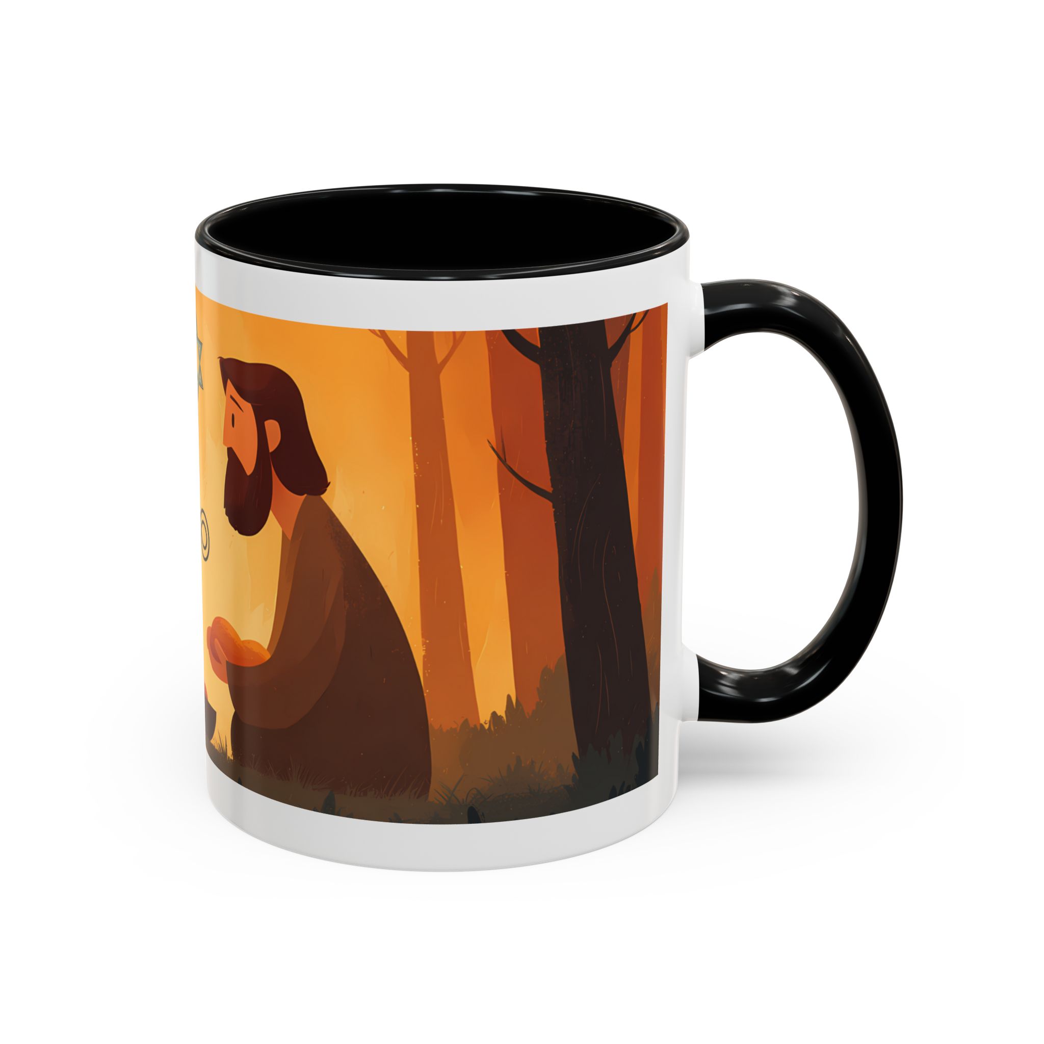 Warm, thoughtful, and quietly spiritual — this ceramic mug brings a gentle scene of two figures sharing a moment in a golden, autumnal light into your daily ritual. The illustrated tableau—soft earth tones, a small fire, and symbolic marks above—feels like a pause between tasks: a breath of reflection with your morning coffee or evening tea. It’s the kind of cup that sits on your desk during study, on the kitchen table during conversation, or quietly beside a book while you think. The colored interior and glossy finish add a lively contrast that makes the illustration sing while remaining calming and intimate.