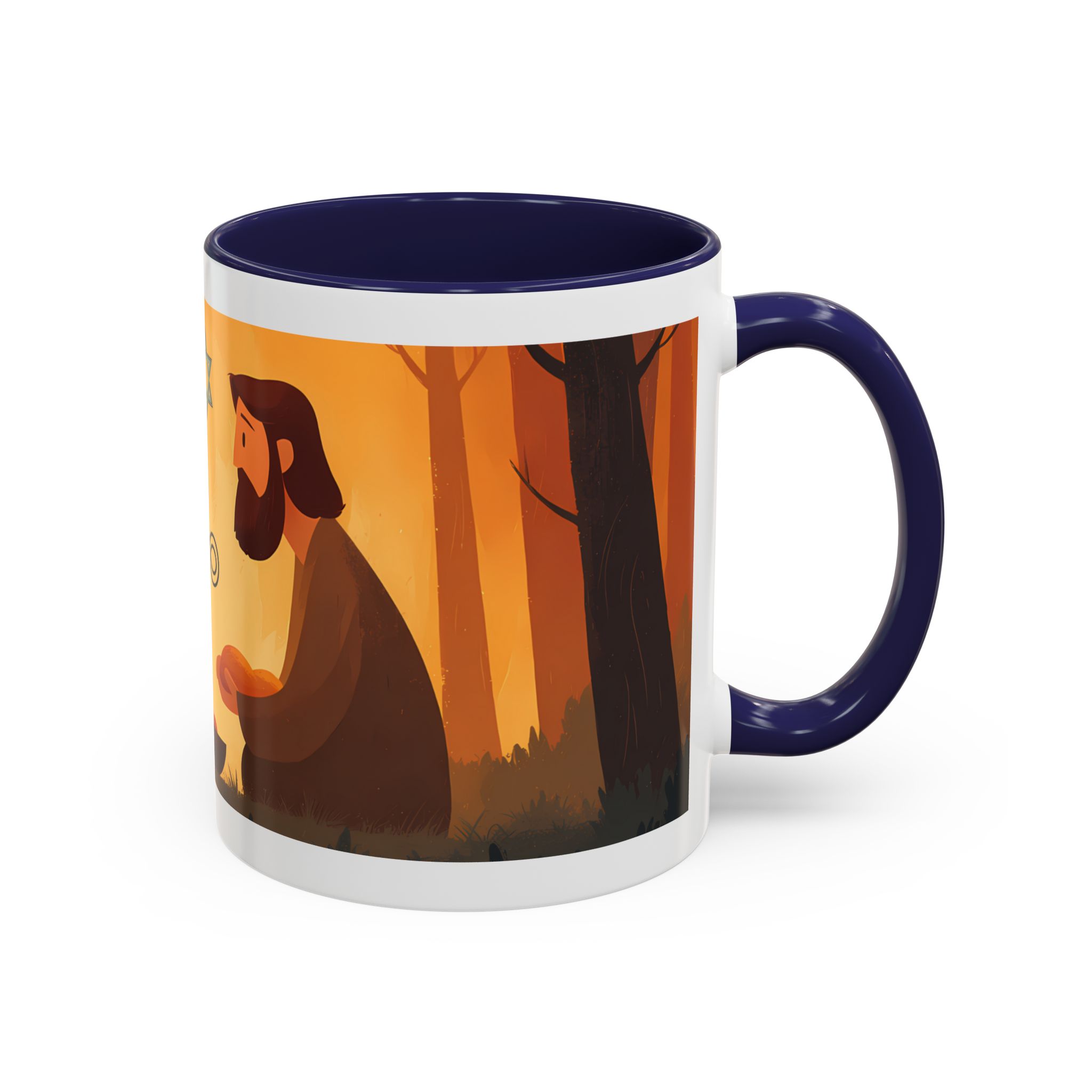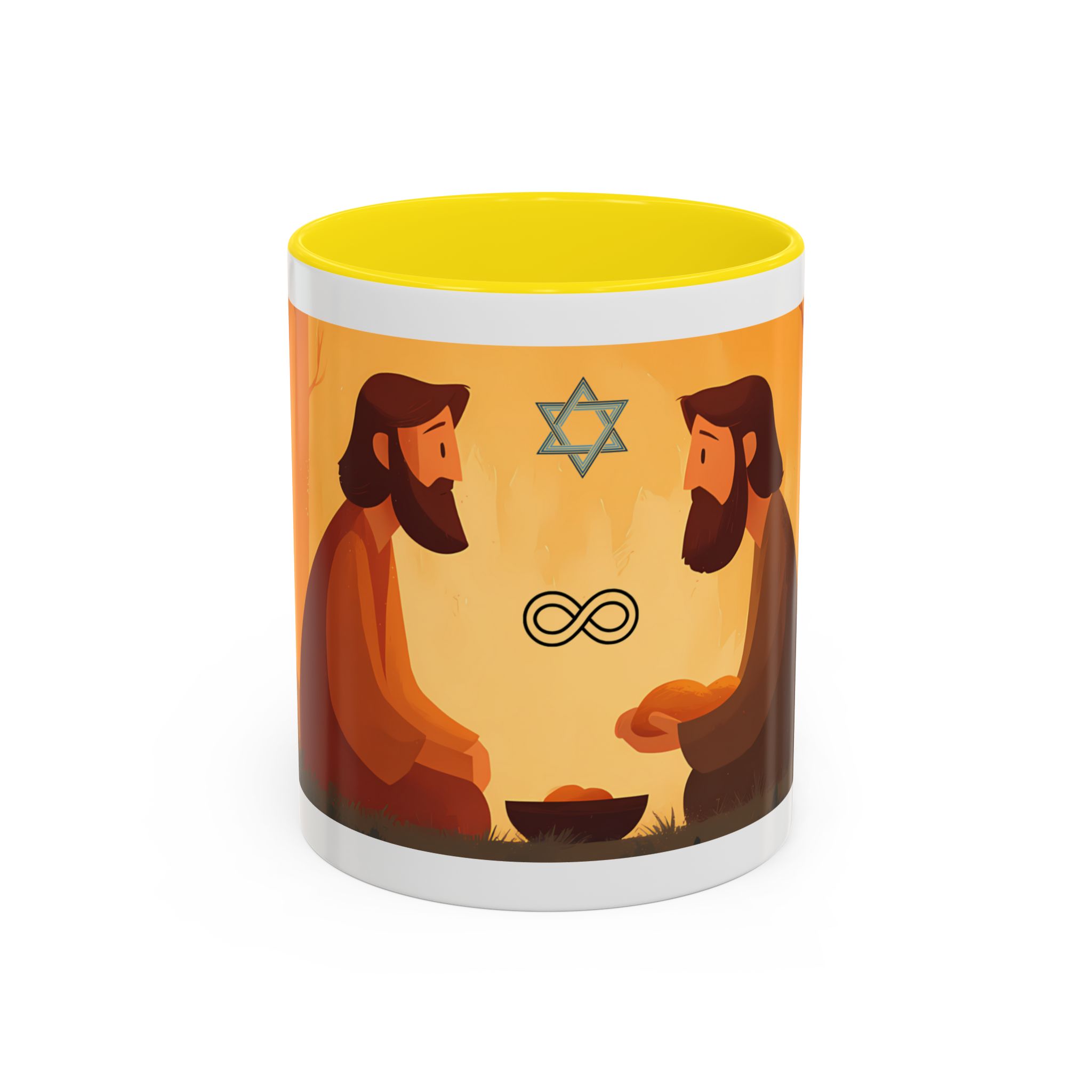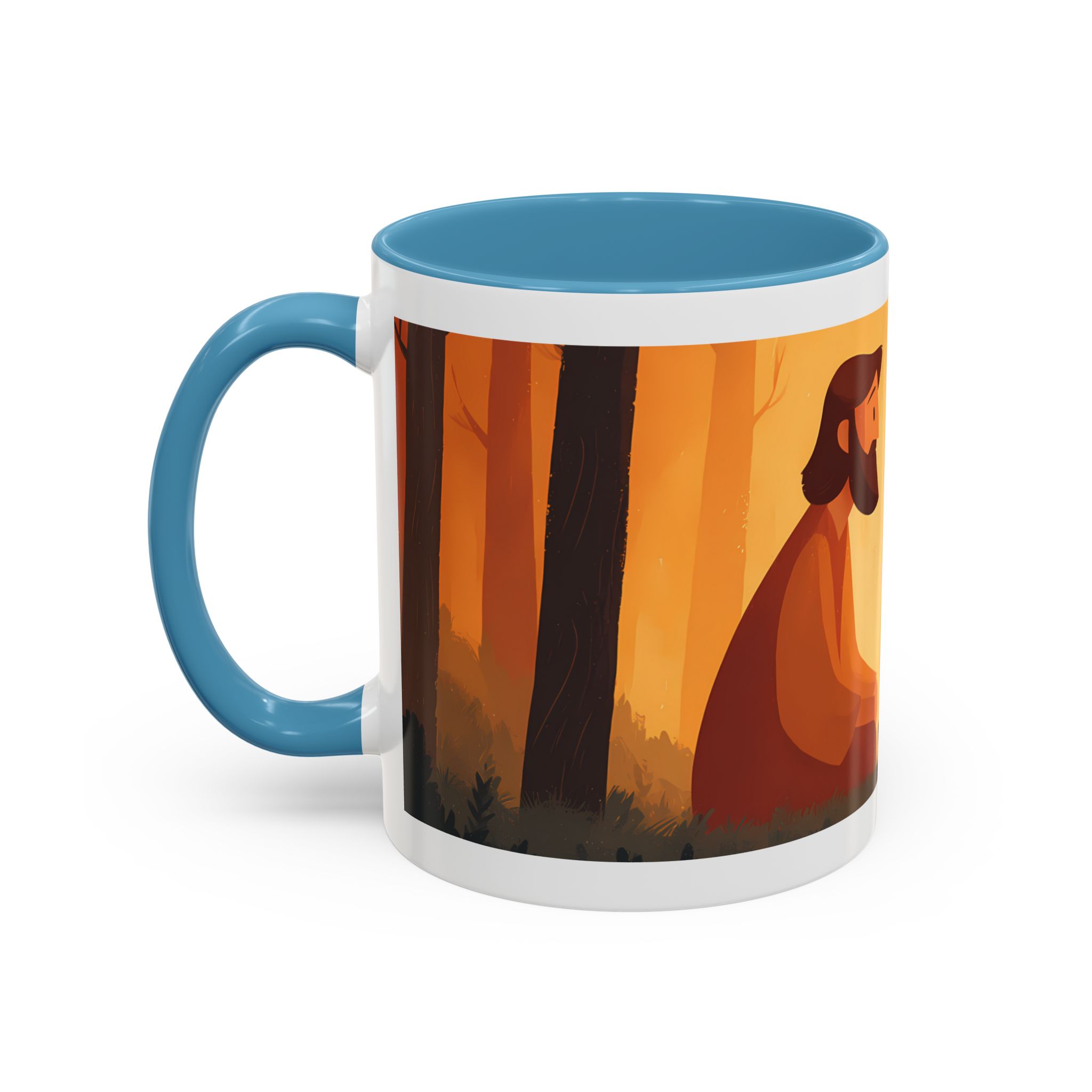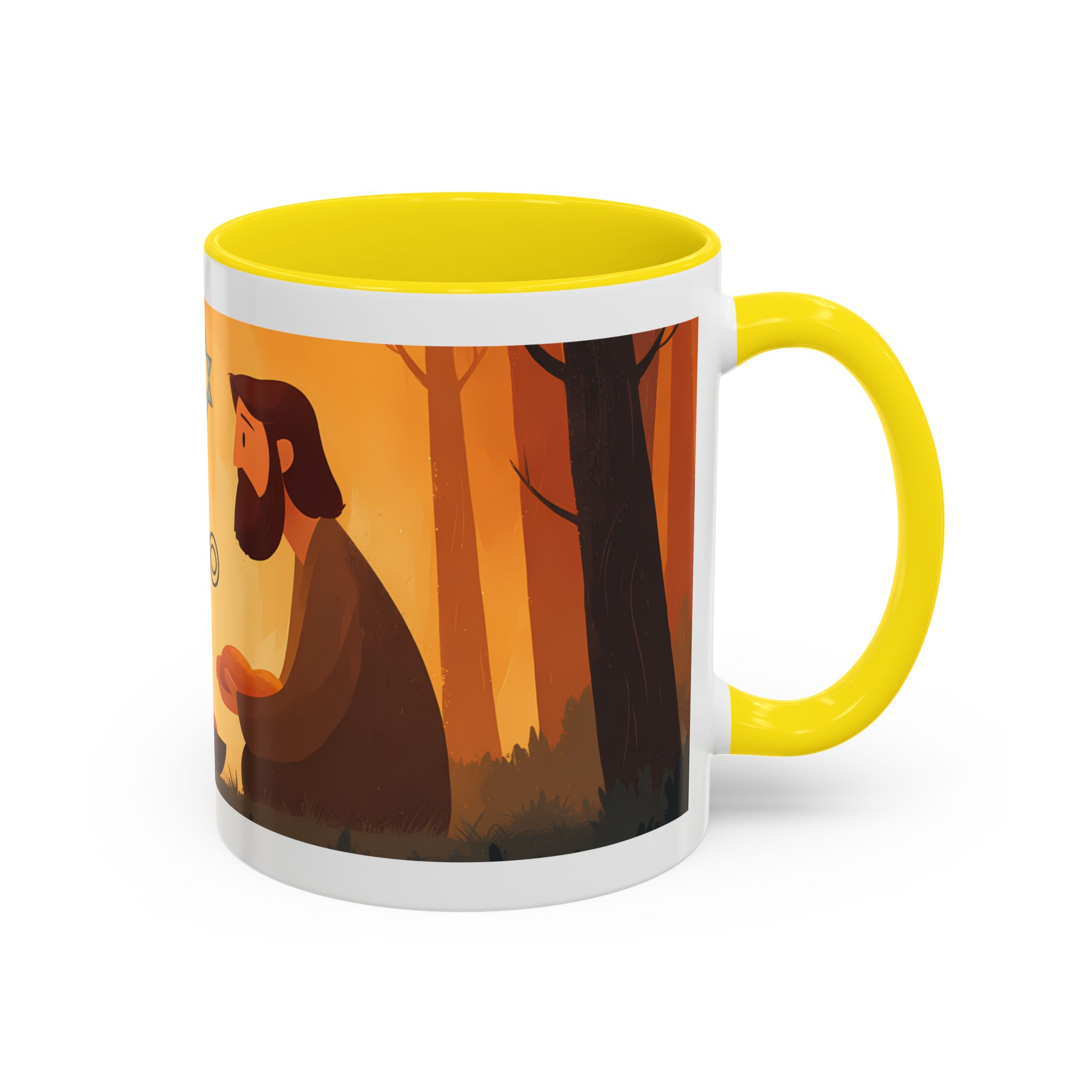 Warm, thoughtful, and quietly spiritual — this ceramic mug brings a gentle scene of two figures sharing a moment in a golden, autumnal light into your daily ritual. The illustrated tableau—soft earth tones, a small fire, and symbolic marks above—feels like a pause between tasks: a breath of reflection with your morning coffee or evening tea. It’s the kind of cup that sits on your desk during study, on the kitchen table during conversation, or quietly beside a book while you think. The colored interior and glossy finish add a lively contrast that makes the illustration sing while remaining calming and intimate.