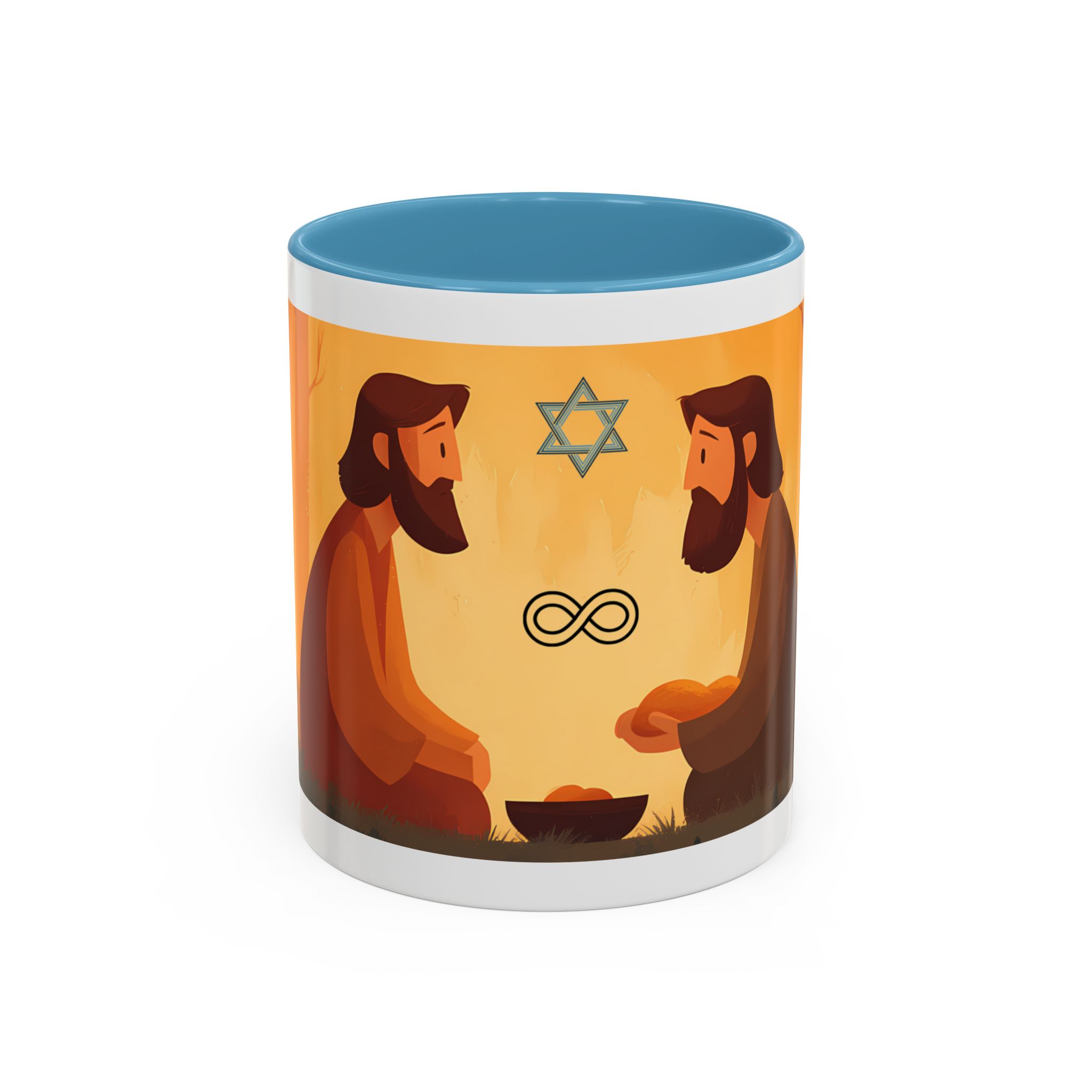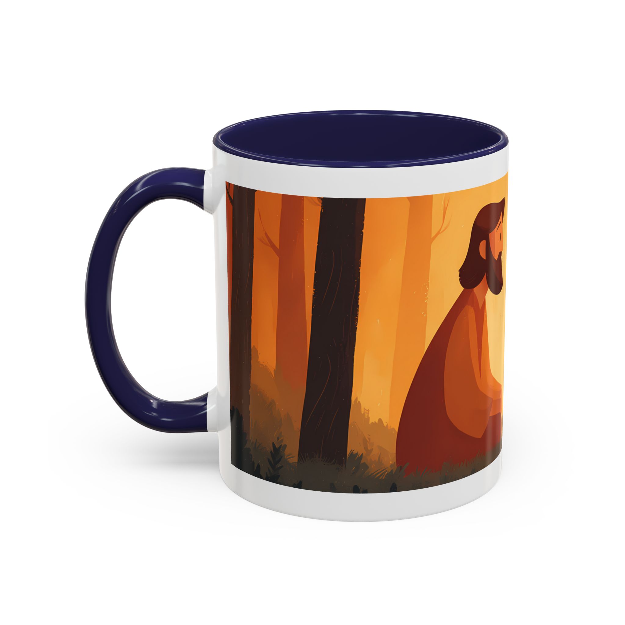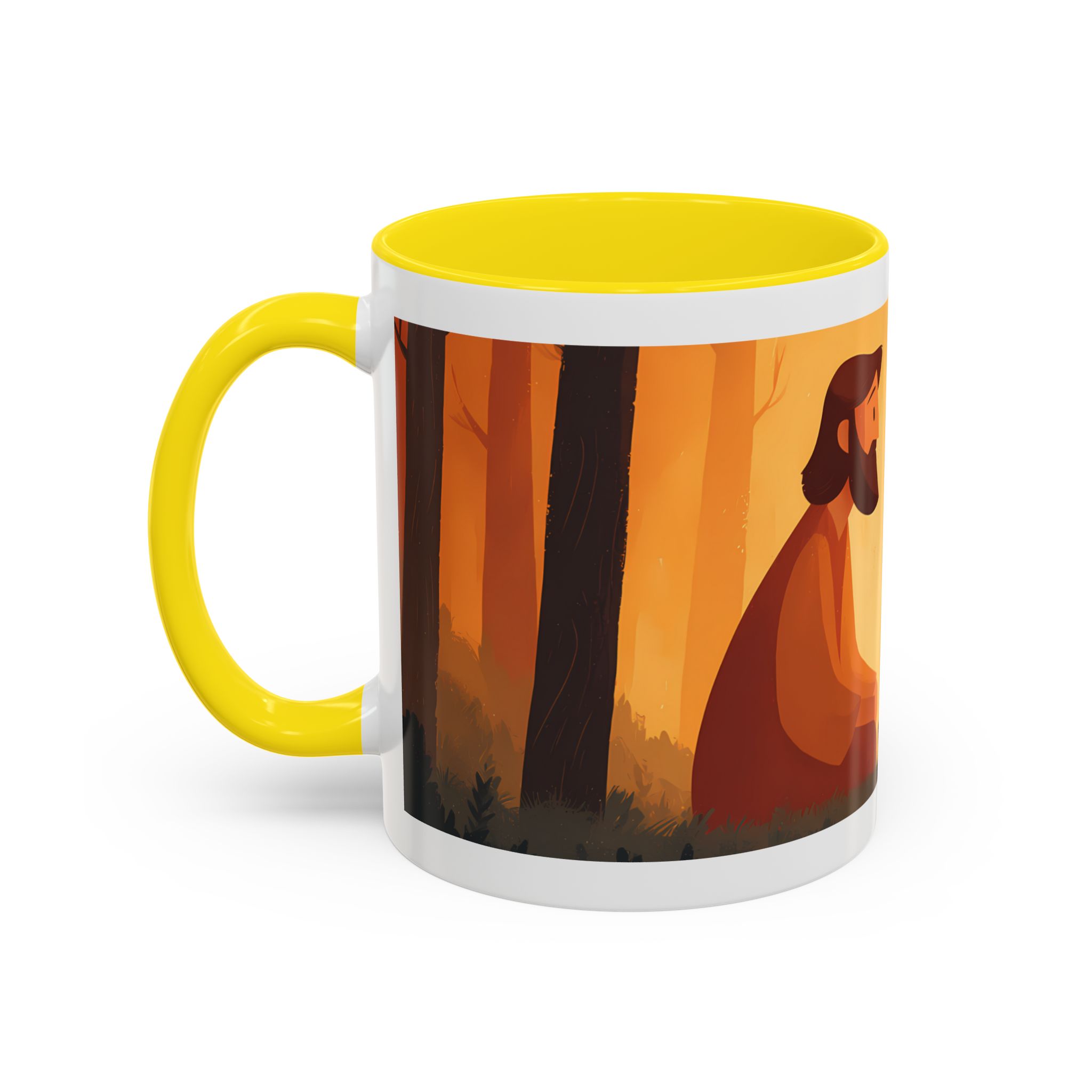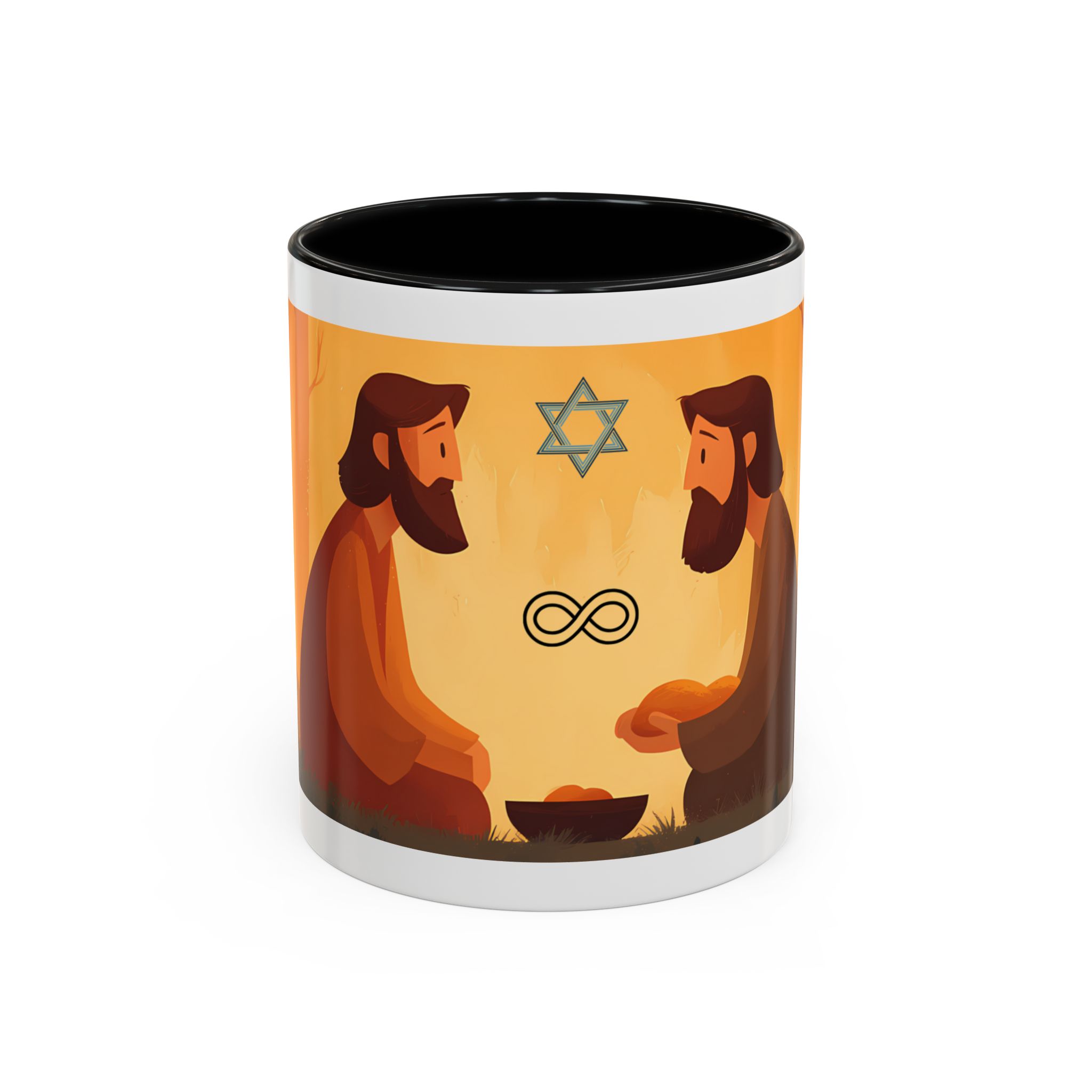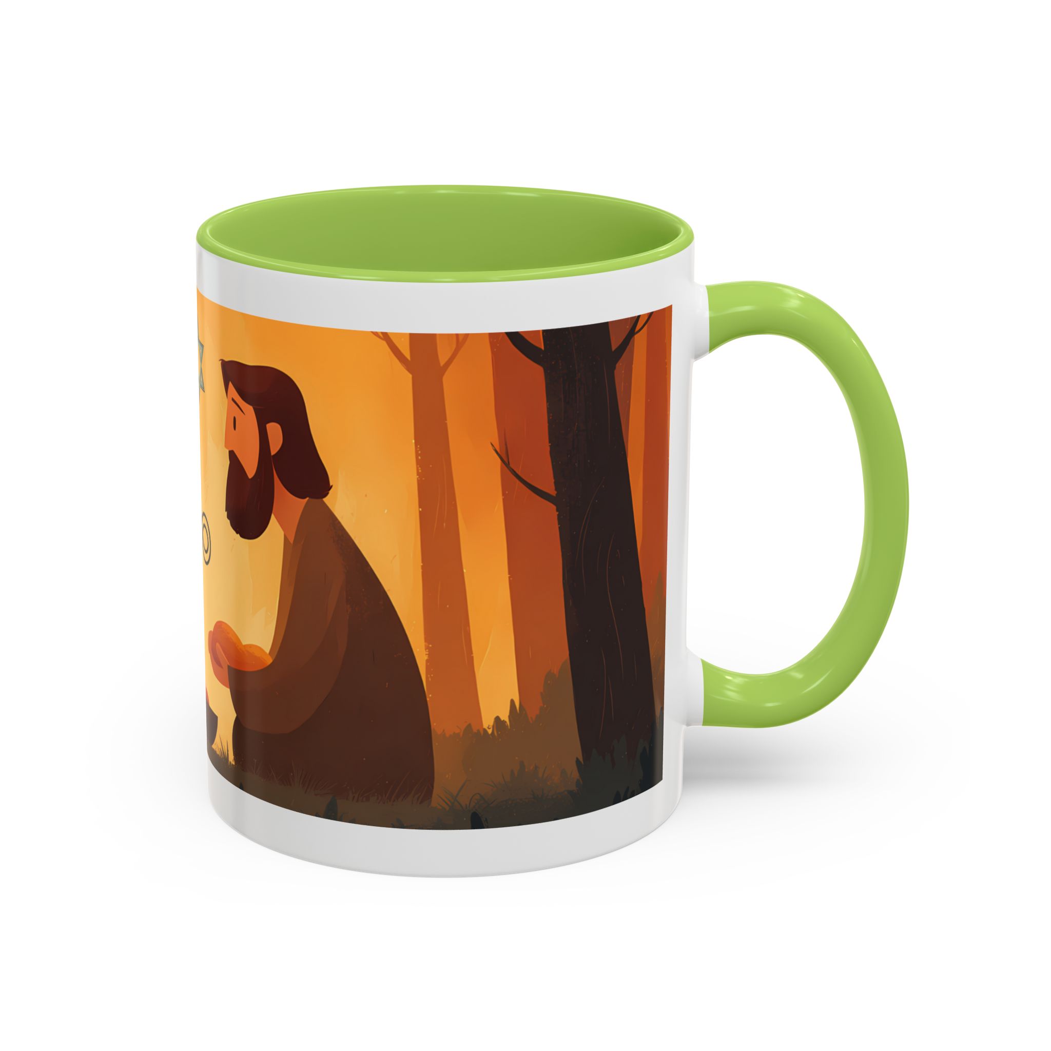 Warm, thoughtful, and quietly spiritual — this ceramic mug brings a gentle scene of two figures sharing a moment in a golden, autumnal light into your daily ritual. The illustrated tableau—soft earth tones, a small fire, and symbolic marks above—feels like a pause between tasks: a breath of reflection with your morning coffee or evening tea. It’s the kind of cup that sits on your desk during study, on the kitchen table during conversation, or quietly beside a book while you think. The colored interior and glossy finish add a lively contrast that makes the illustration sing while remaining calming and intimate.