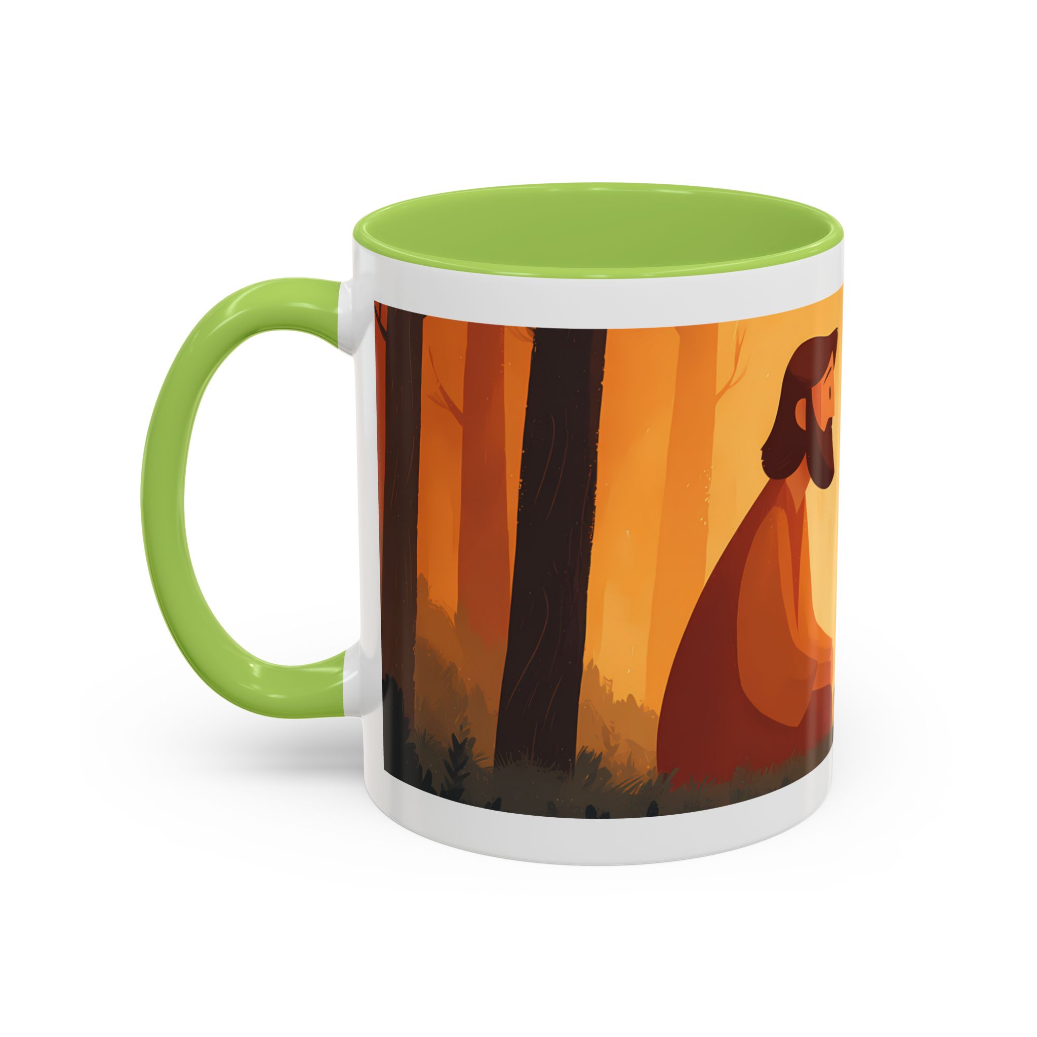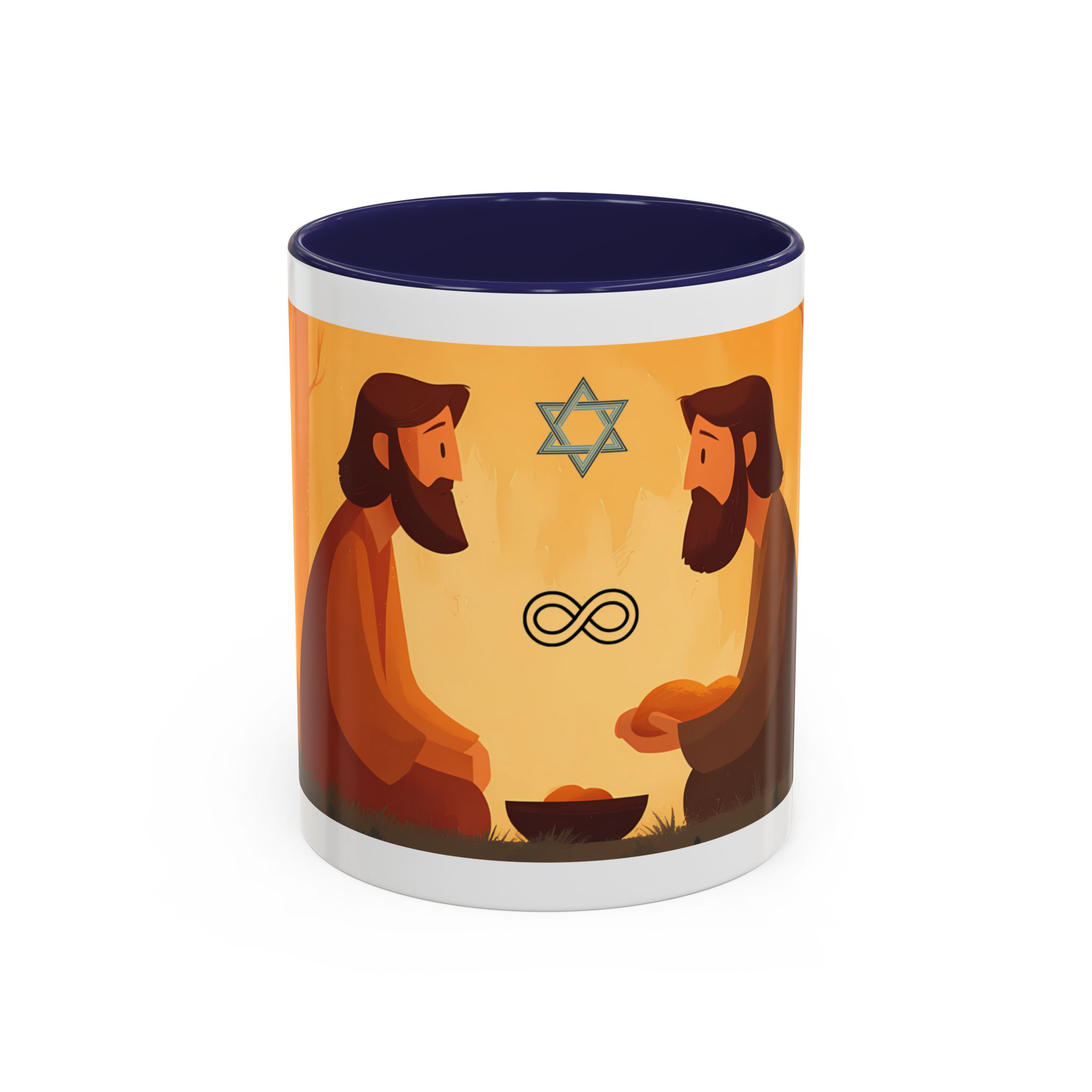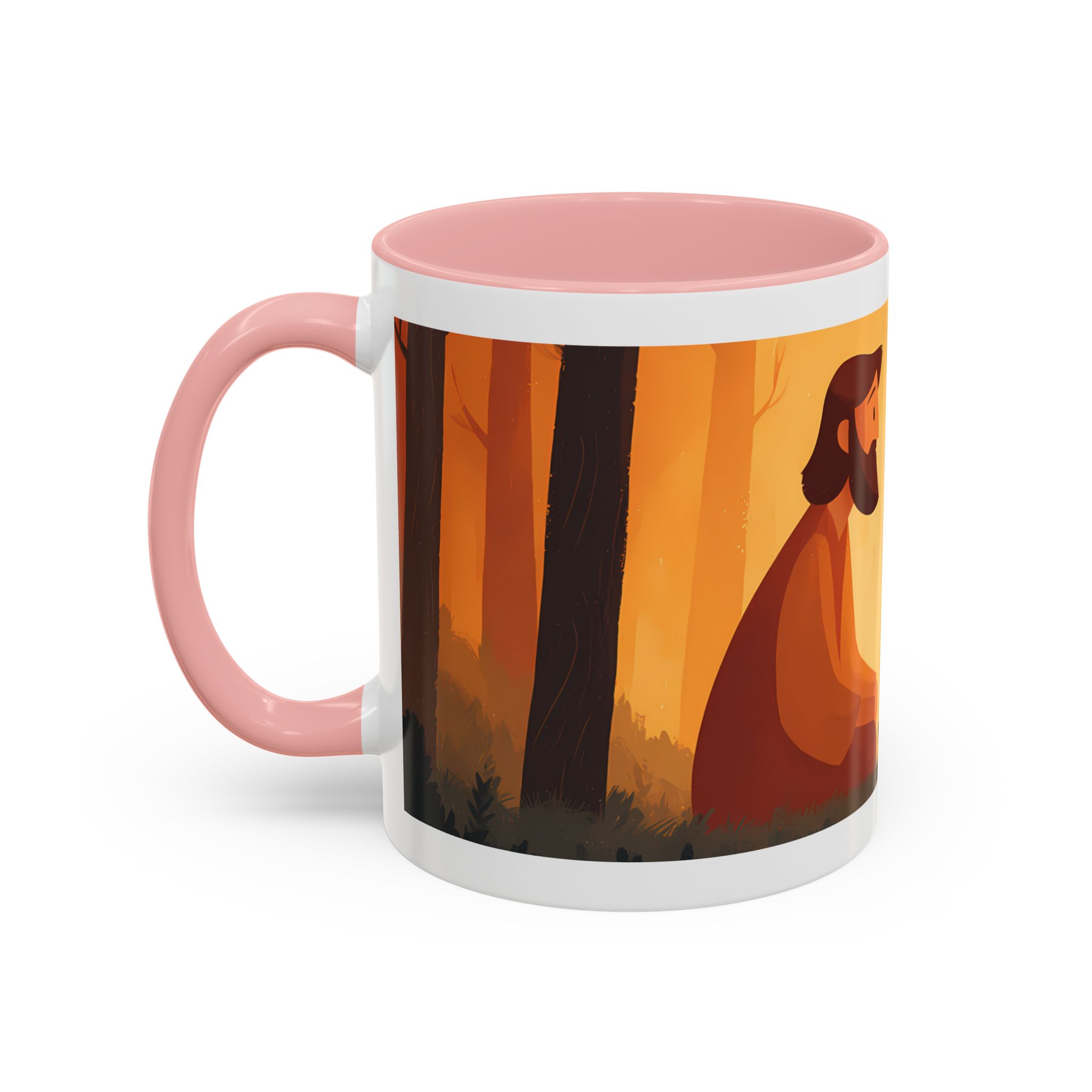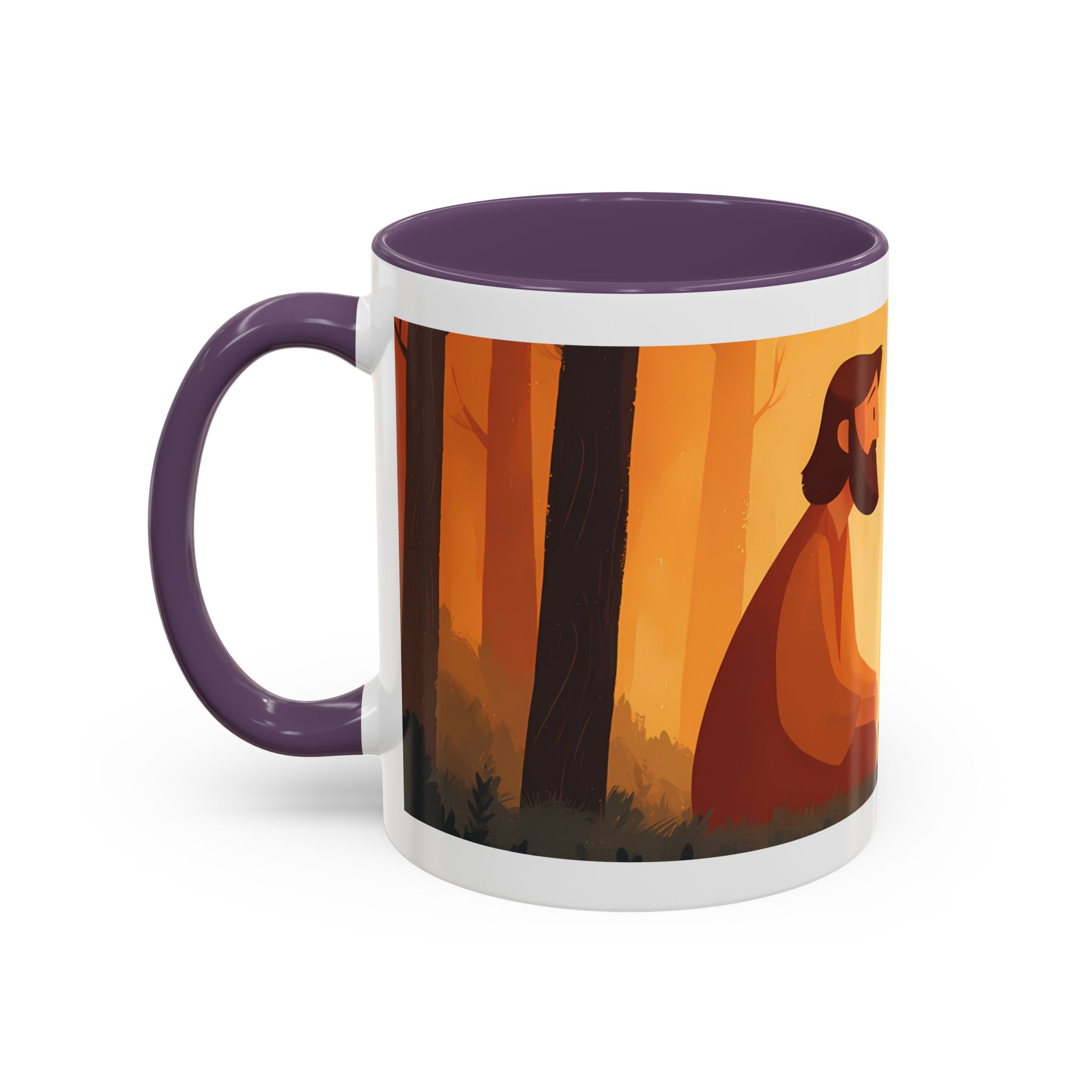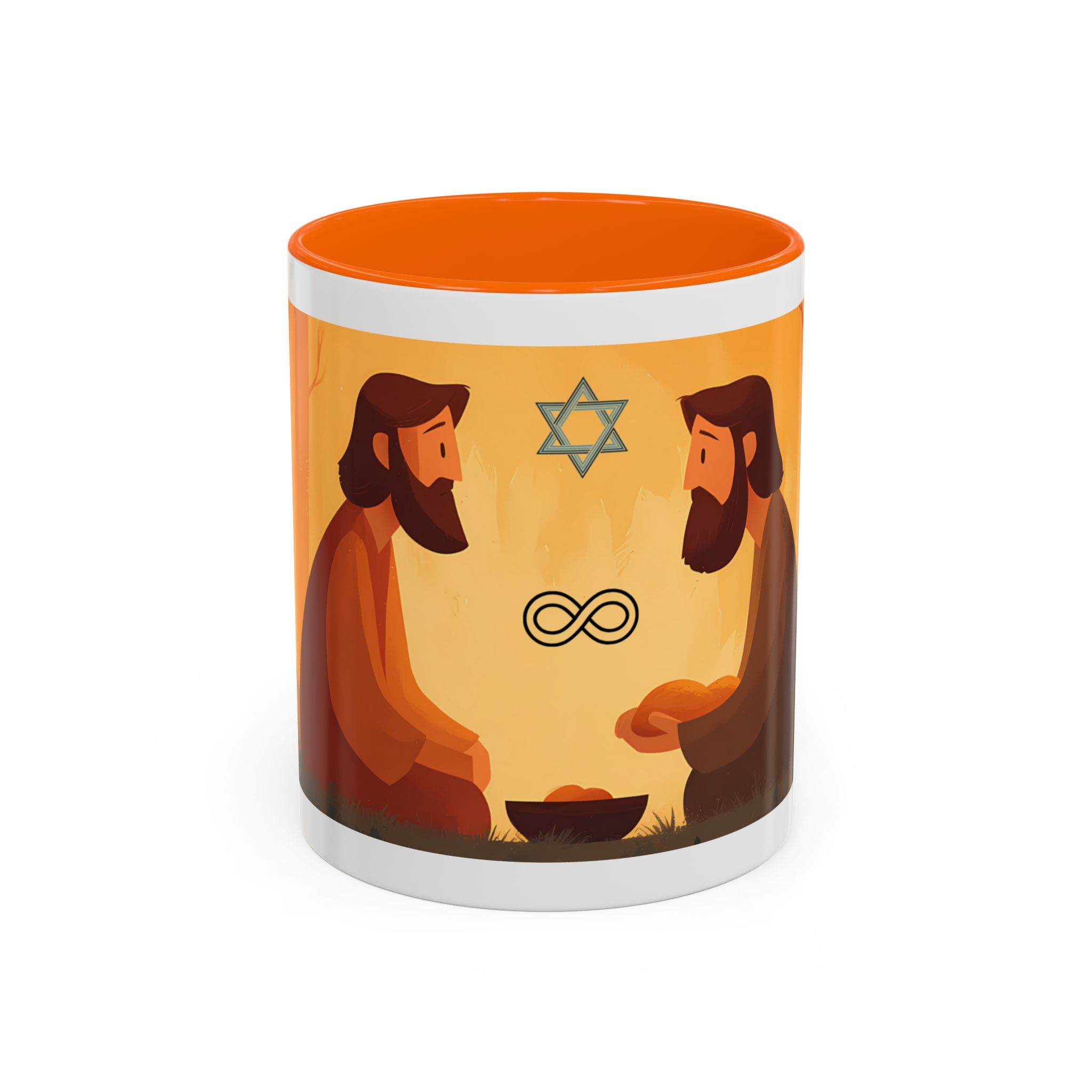 Warm, thoughtful, and quietly spiritual — this ceramic mug brings a gentle scene of two figures sharing a moment in a golden, autumnal light into your daily ritual. The illustrated tableau—soft earth tones, a small fire, and symbolic marks above—feels like a pause between tasks: a breath of reflection with your morning coffee or evening tea. It’s the kind of cup that sits on your desk during study, on the kitchen table during conversation, or quietly beside a book while you think. The colored interior and glossy finish add a lively contrast that makes the illustration sing while remaining calming and intimate.