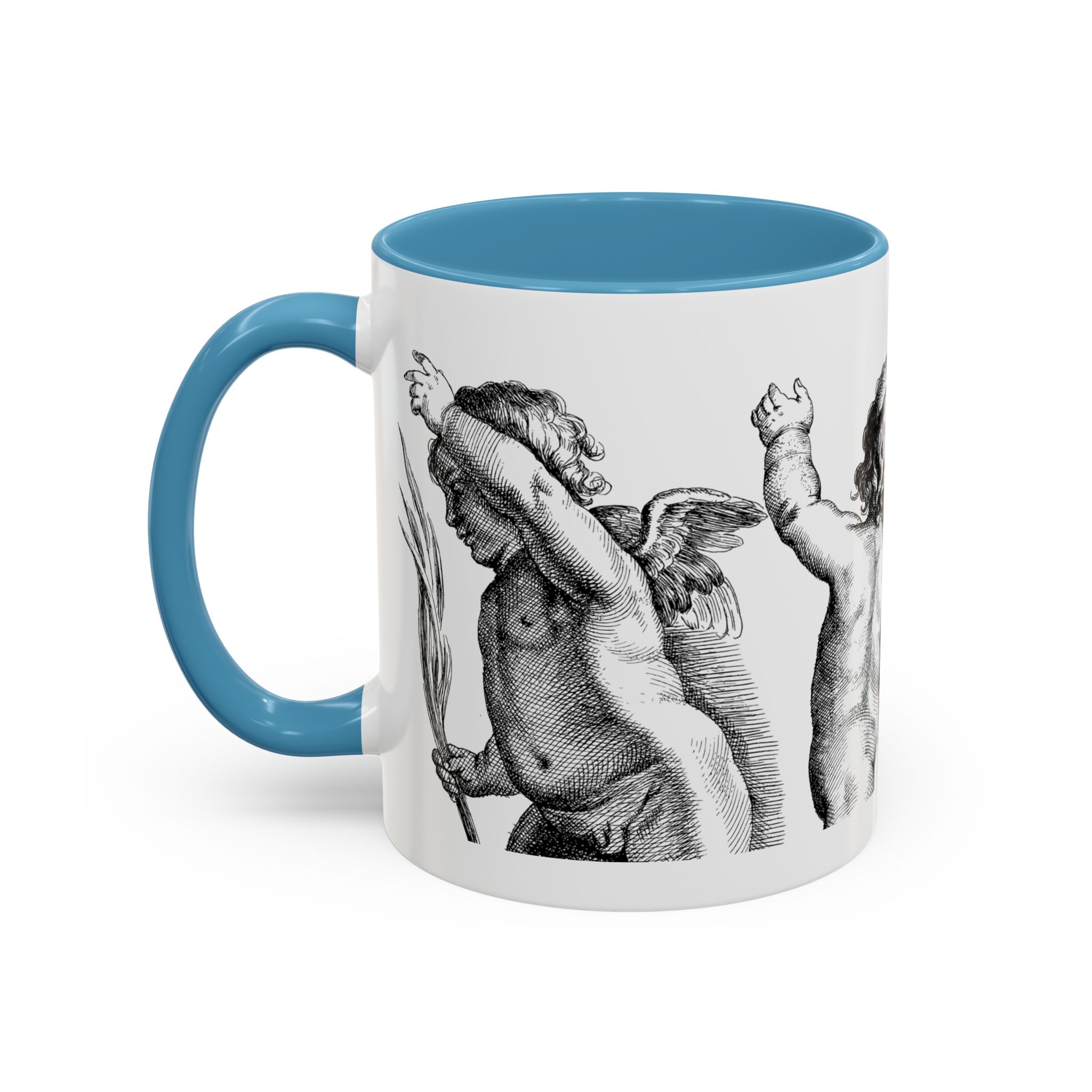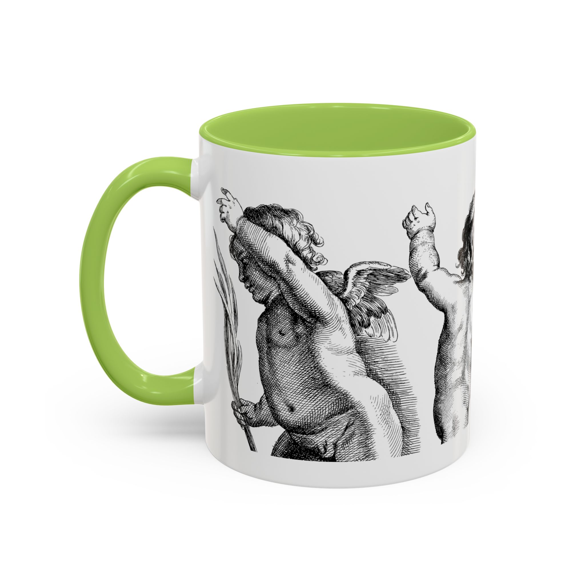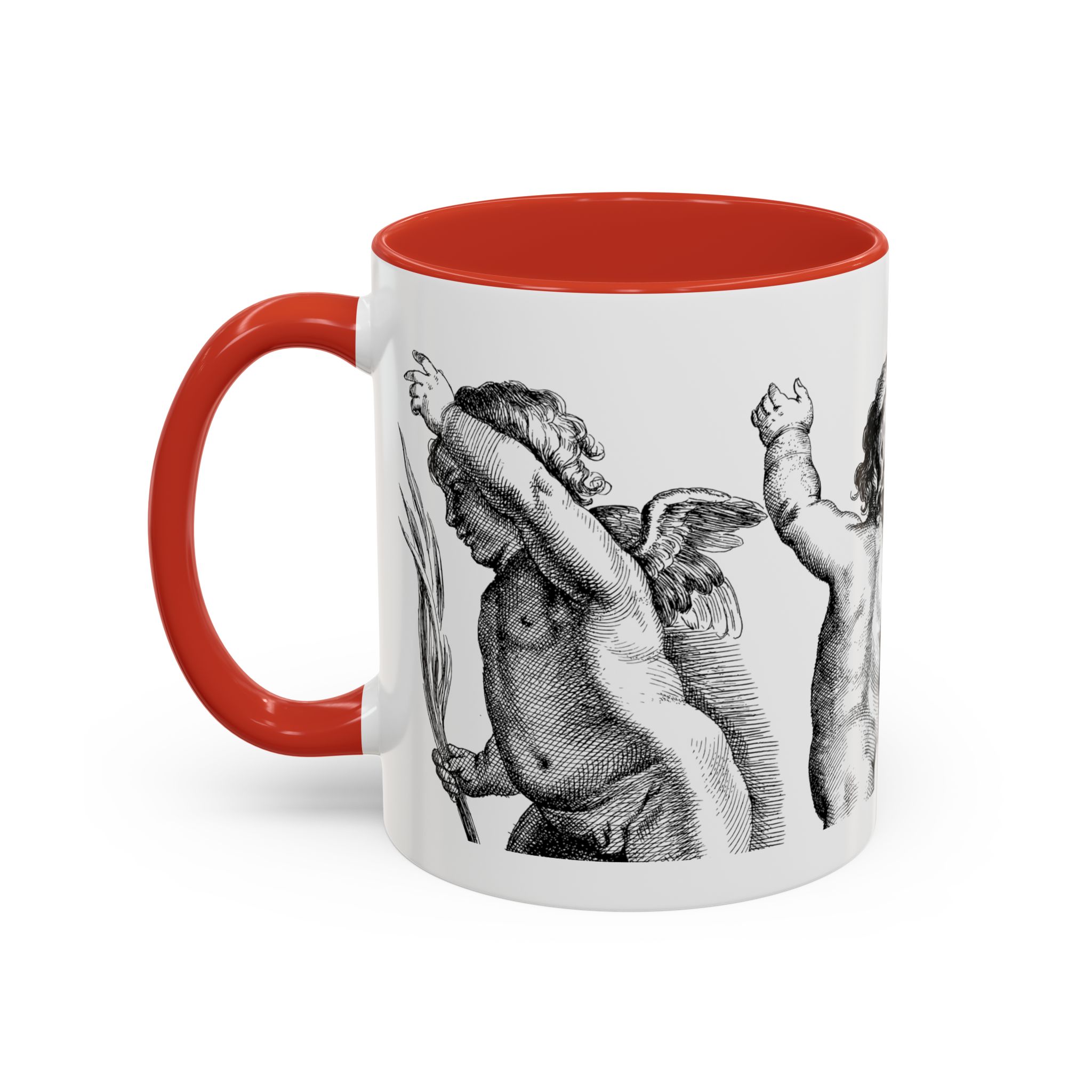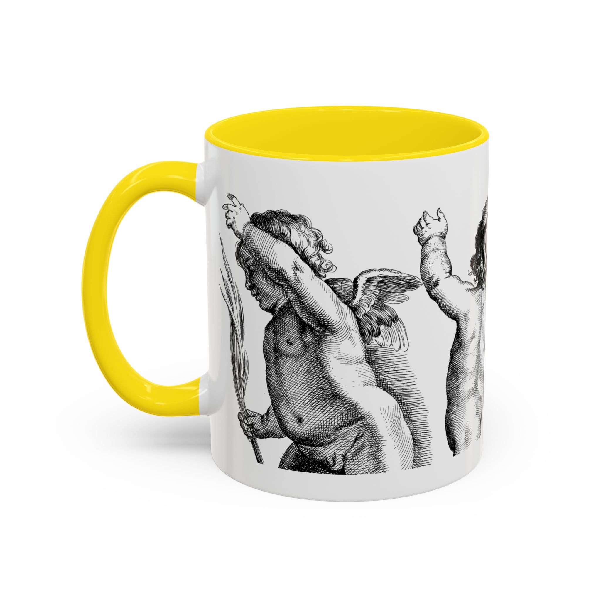 This ceramic accent mug blends classic art with a modern edge, featuring detailed grayscale cherubs paired with bold contrasting lettering. The monochrome artwork is framed by a colored interior and handle, adding a sharp pop of color that elevates each sip. With a glossy finish and comfortable C-shaped handle, this mug works just as well for daily coffee or tea as it does as a stylish display piece on a desk or shelf.