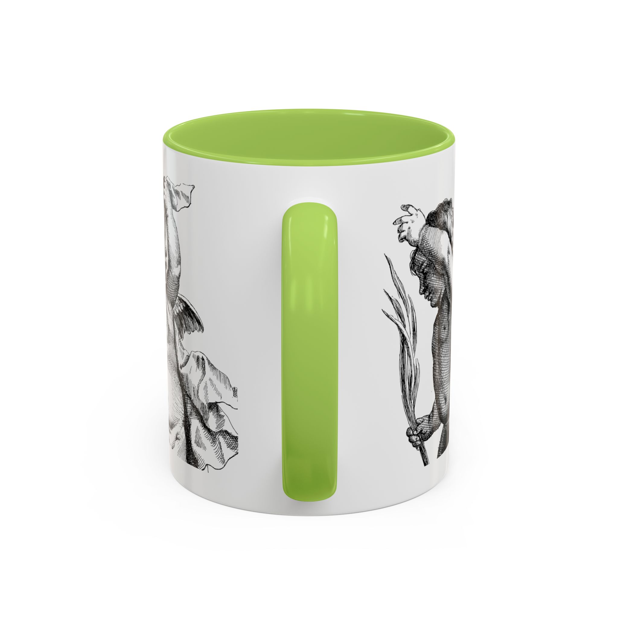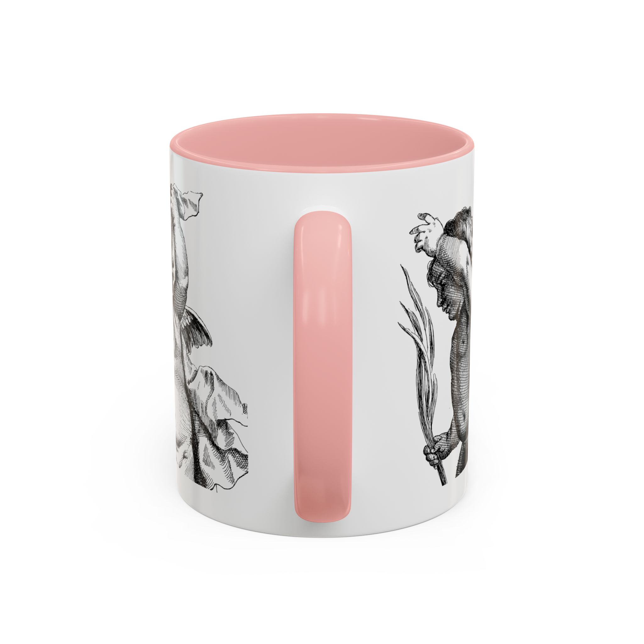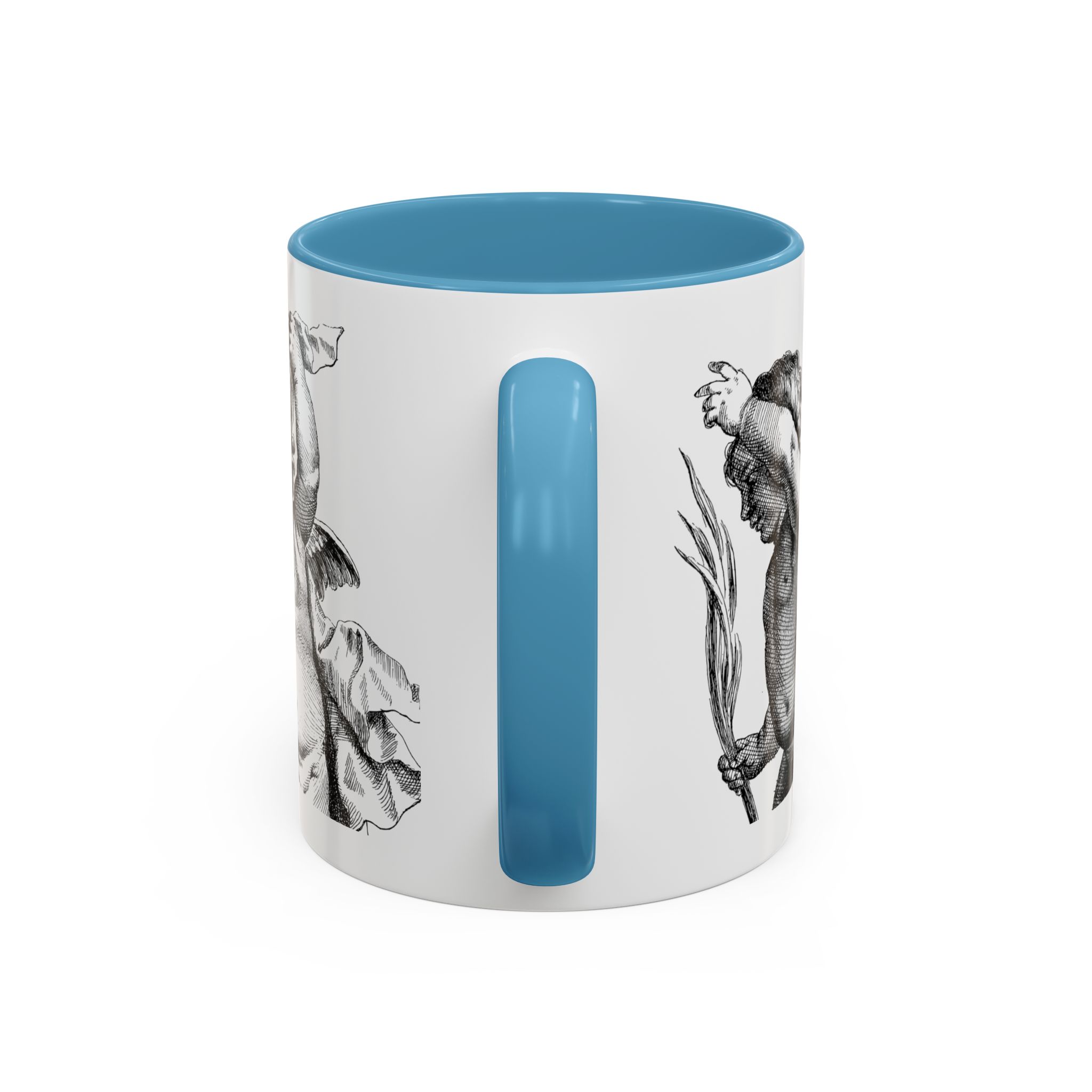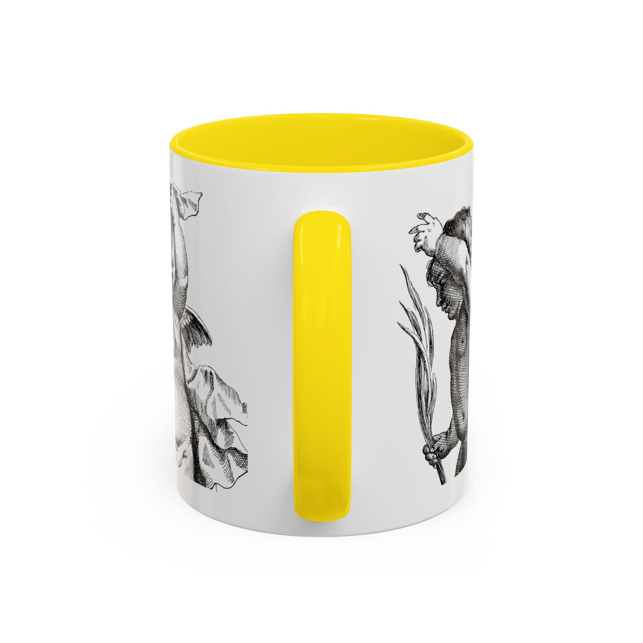 This ceramic accent mug blends classic art with a modern edge, featuring detailed grayscale cherubs paired with bold contrasting lettering. The monochrome artwork is framed by a colored interior and handle, adding a sharp pop of color that elevates each sip. With a glossy finish and comfortable C-shaped handle, this mug works just as well for daily coffee or tea as it does as a stylish display piece on a desk or shelf.