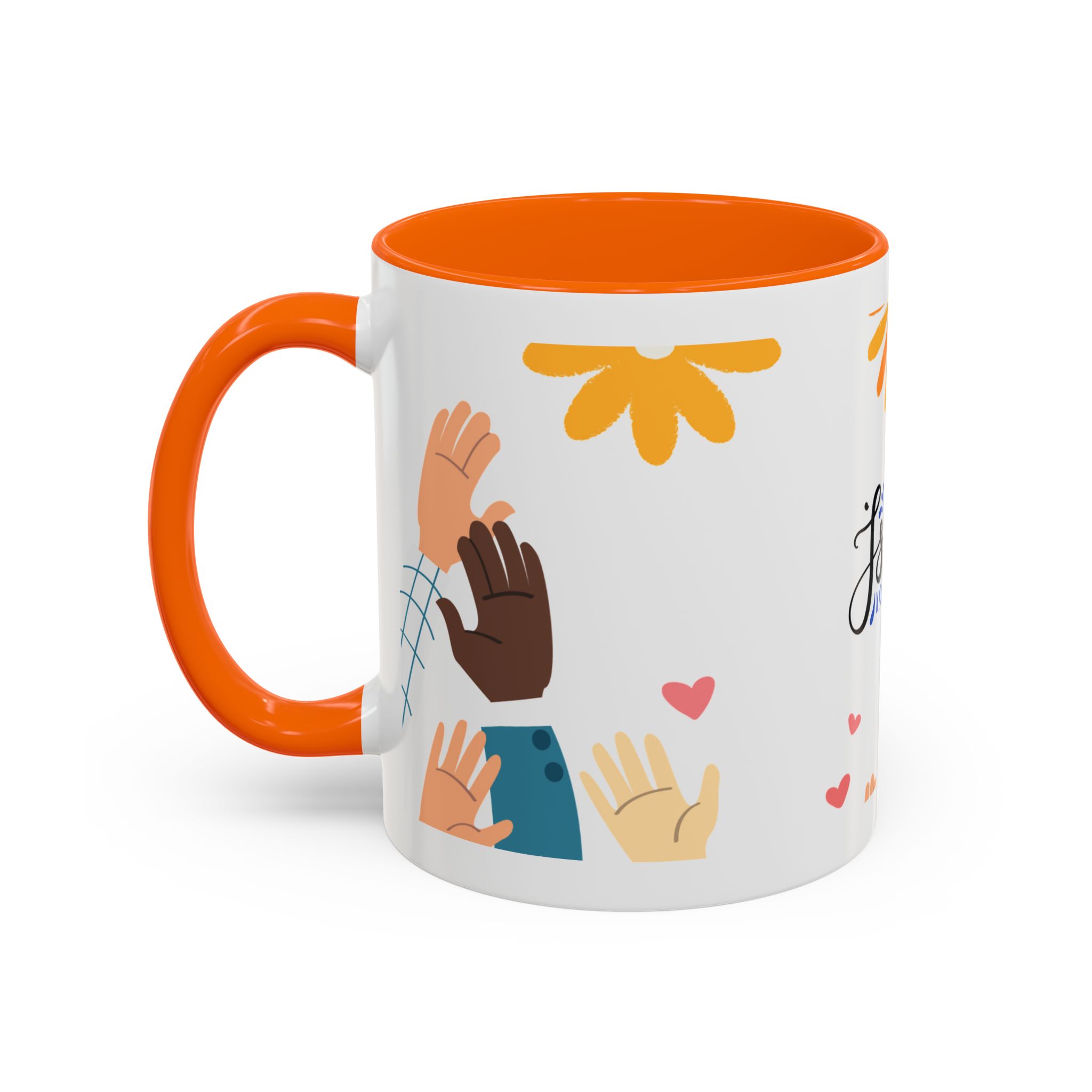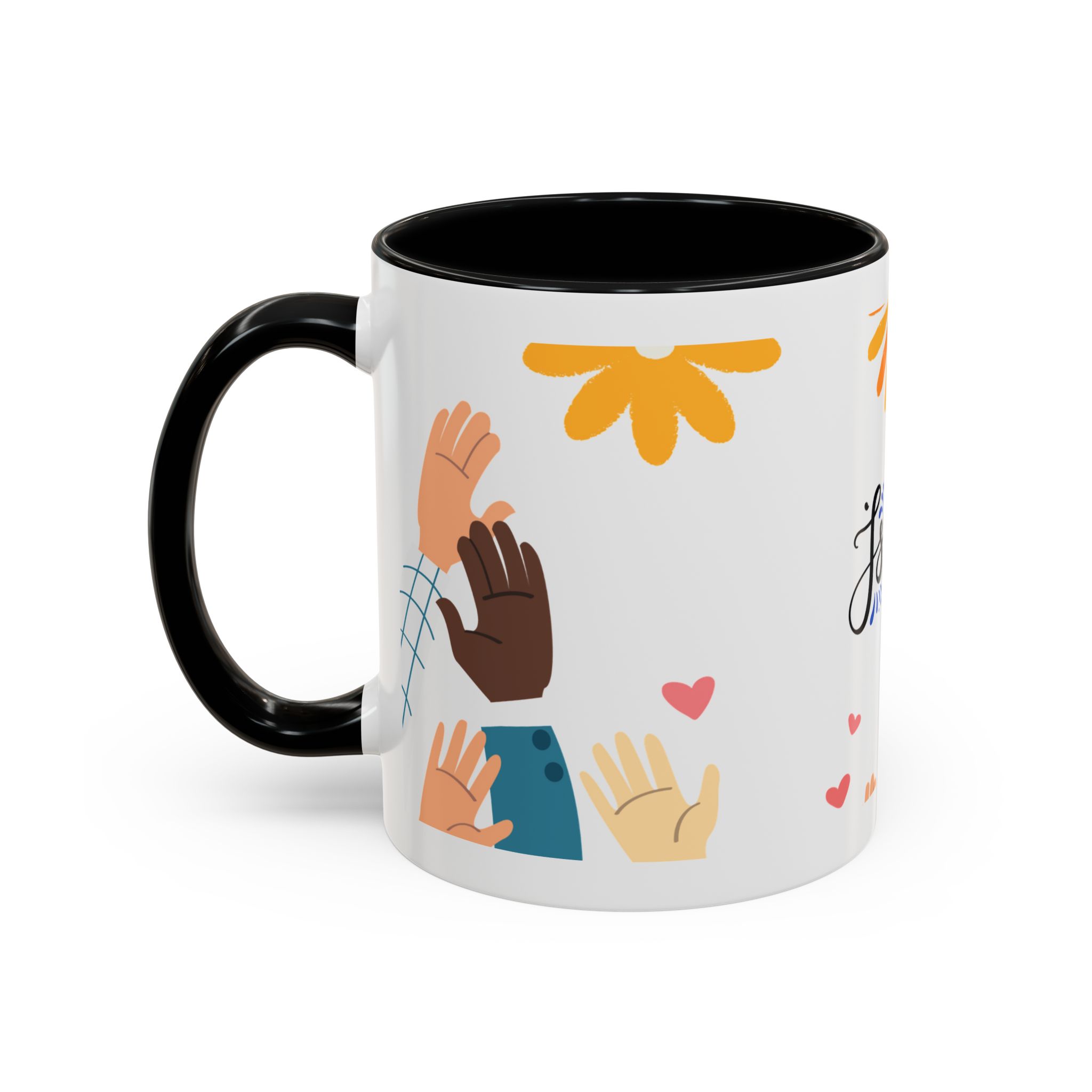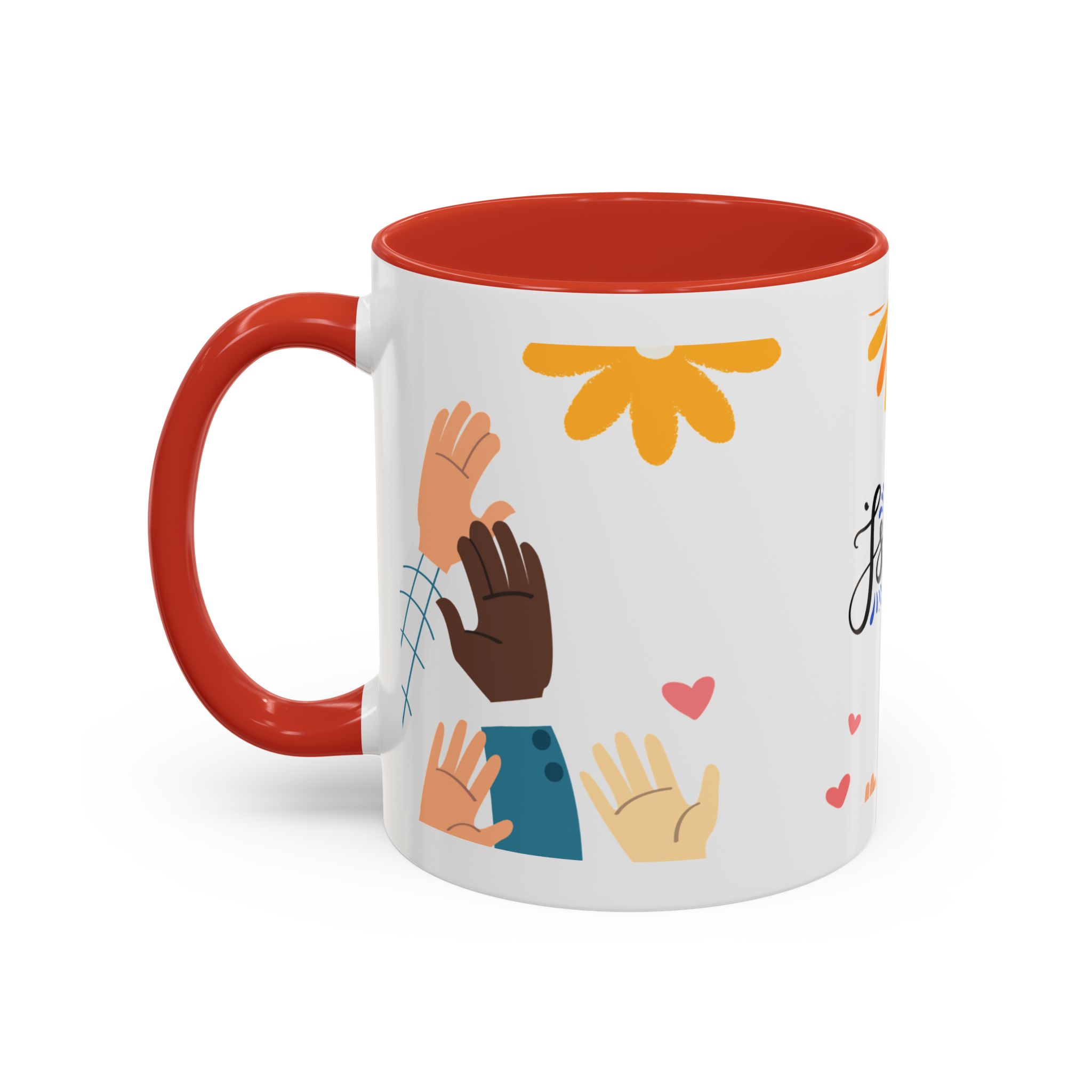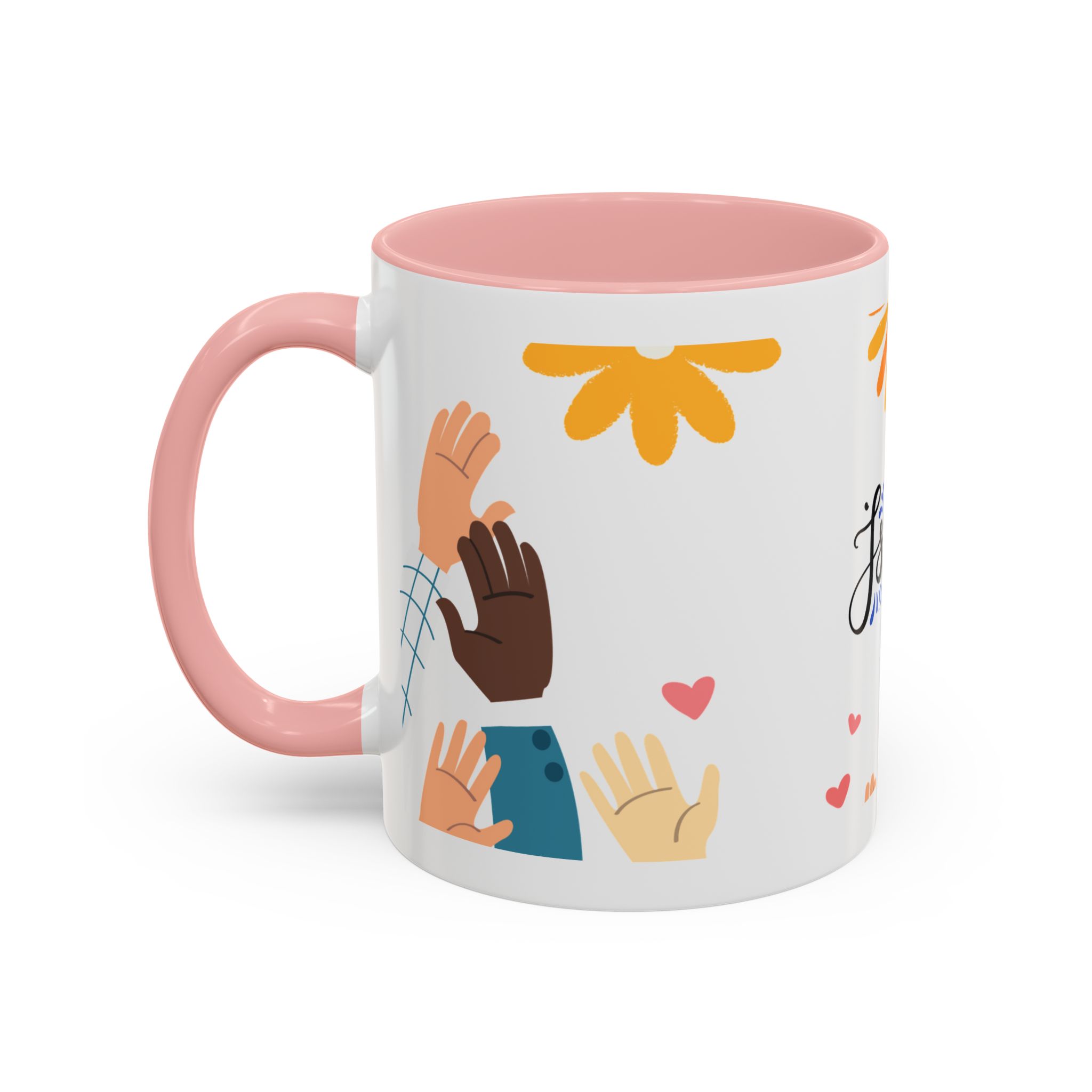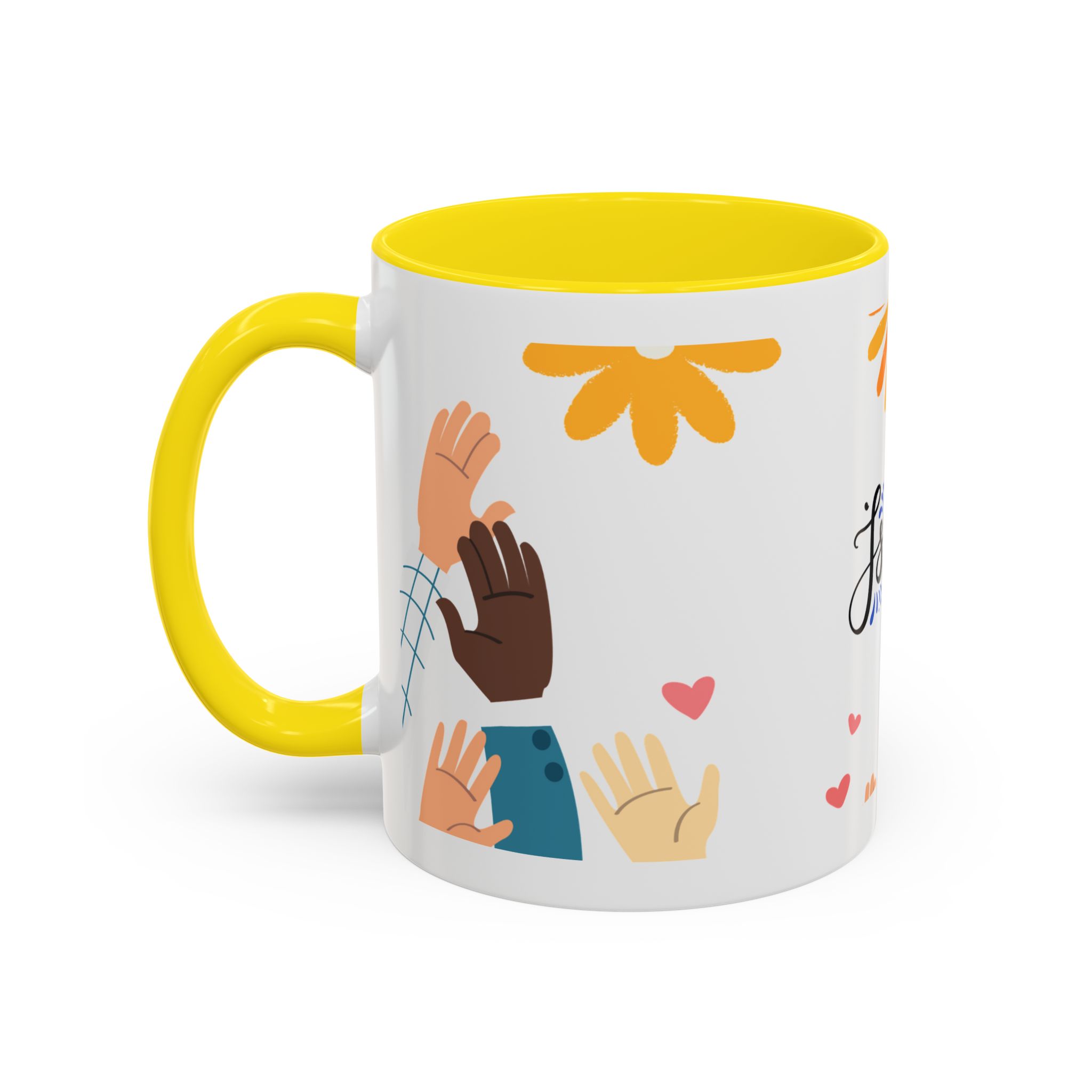 This bright, joyful ceramic mug brings warmth to everyday moments. The glossy white exterior contrasts beautifully with a colored interior and handle, while a playful wraparound design features sunbursts above, tiny hearts, and raised hands in diverse skin tones surrounding a cheerful hand-lettered word. Sip slowly and feel the friendly, hopeful vibe—this mug turns a simple coffee break into a small celebration shared across mornings, meetings, and quiet afternoons.