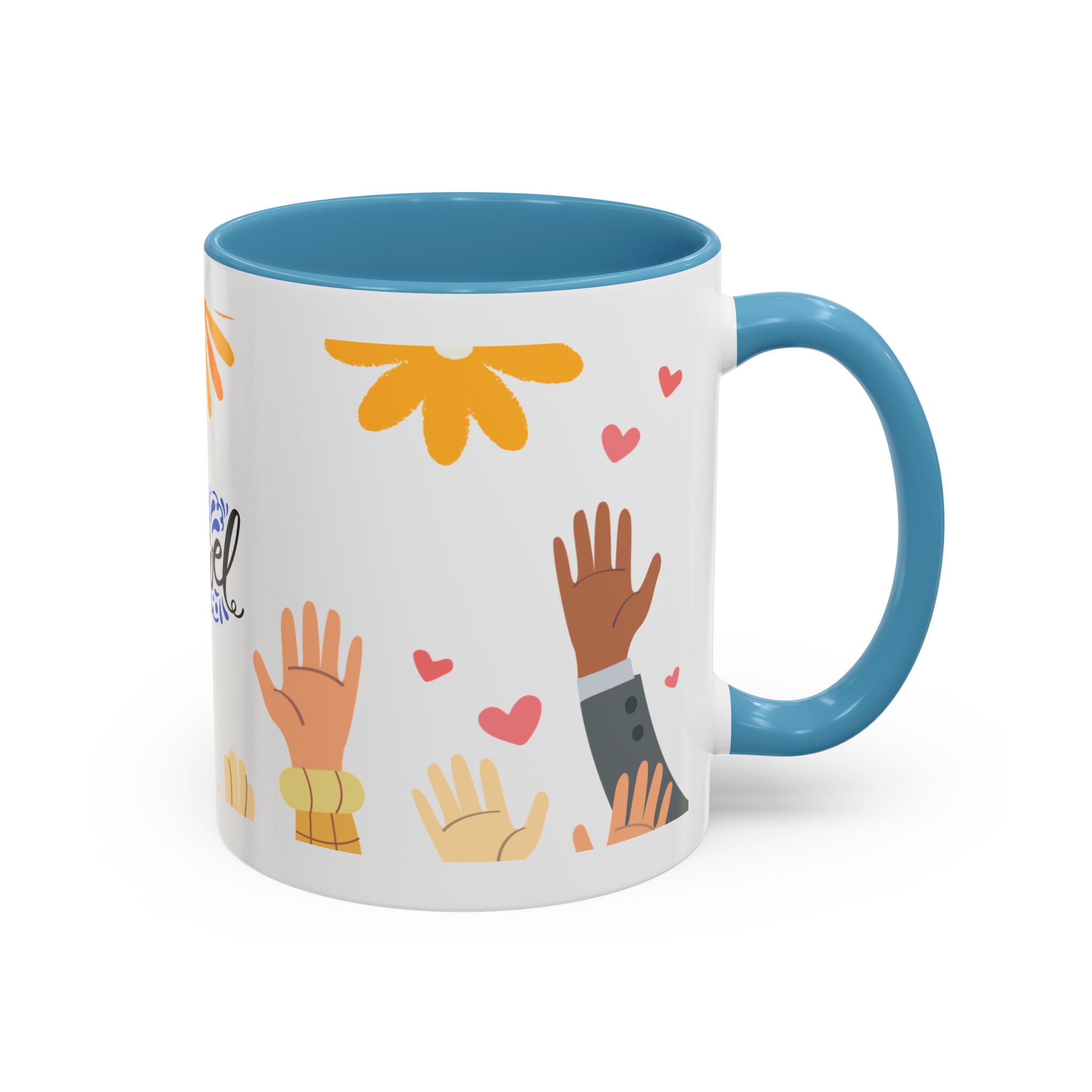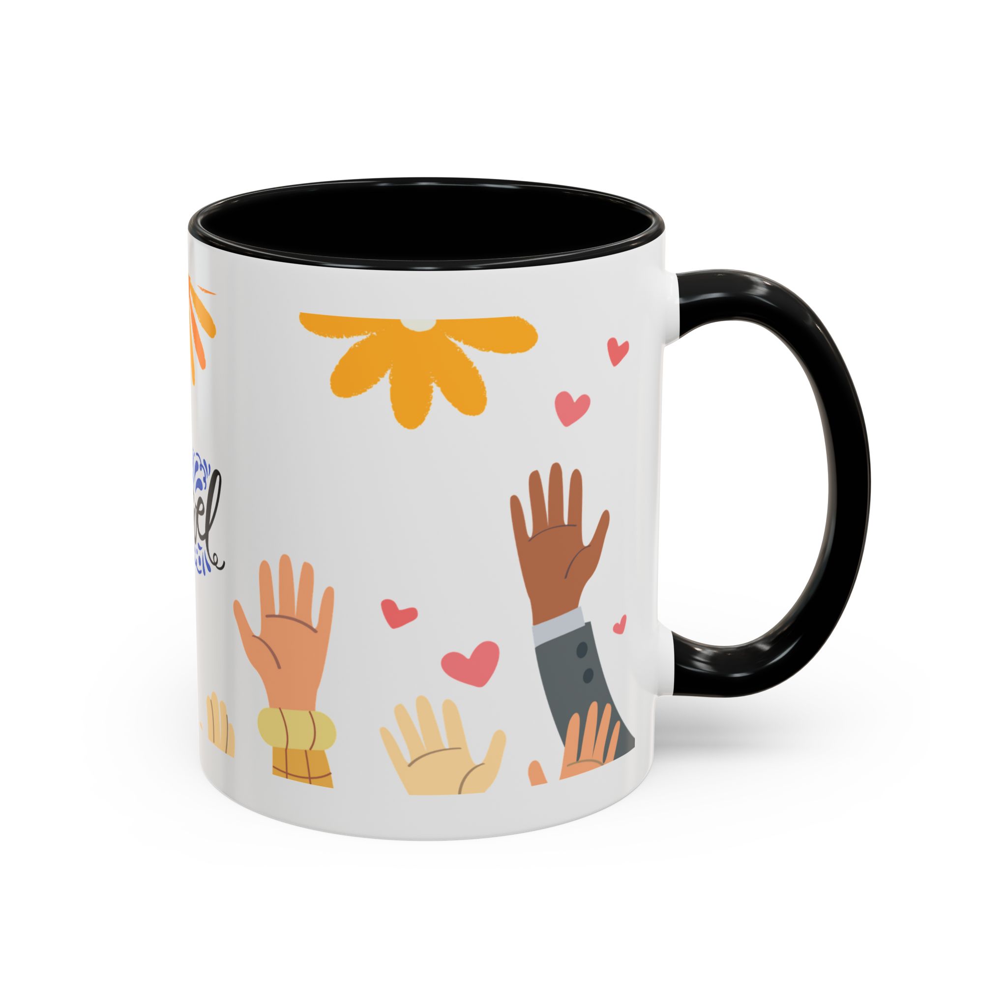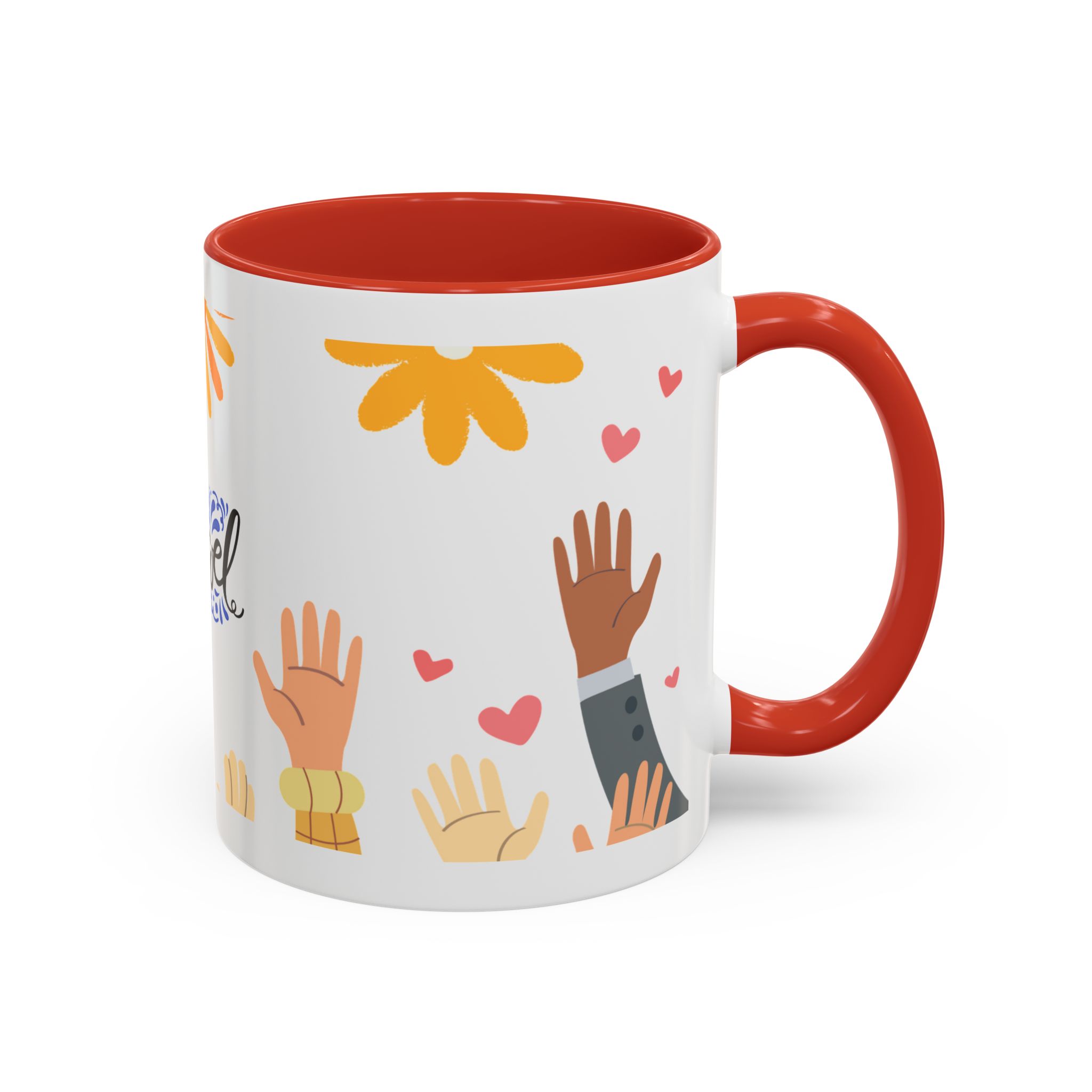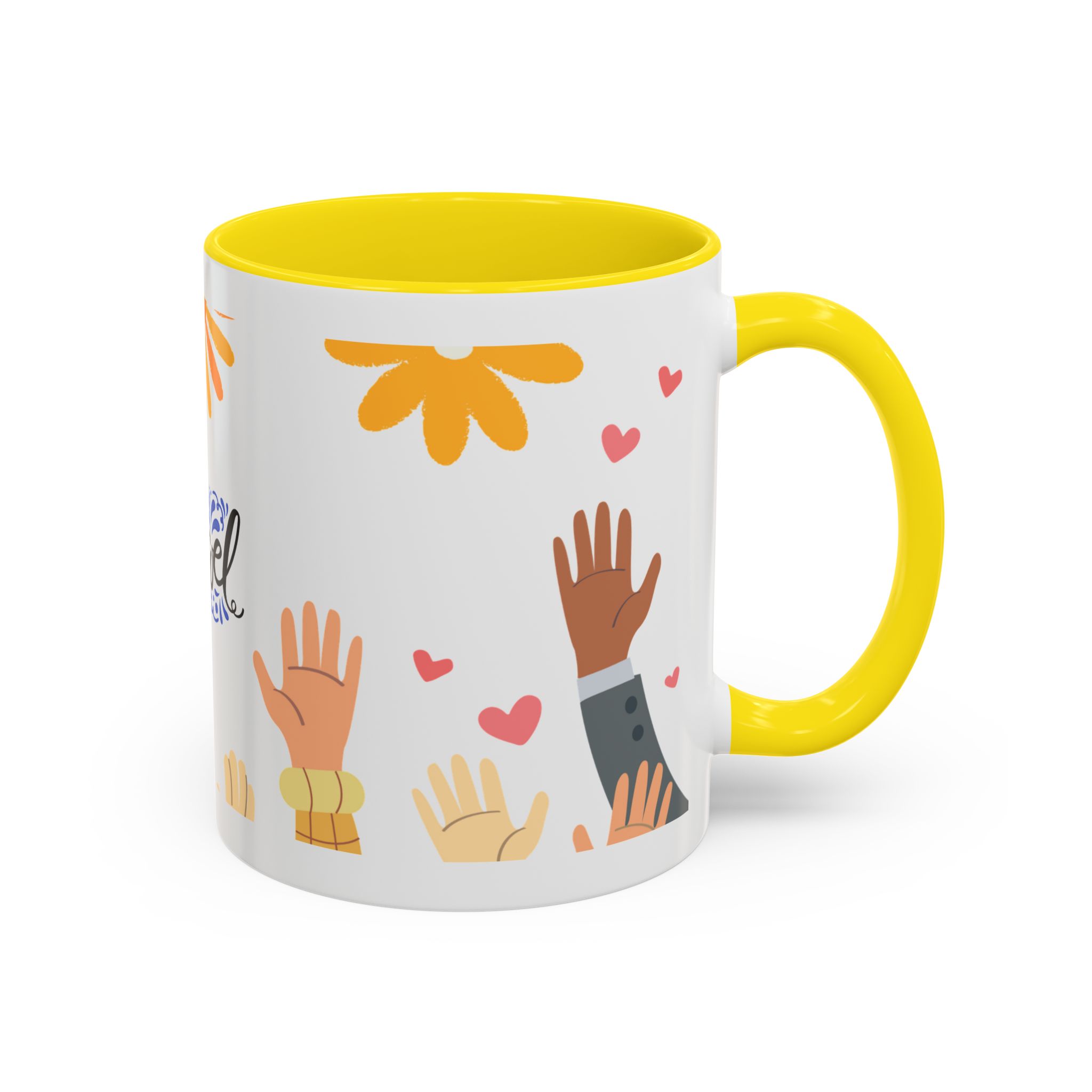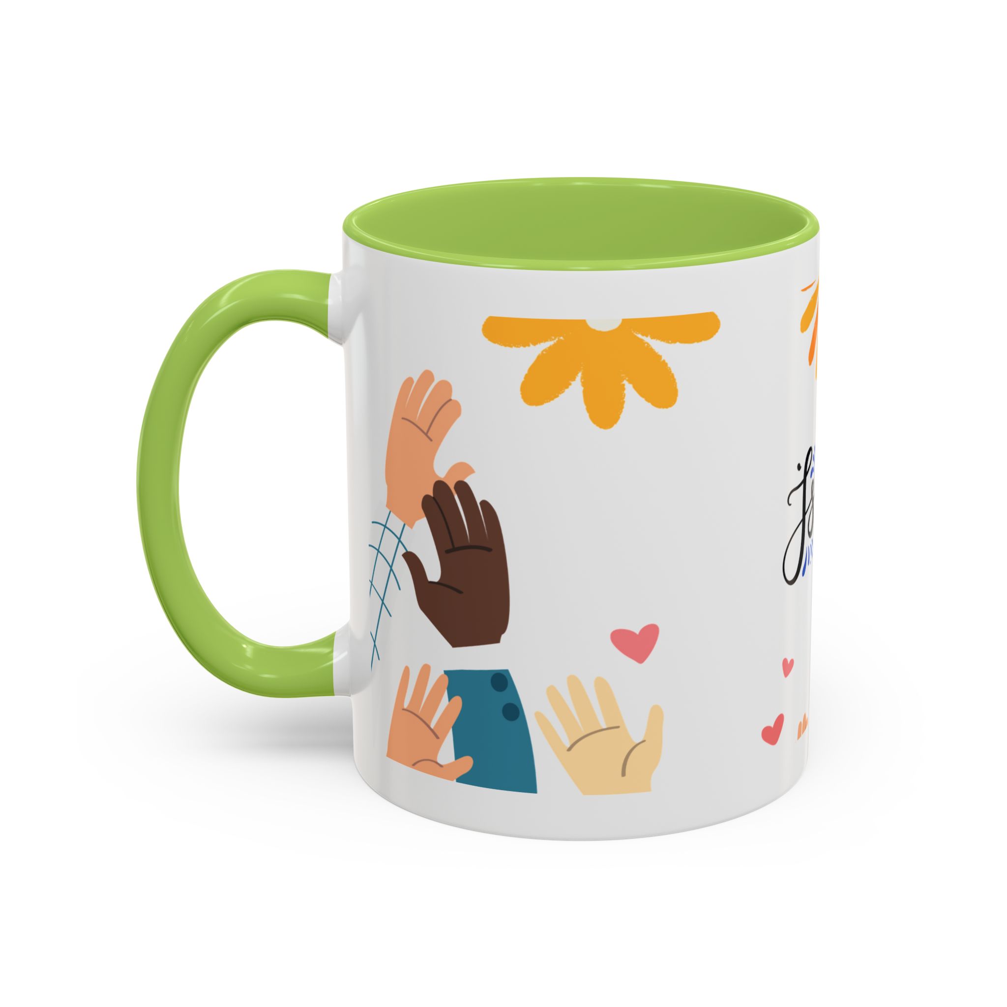 This bright, joyful ceramic mug brings warmth to everyday moments. The glossy white exterior contrasts beautifully with a colored interior and handle, while a playful wraparound design features sunbursts above, tiny hearts, and raised hands in diverse skin tones surrounding a cheerful hand-lettered word. Sip slowly and feel the friendly, hopeful vibe—this mug turns a simple coffee break into a small celebration shared across mornings, meetings, and quiet afternoons.