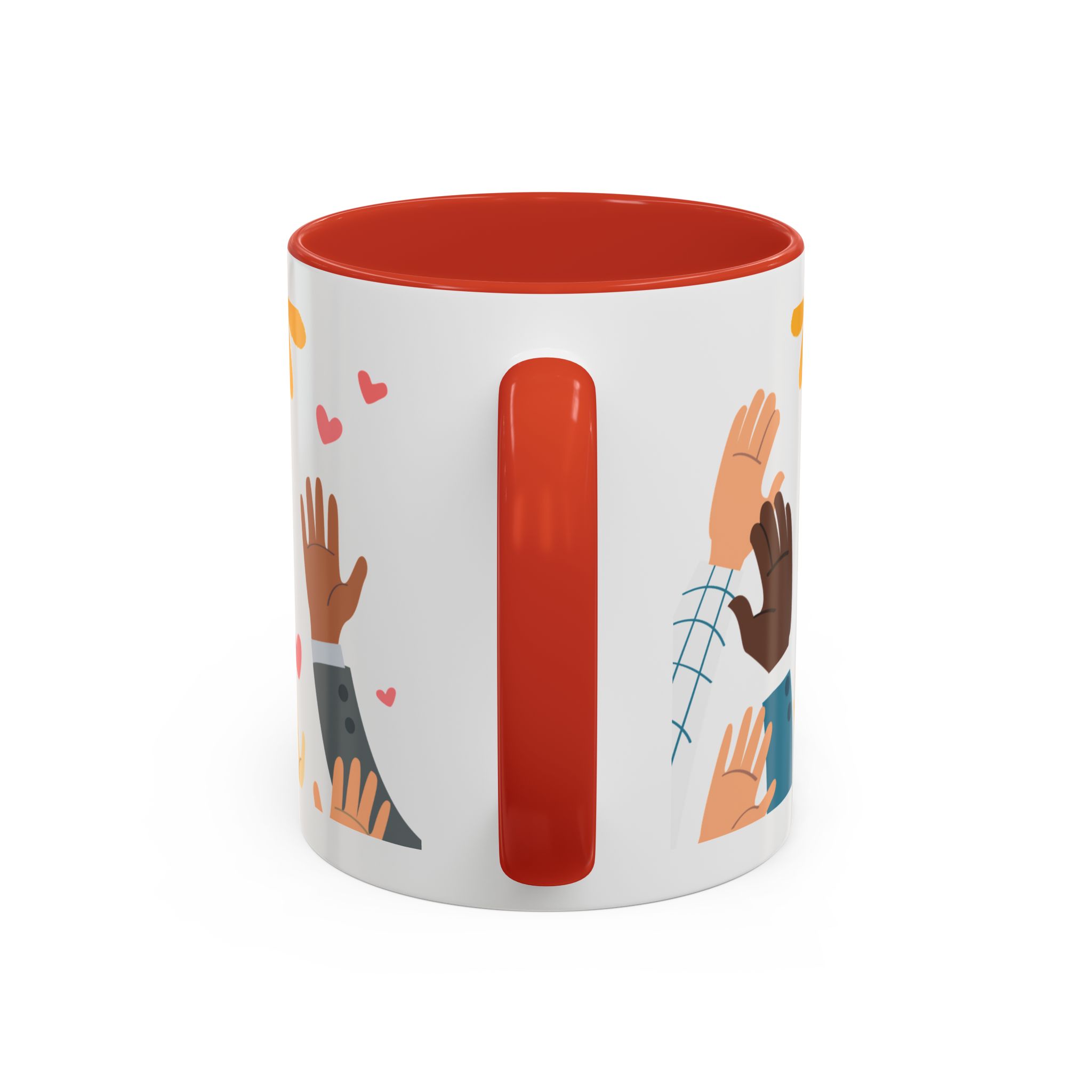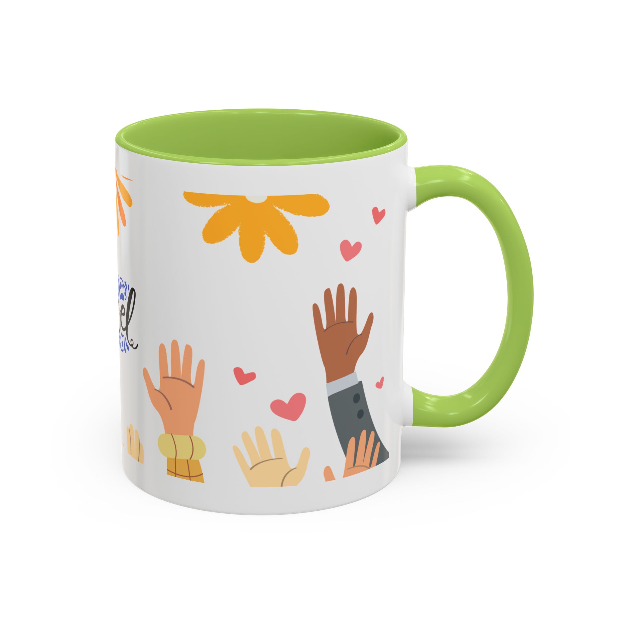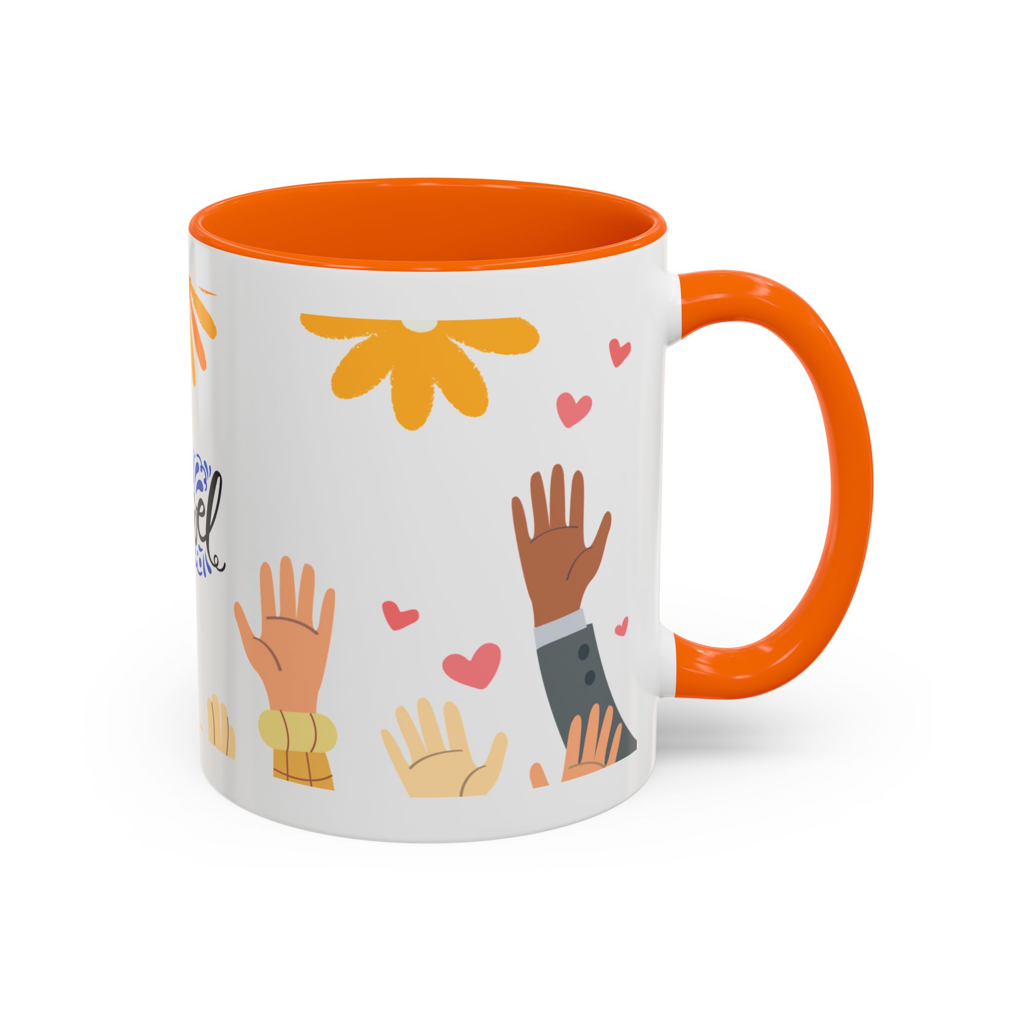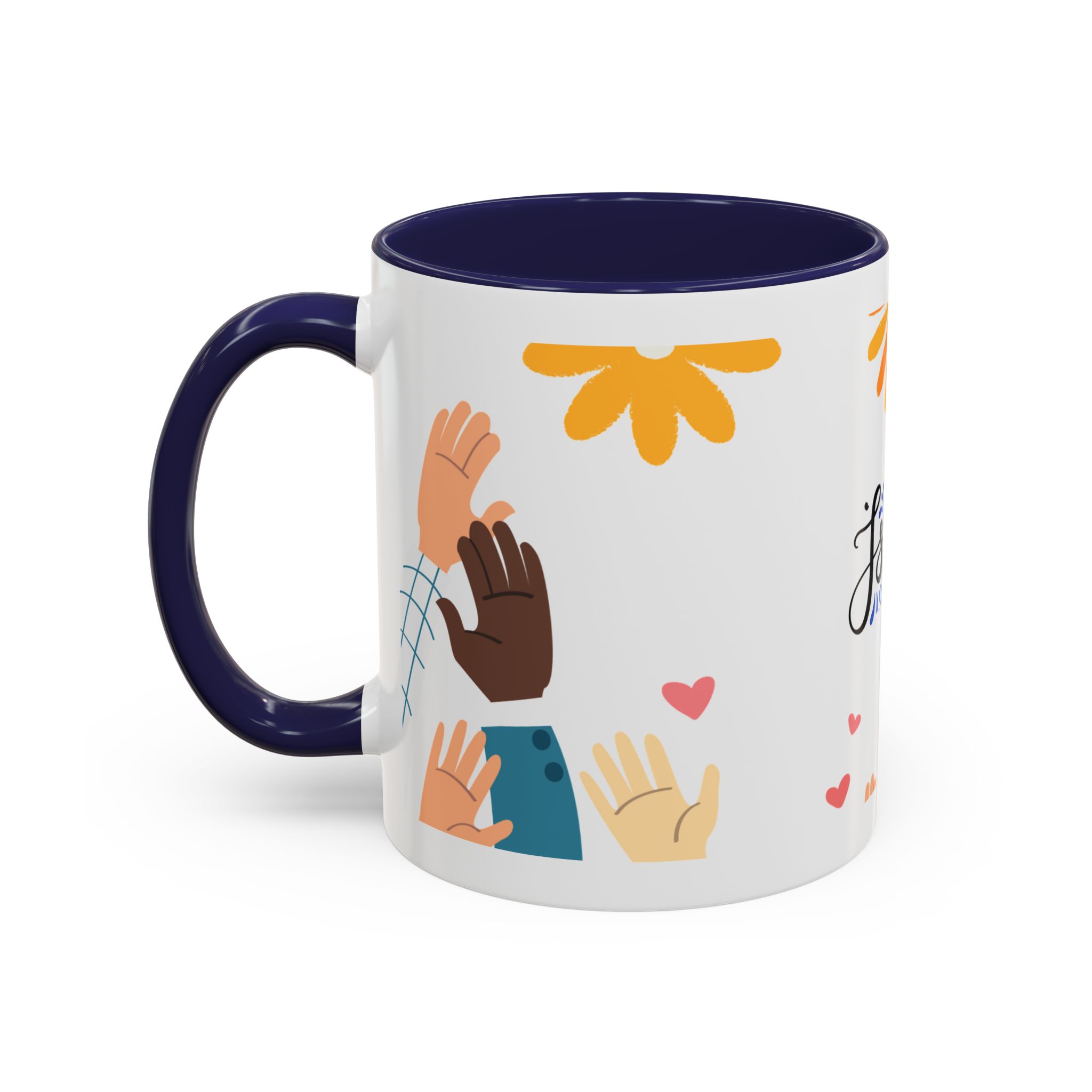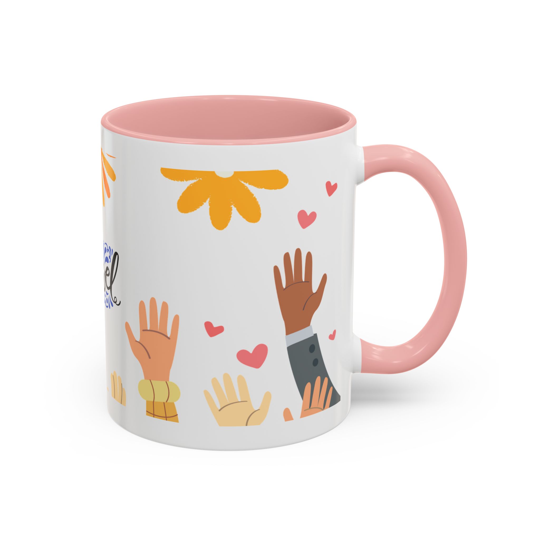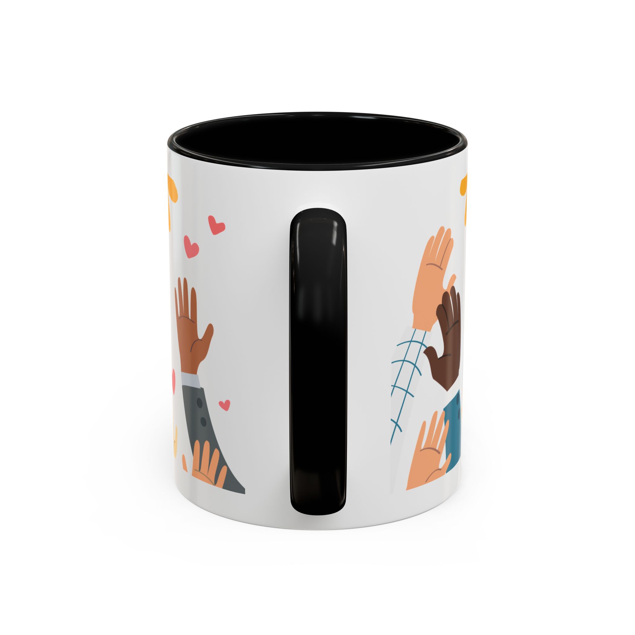 This bright, joyful ceramic mug brings warmth to everyday moments. The glossy white exterior contrasts beautifully with a colored interior and handle, while a playful wraparound design features sunbursts above, tiny hearts, and raised hands in diverse skin tones surrounding a cheerful hand-lettered word. Sip slowly and feel the friendly, hopeful vibe—this mug turns a simple coffee break into a small celebration shared across mornings, meetings, and quiet afternoons.