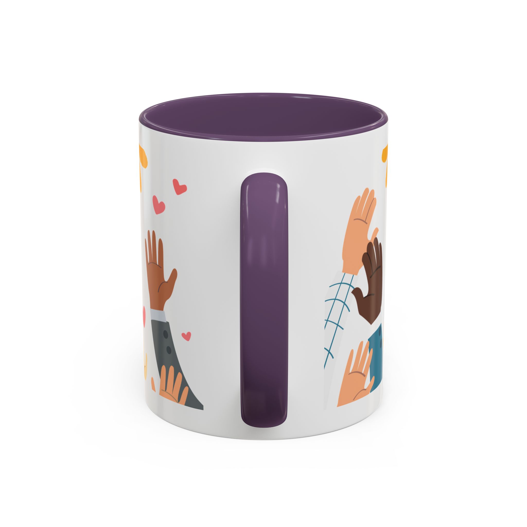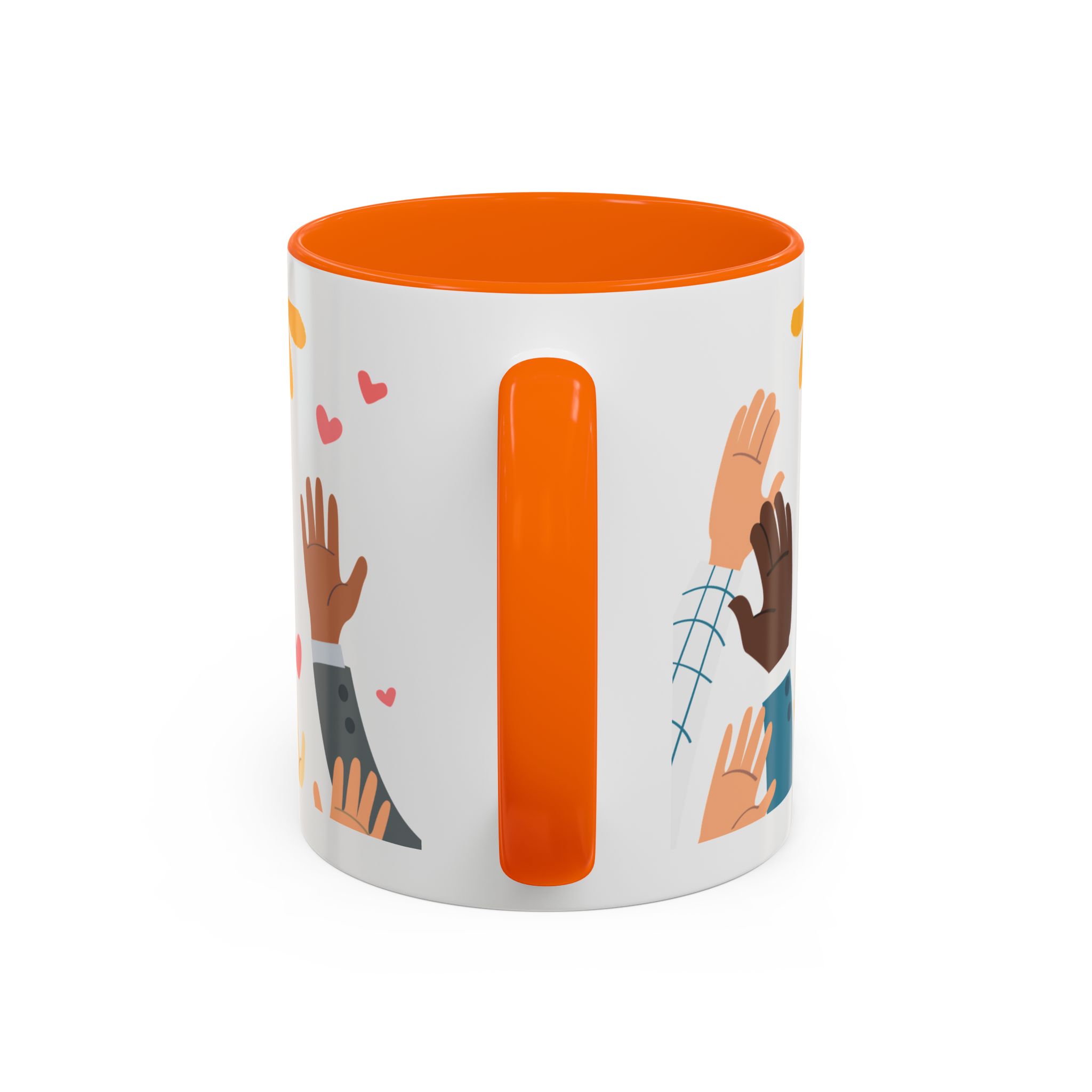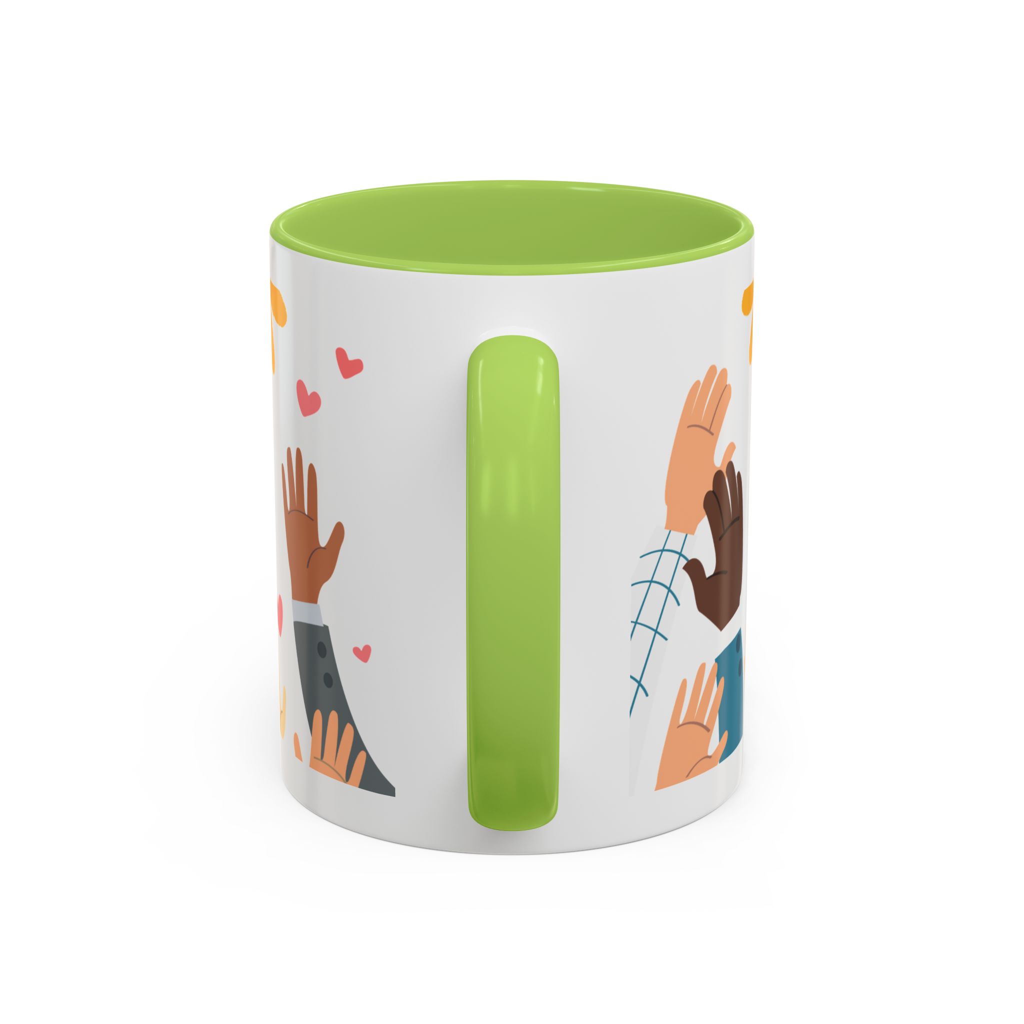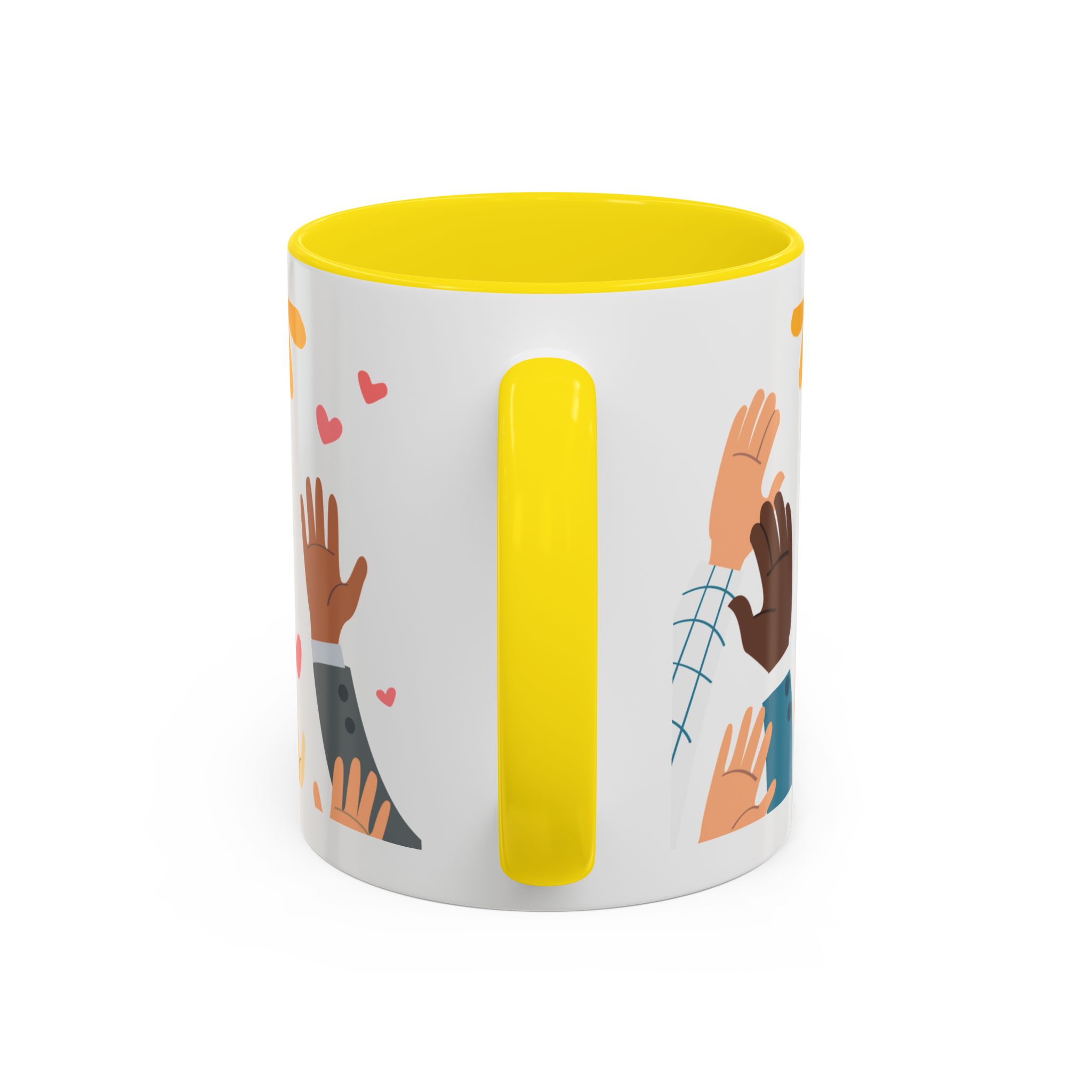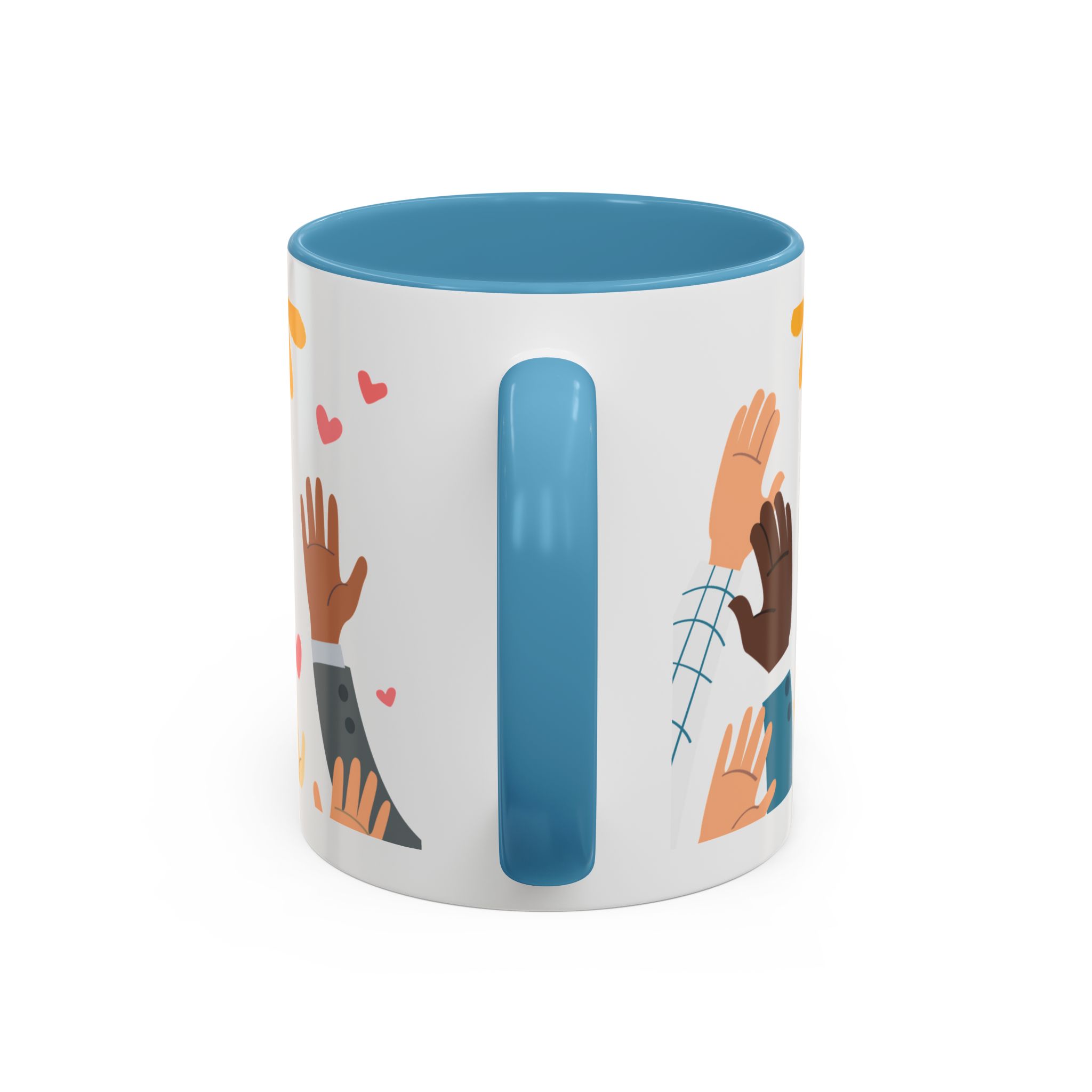This bright, joyful ceramic mug brings warmth to everyday moments. The glossy white exterior contrasts beautifully with a colored interior and handle, while a playful wraparound design features sunbursts above, tiny hearts, and raised hands in diverse skin tones surrounding a cheerful hand-lettered word. Sip slowly and feel the friendly, hopeful vibe—this mug turns a simple coffee break into a small celebration shared across mornings, meetings, and quiet afternoons.