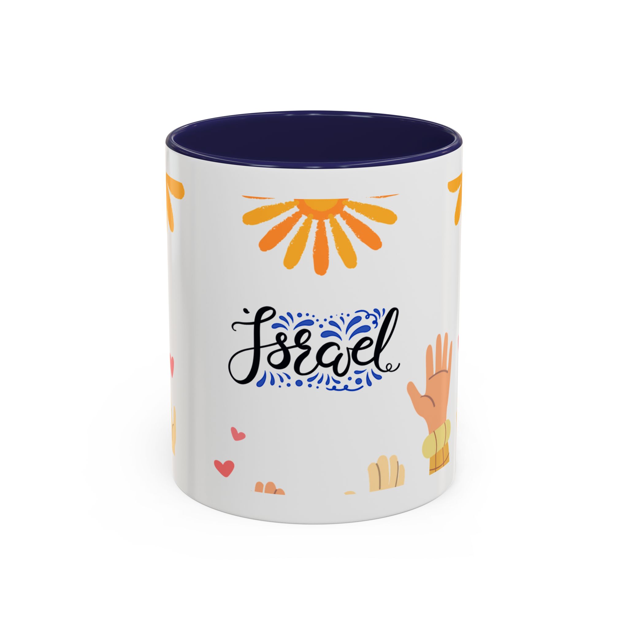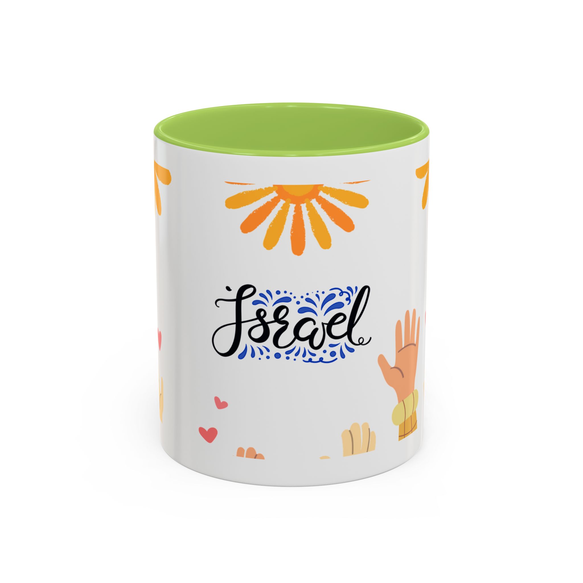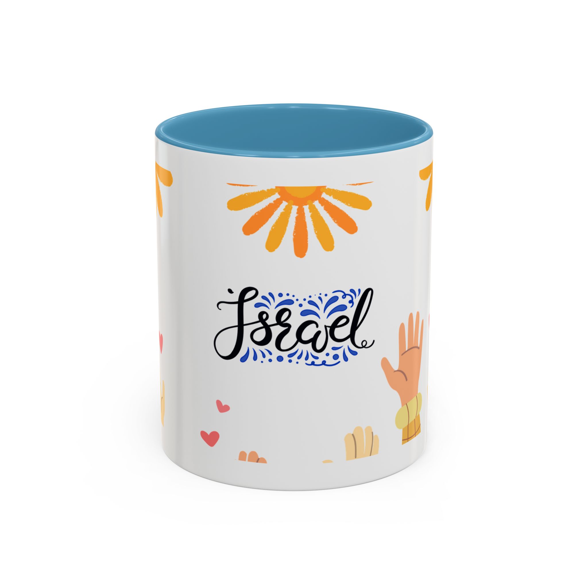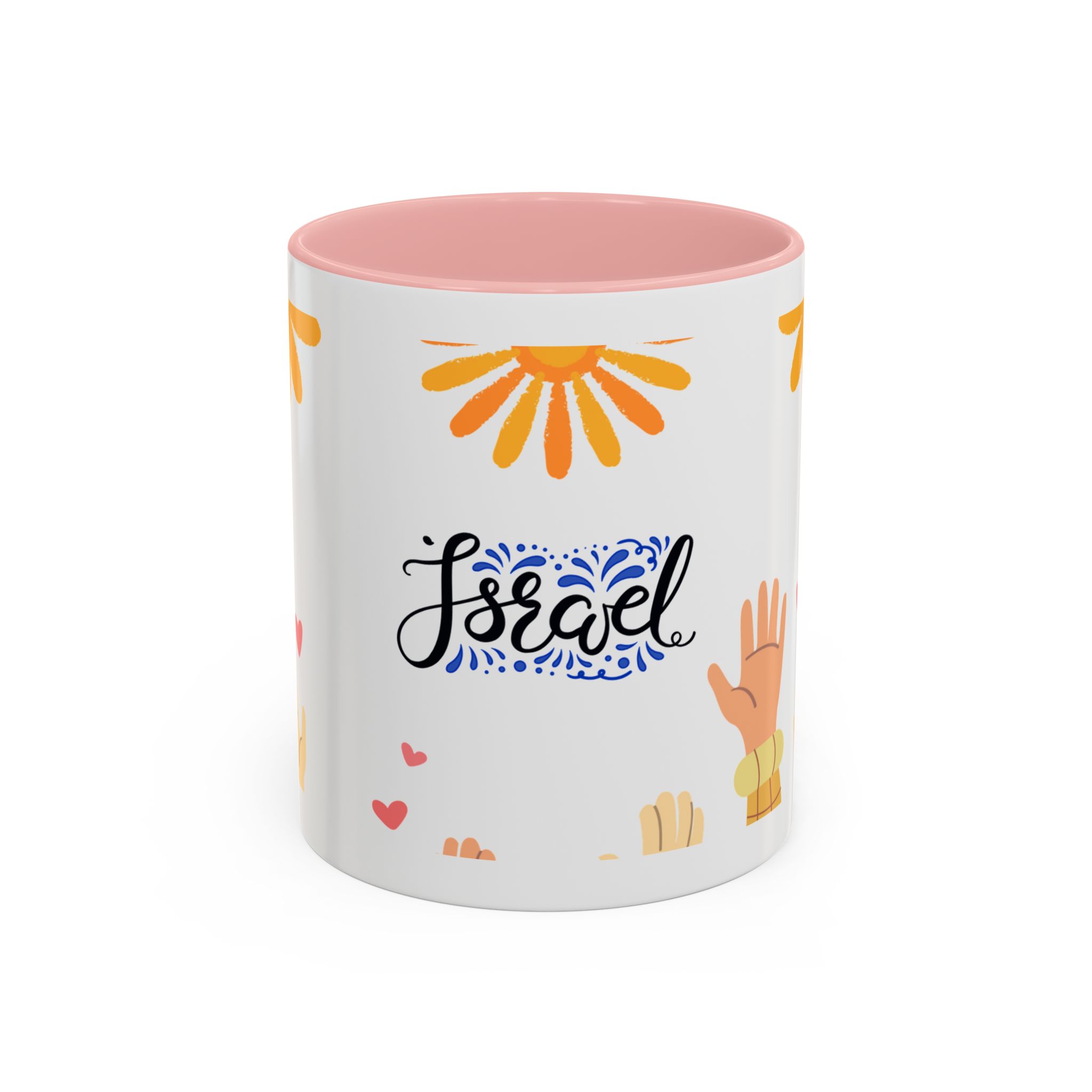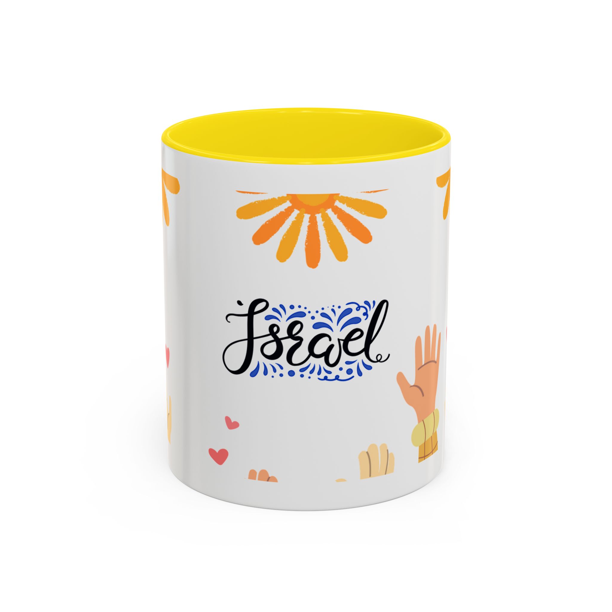 This bright, joyful ceramic mug brings warmth to everyday moments. The glossy white exterior contrasts beautifully with a colored interior and handle, while a playful wraparound design features sunbursts above, tiny hearts, and raised hands in diverse skin tones surrounding a cheerful hand-lettered word. Sip slowly and feel the friendly, hopeful vibe—this mug turns a simple coffee break into a small celebration shared across mornings, meetings, and quiet afternoons.