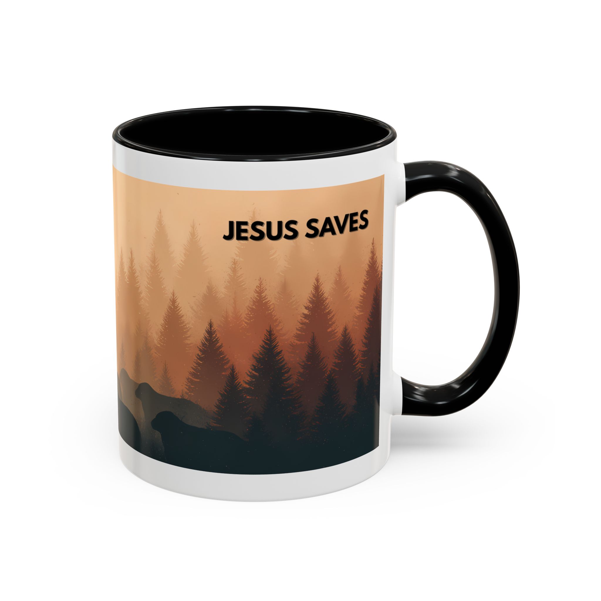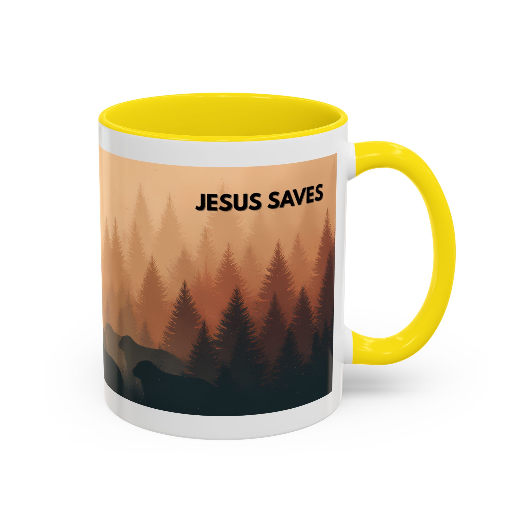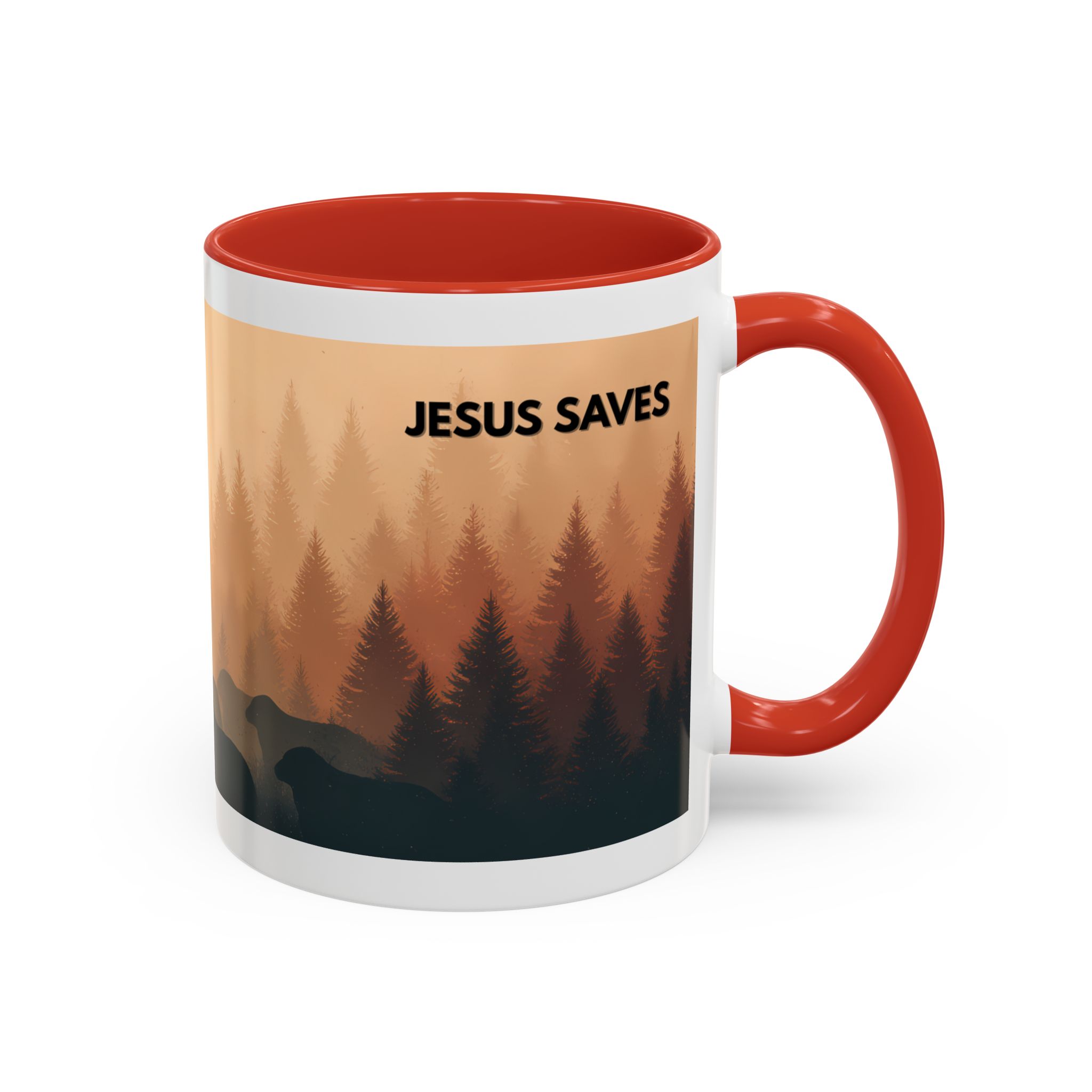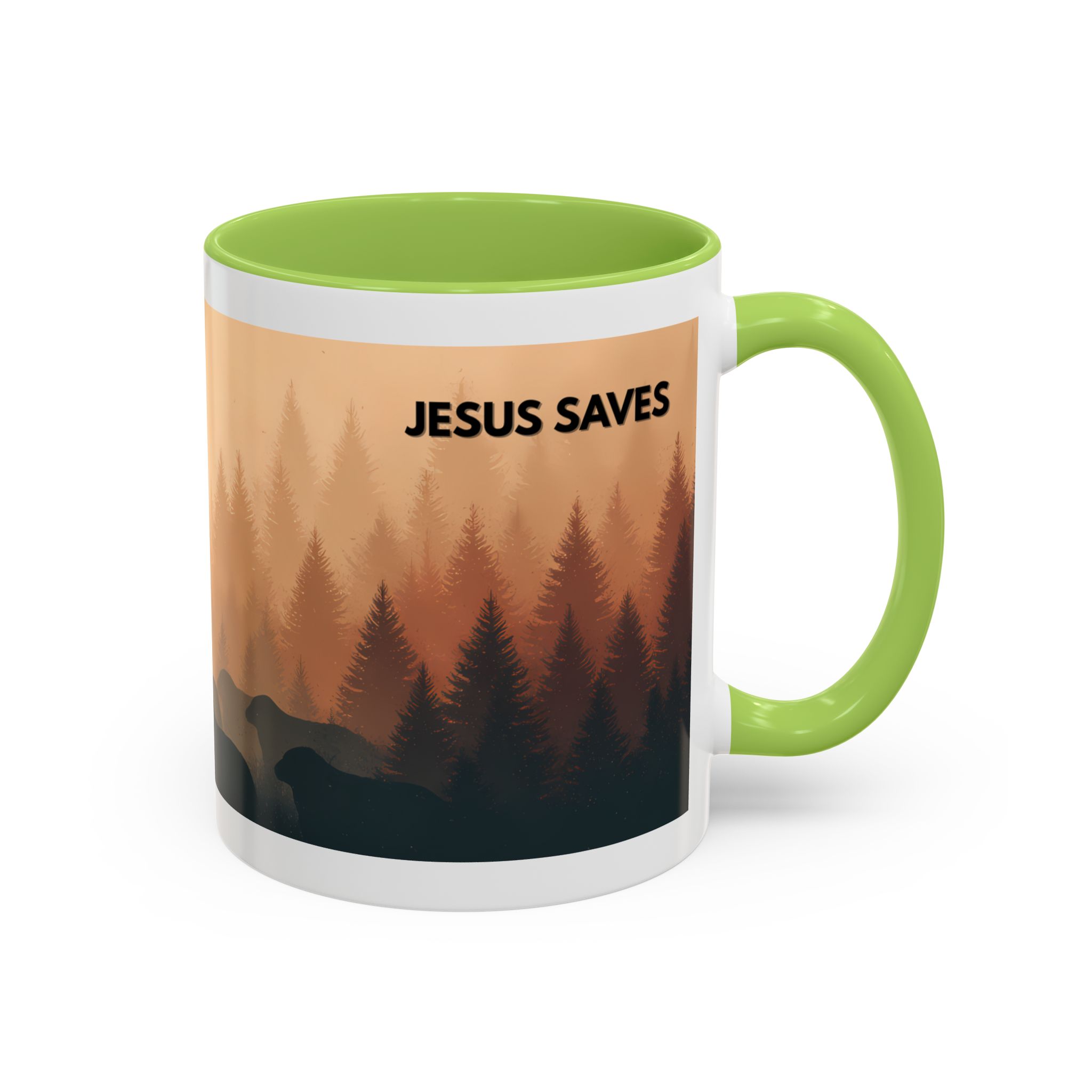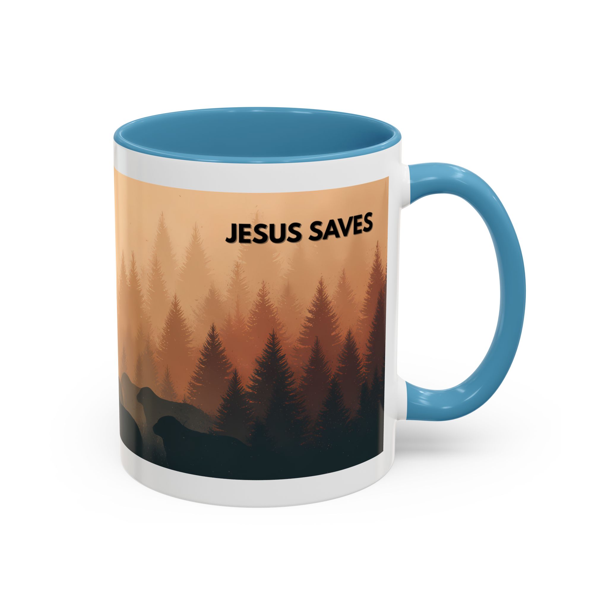 This ceramic accent coffee mug features a peaceful forest scene in soft, warm tones with a silhouetted figure and the message “Jesus Saves.” The artwork offers a calm reminder of faith, while the glossy white exterior is paired with a colored interior and handle for a striking contrast. Available in 11 oz and 15 oz sizes, this durable mug is microwave- and dishwasher-safe, making it ideal for daily coffee, tea, prayer breaks, or quiet moments of reflection.