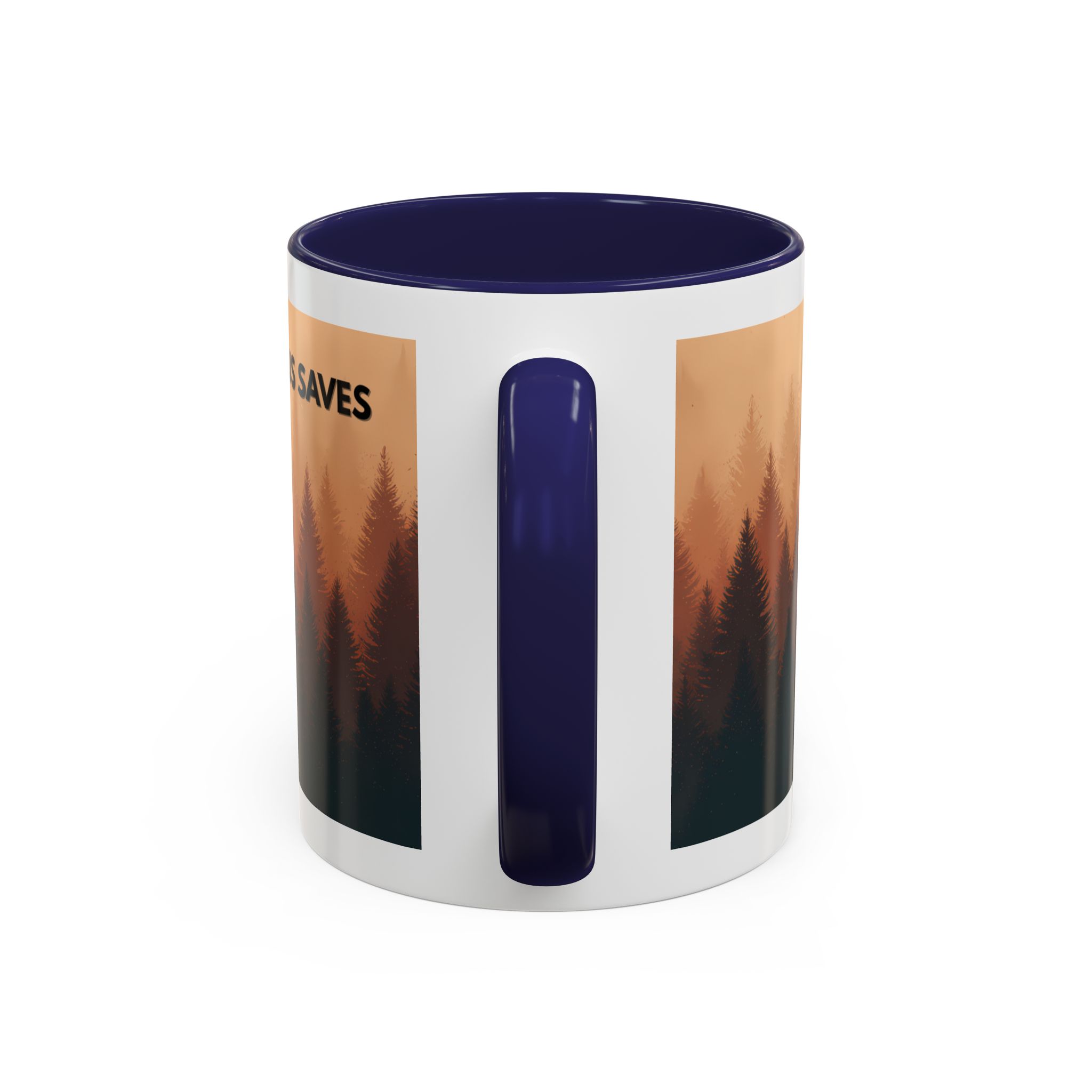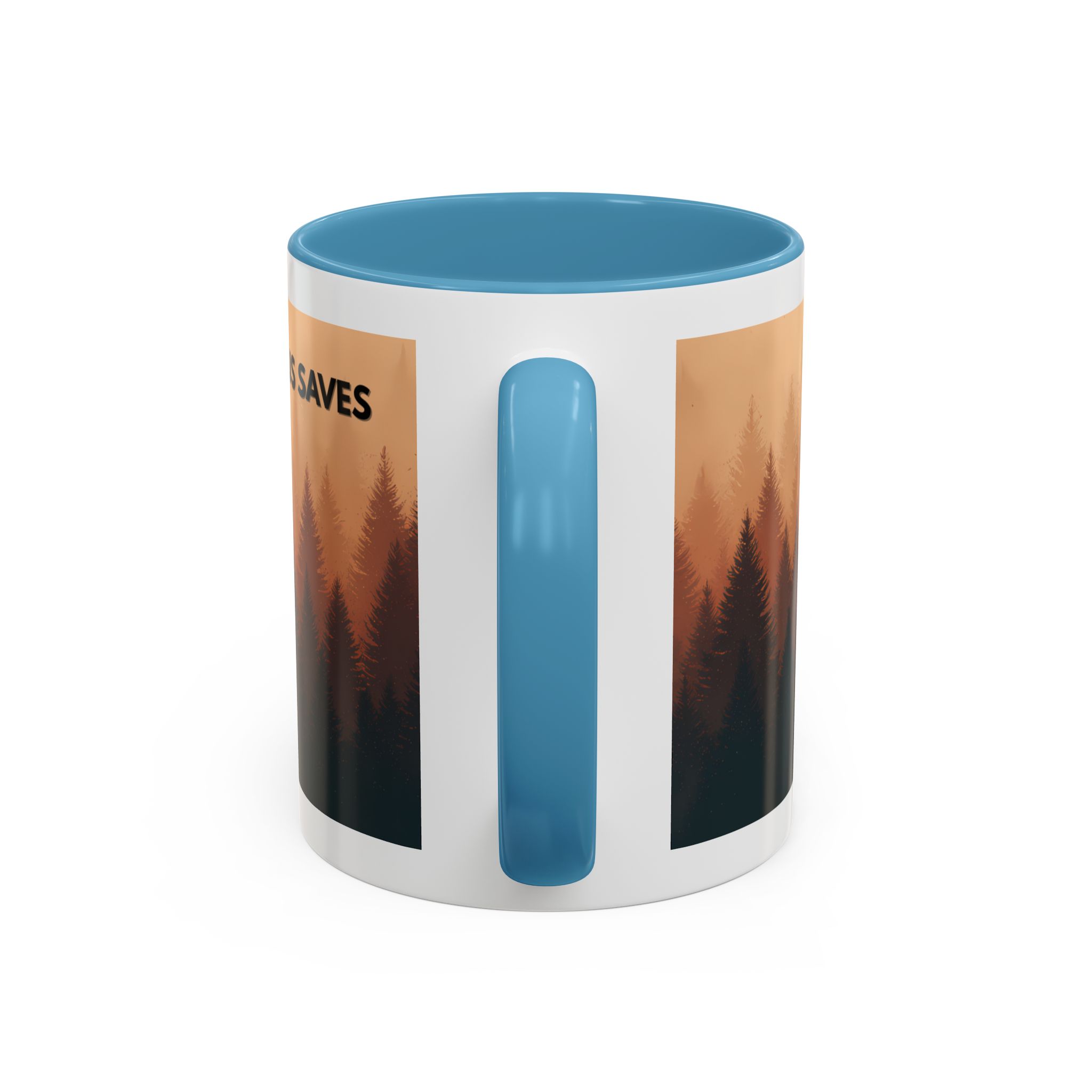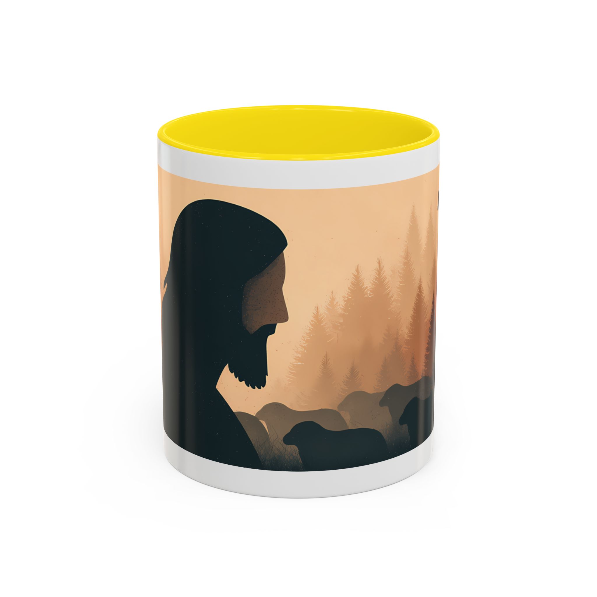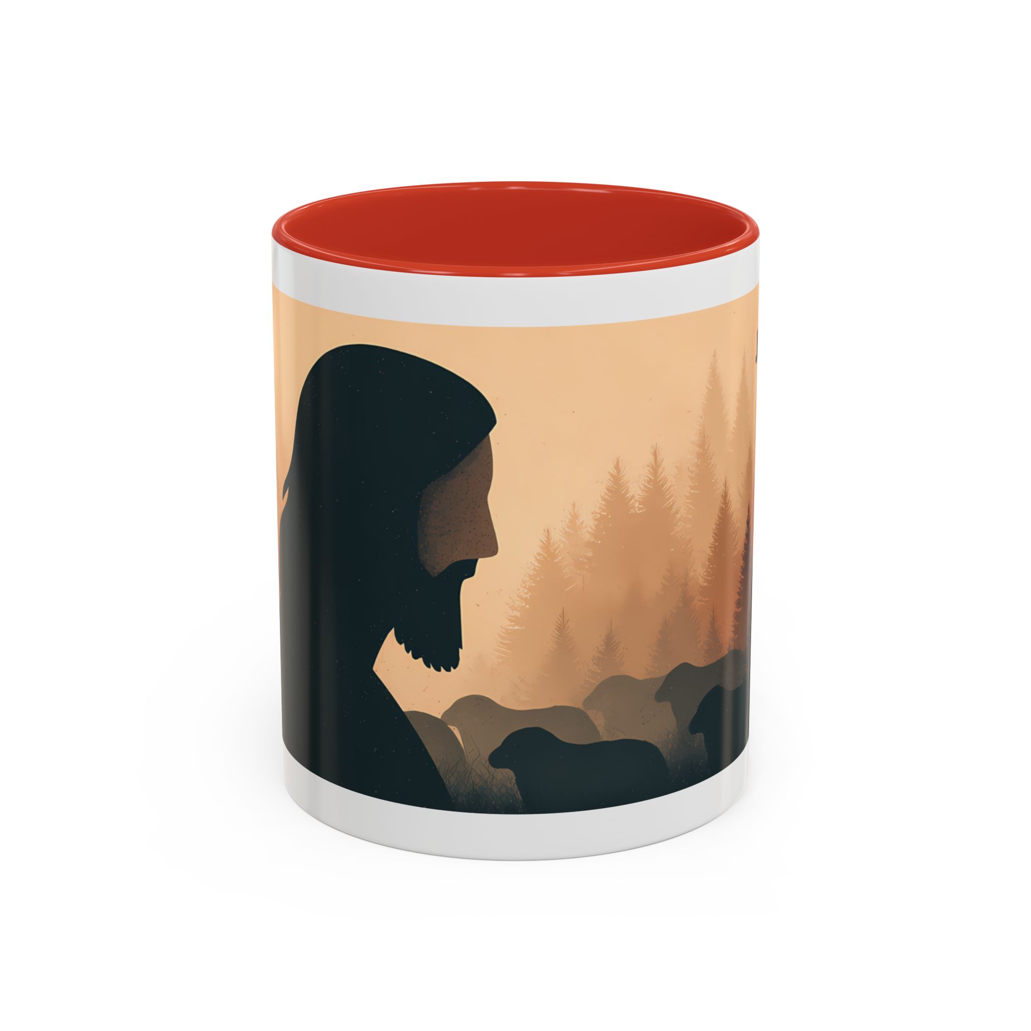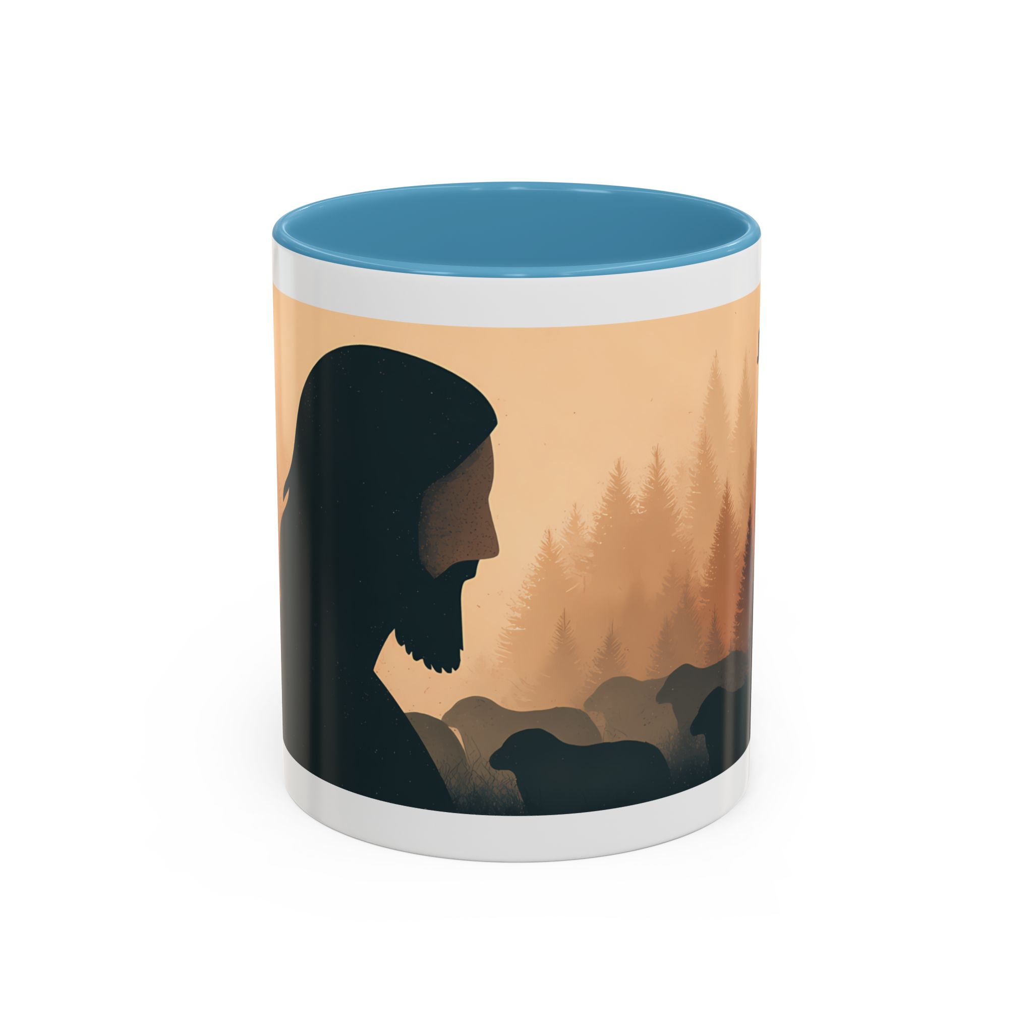 This ceramic accent coffee mug features a peaceful forest scene in soft, warm tones with a silhouetted figure and the message “Jesus Saves.” The artwork offers a calm reminder of faith, while the glossy white exterior is paired with a colored interior and handle for a striking contrast. Available in 11 oz and 15 oz sizes, this durable mug is microwave- and dishwasher-safe, making it ideal for daily coffee, tea, prayer breaks, or quiet moments of reflection.