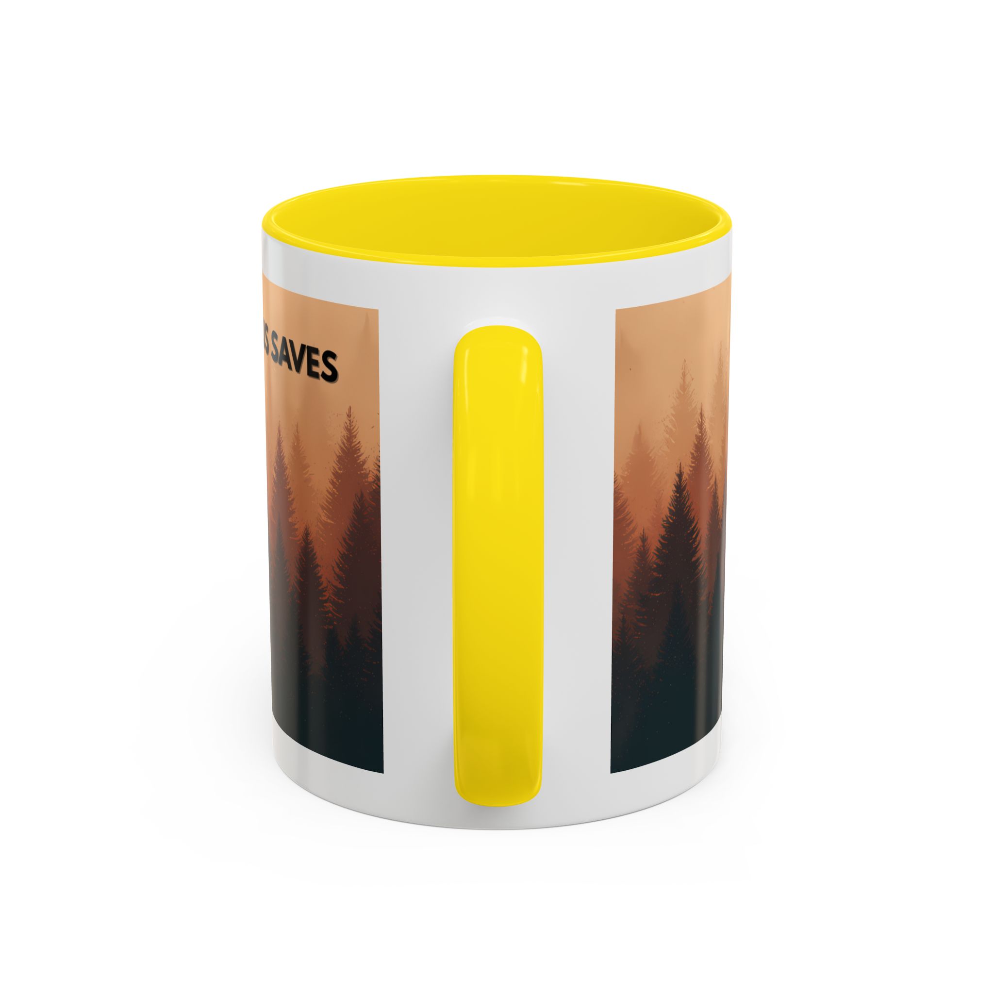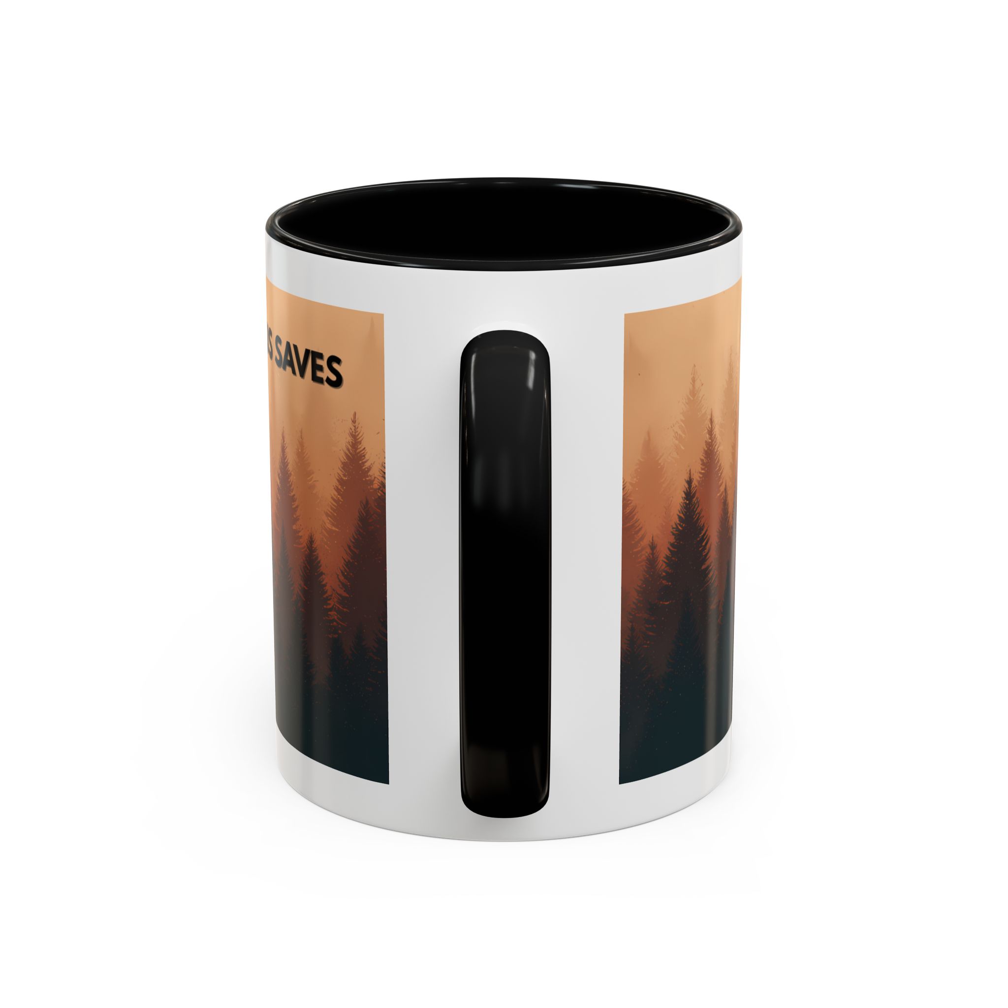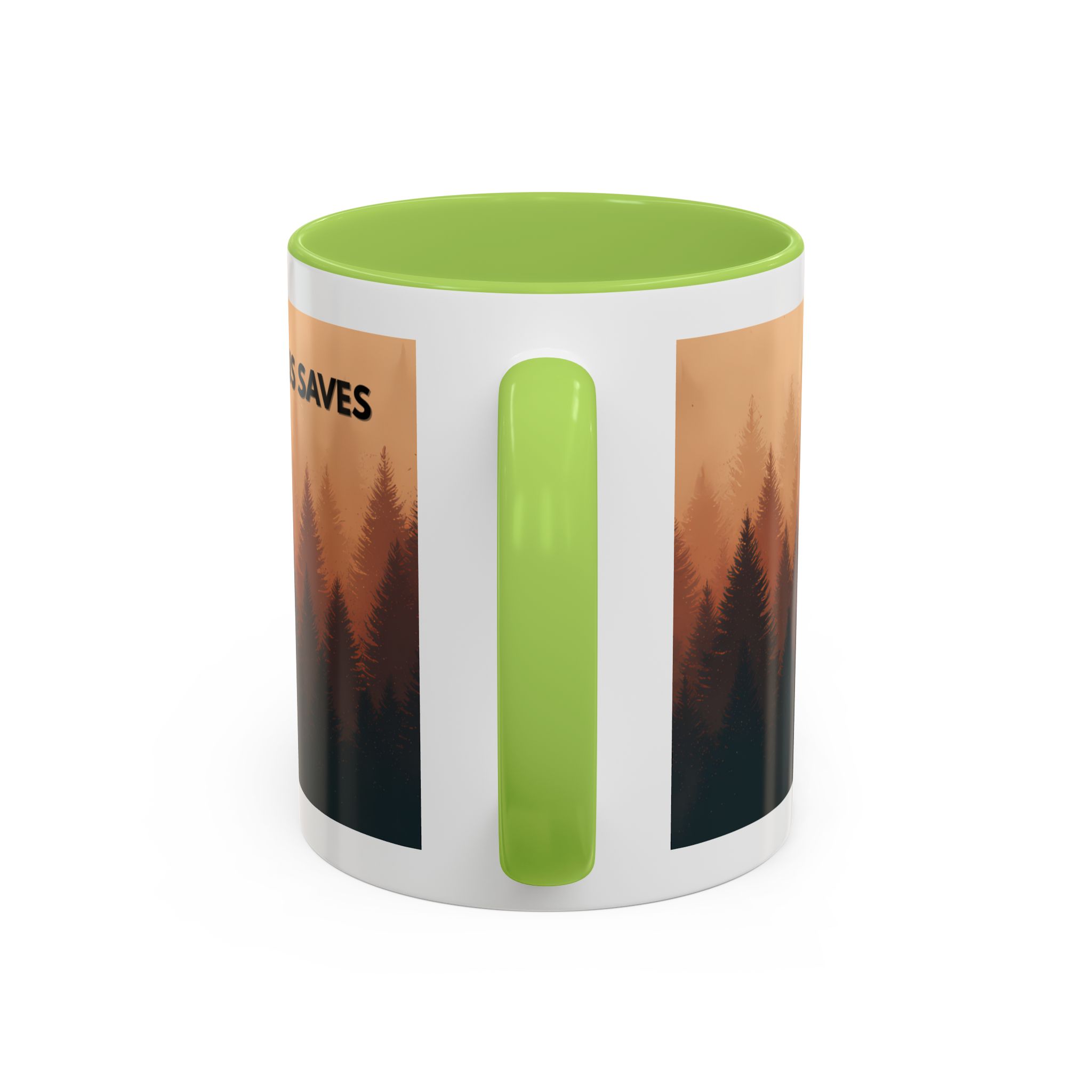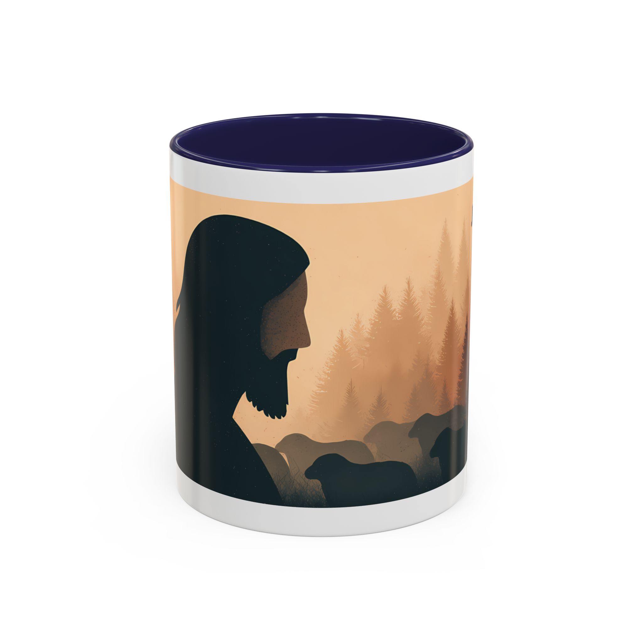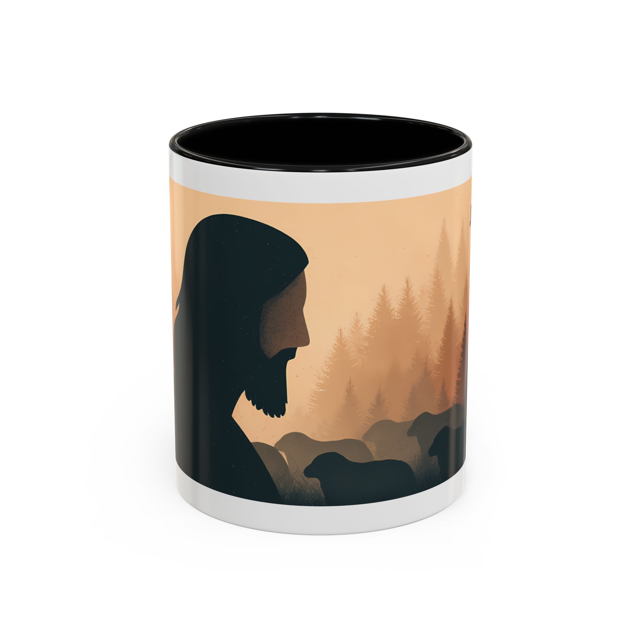 This ceramic accent coffee mug features a peaceful forest scene in soft, warm tones with a silhouetted figure and the message “Jesus Saves.” The artwork offers a calm reminder of faith, while the glossy white exterior is paired with a colored interior and handle for a striking contrast. Available in 11 oz and 15 oz sizes, this durable mug is microwave- and dishwasher-safe, making it ideal for daily coffee, tea, prayer breaks, or quiet moments of reflection.