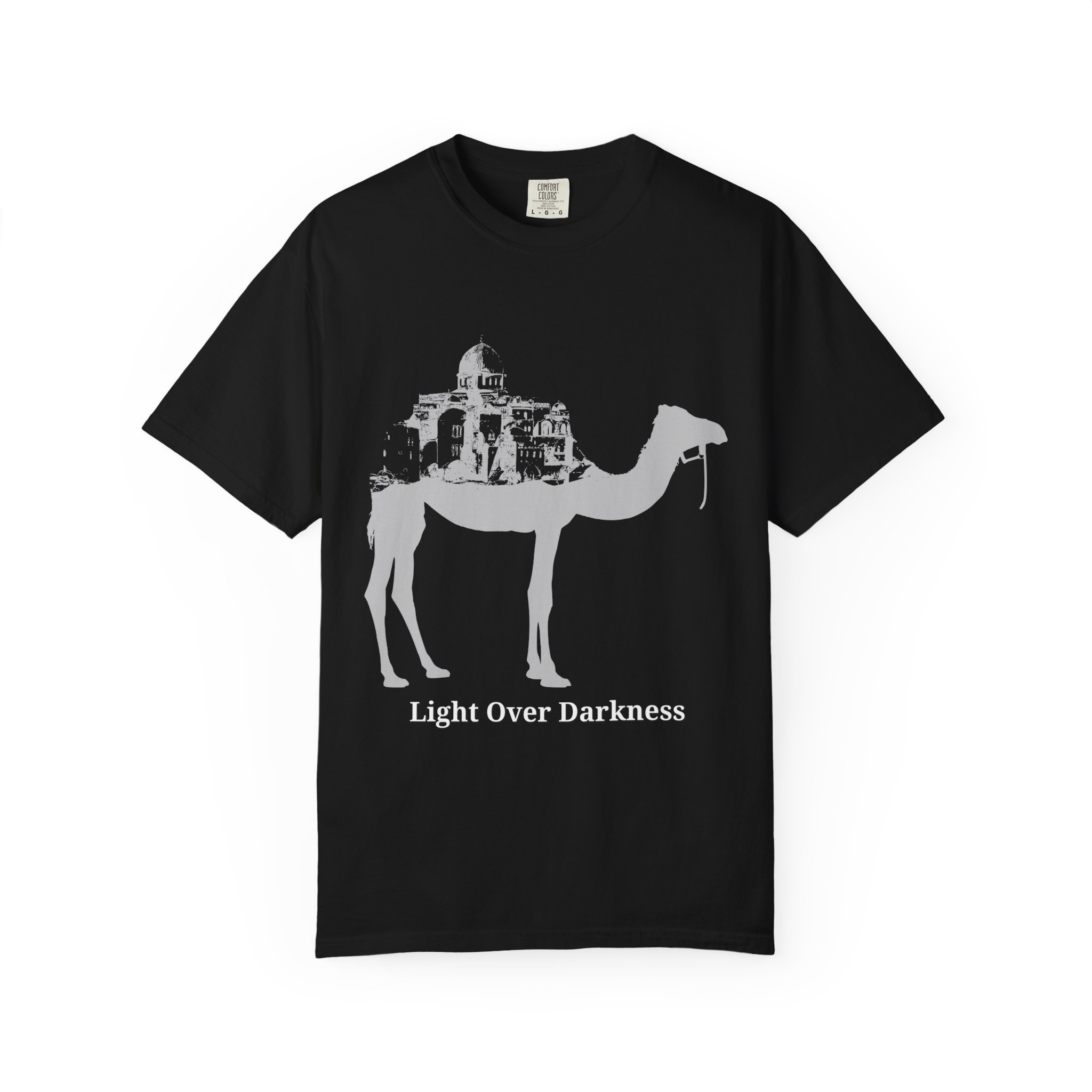 This heavyweight garment-dyed t-shirt features a symbolic design of a silhouetted camel carrying a glowing city with the phrase “Light Over Darkness.” Made from soft, ring-spun cotton, it offers a relaxed fit with a lived-in feel from the first wear. The muted front print and subtle back detail create a balanced, thoughtful look. Built with durable double-needle stitching and tubular knit construction, this tee holds its shape wash after wash and works equally well layered or worn on its own for understated, meaningful style.