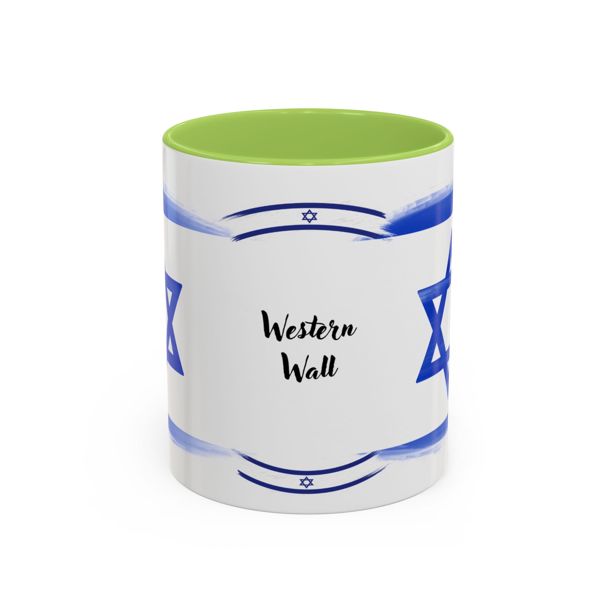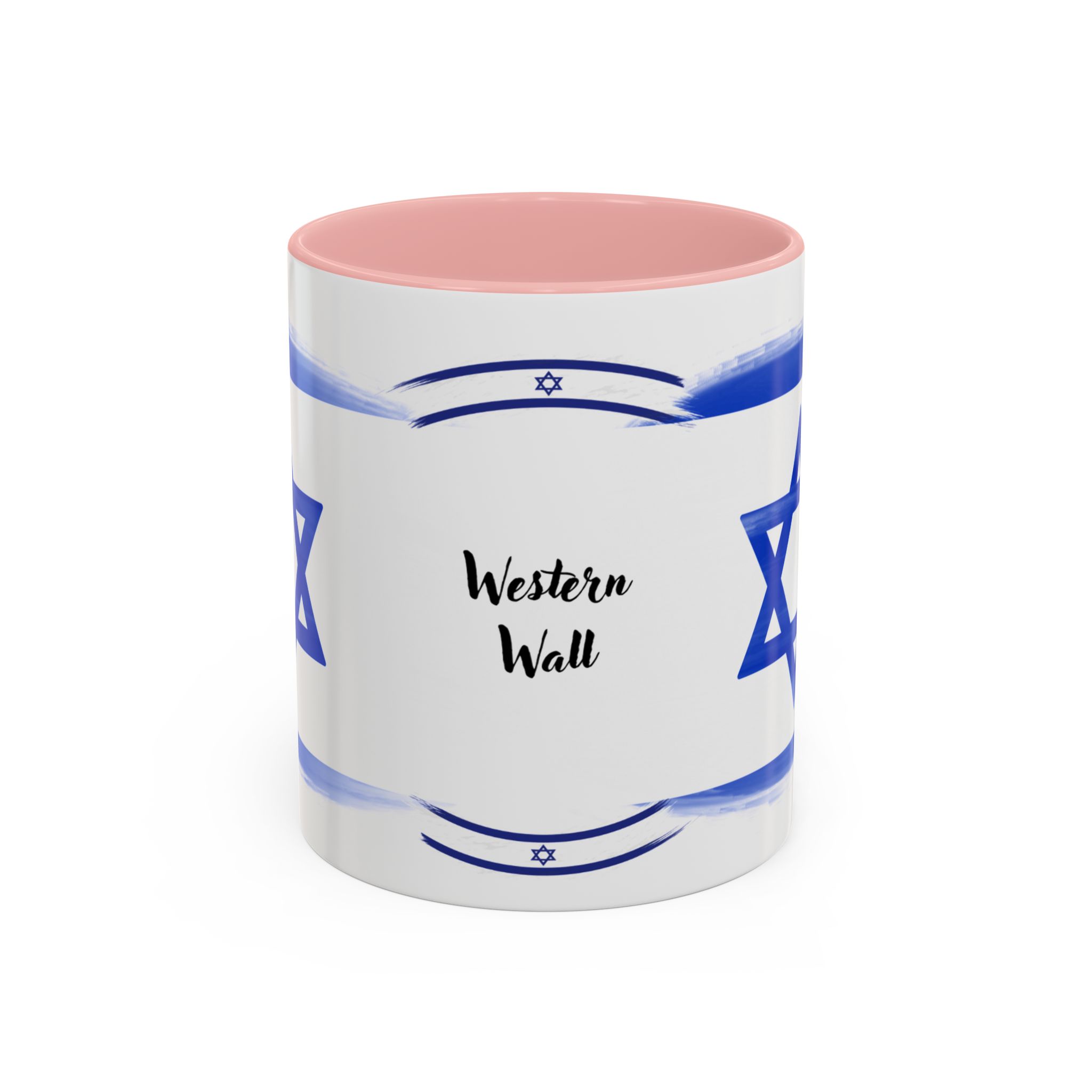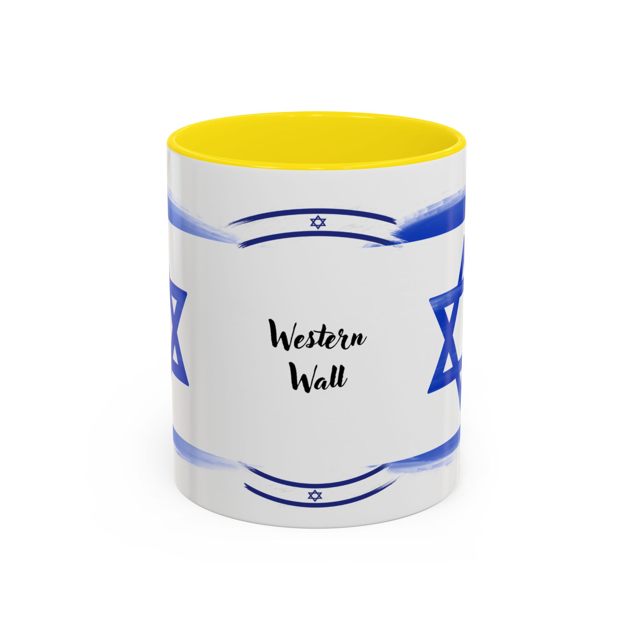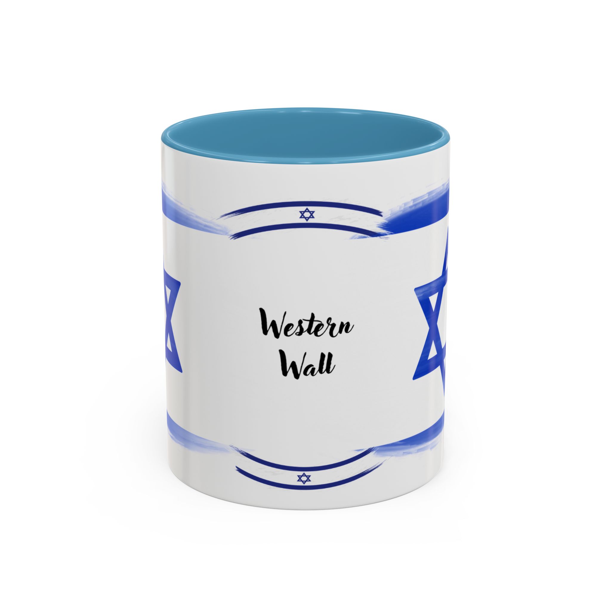 This glossy ceramic accent mug brings quiet reflection and connection to your morning ritual. Featuring a watercolor-inspired blue design with two Stars of David and brushstroke bands echoing the Israeli flag, the center reads “Western Wall” in casual, handwritten script—a subtle nod to pilgrimage, memory, and home. The bold, contrasting interior and handle highlight the vibrant artwork, while the comfortable C-shaped handle ensures everyday ease. Perfect for slow mornings, study sessions, or a display alongside keepsakes and travel mementos.