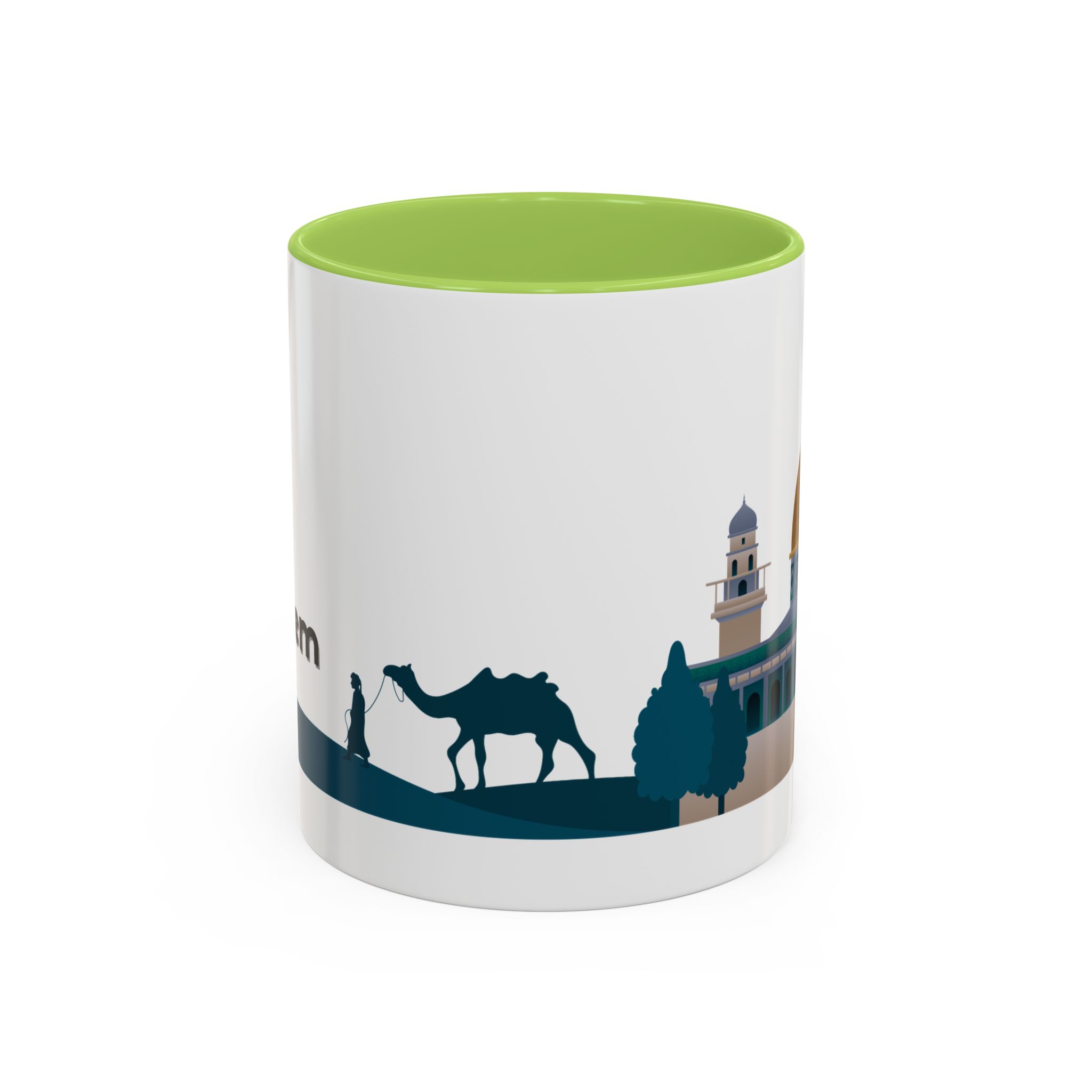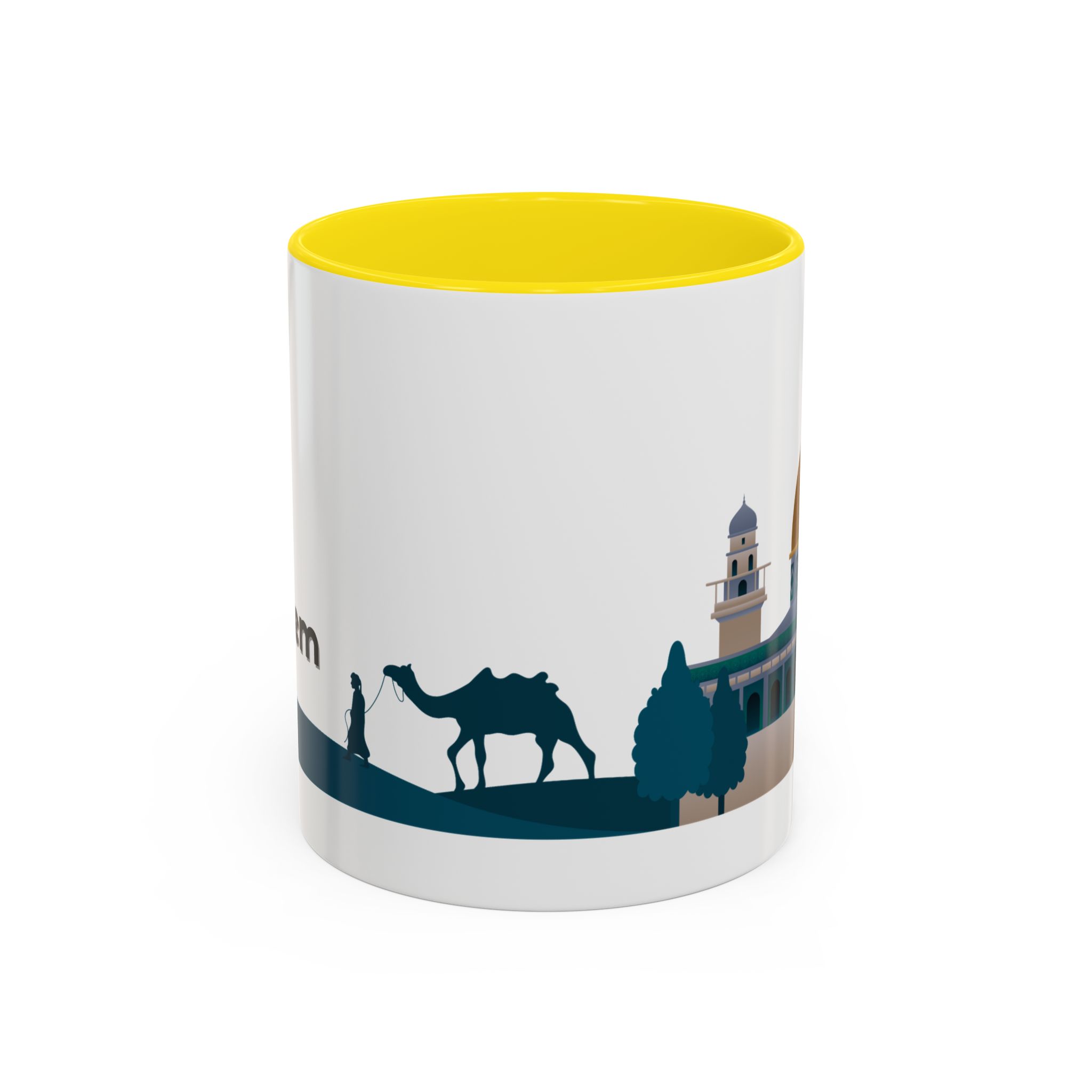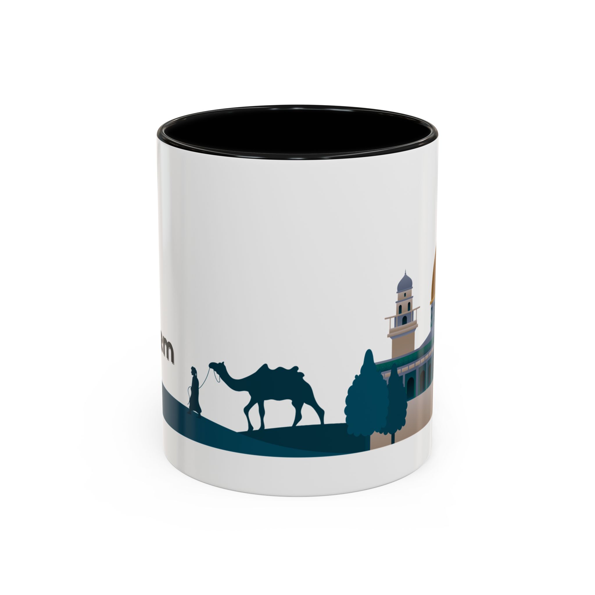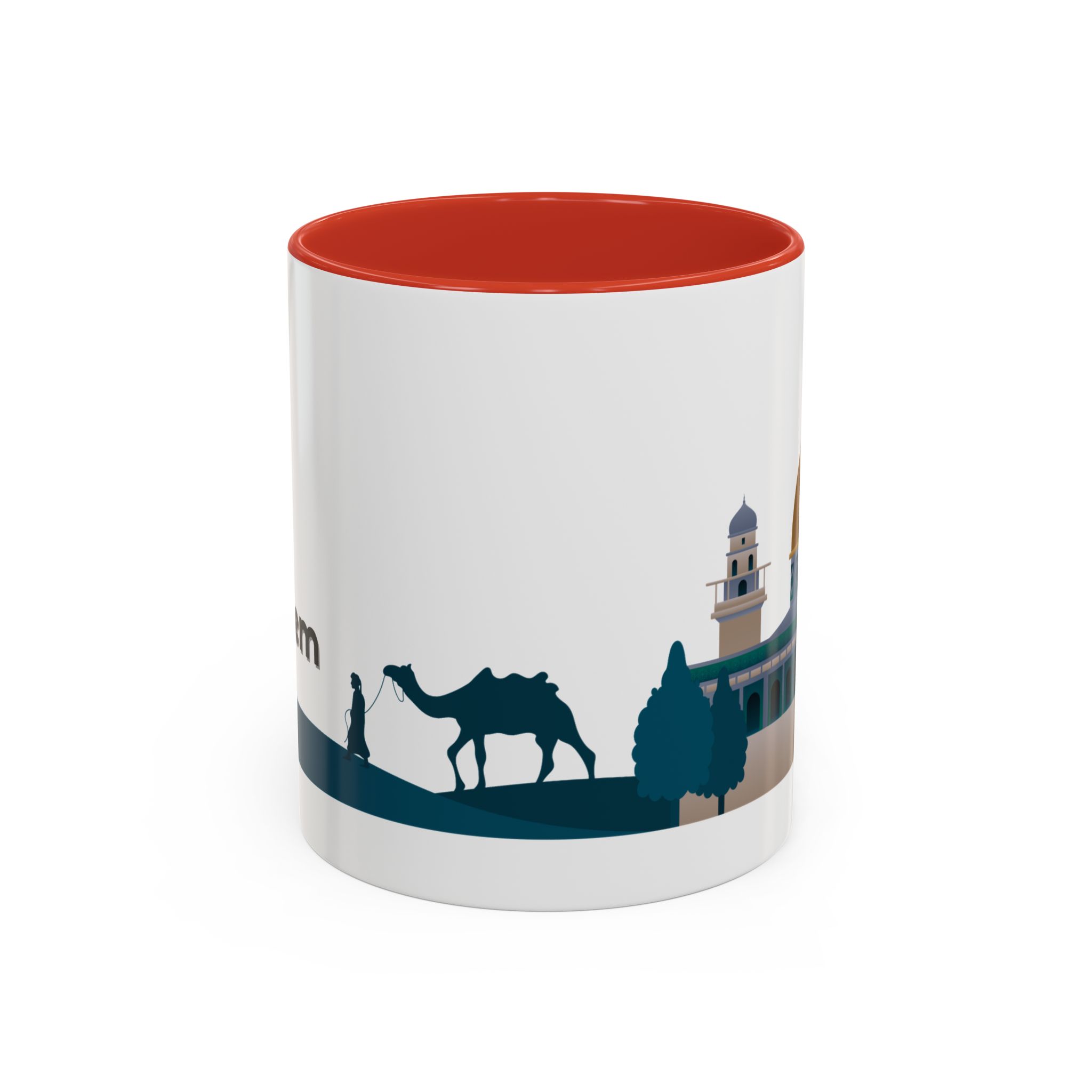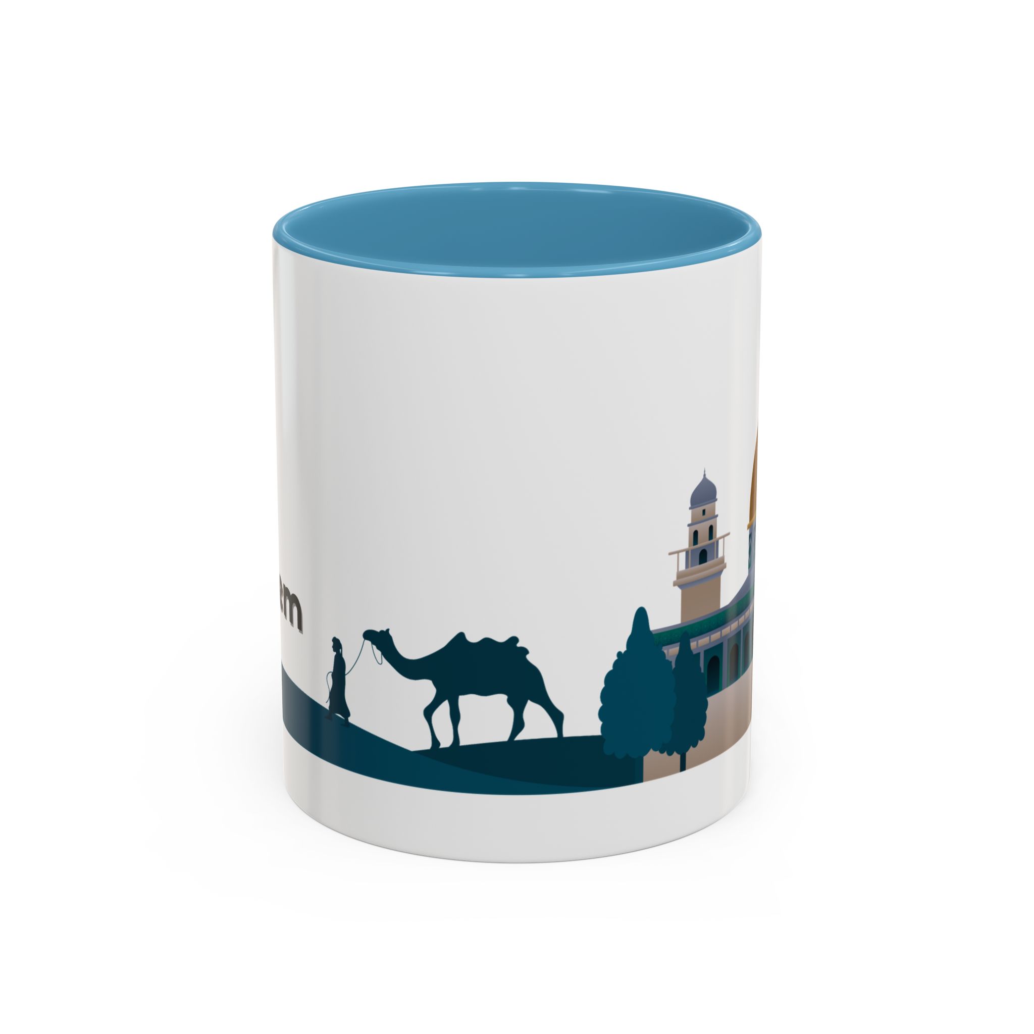 This ceramic accent mug features a panoramic skyline design with a golden dome, minarets, palm trees, and a camel silhouette, creating a calm travel-inspired scene. The glossy white exterior keeps the artwork bright, while the colored interior and handle add a stylish contrast. Durable and practical, it’s microwave- and dishwasher-safe, making it perfect for daily coffee, tea, or quiet moments of reflection. Designed to bring a sense of journey and atmosphere to every sip.