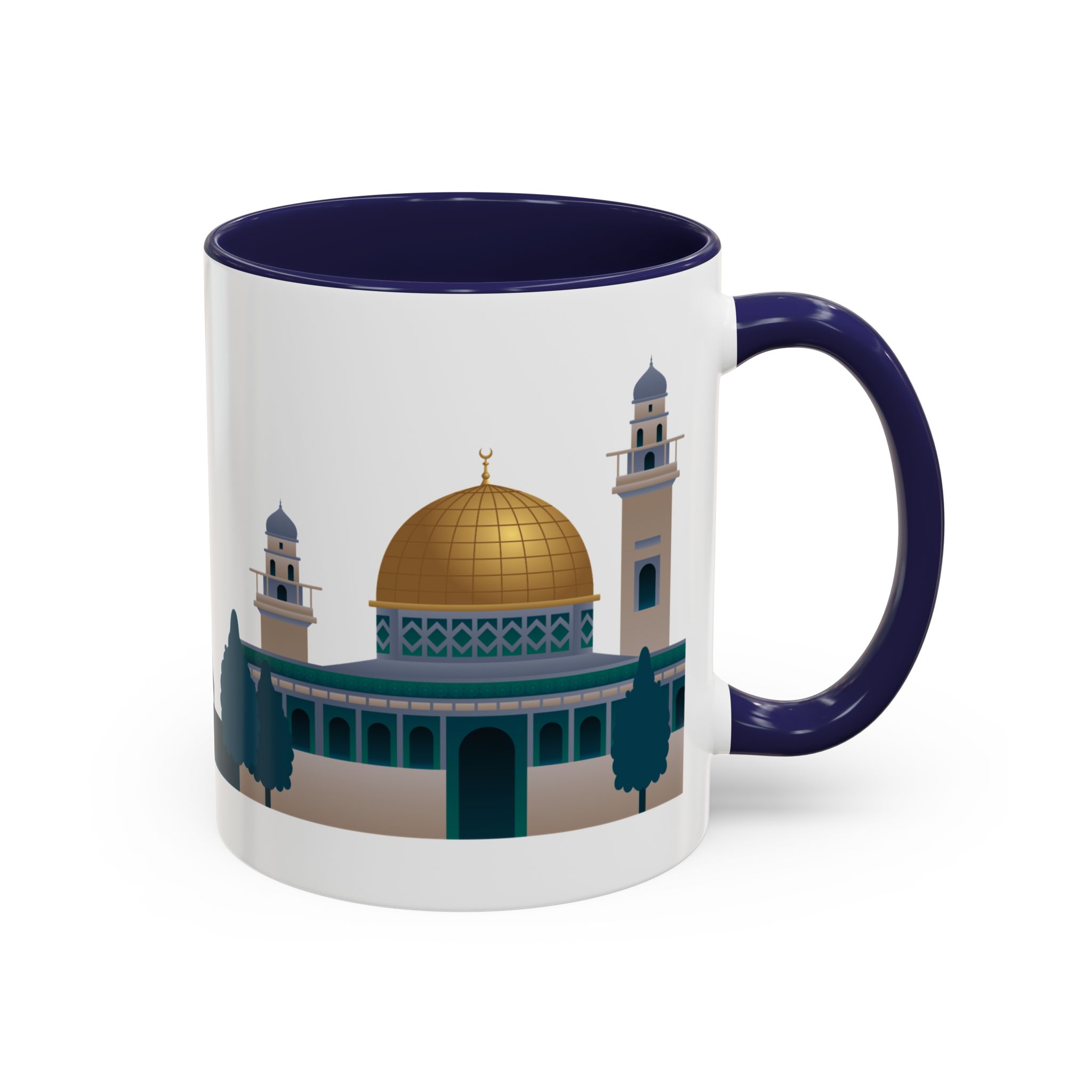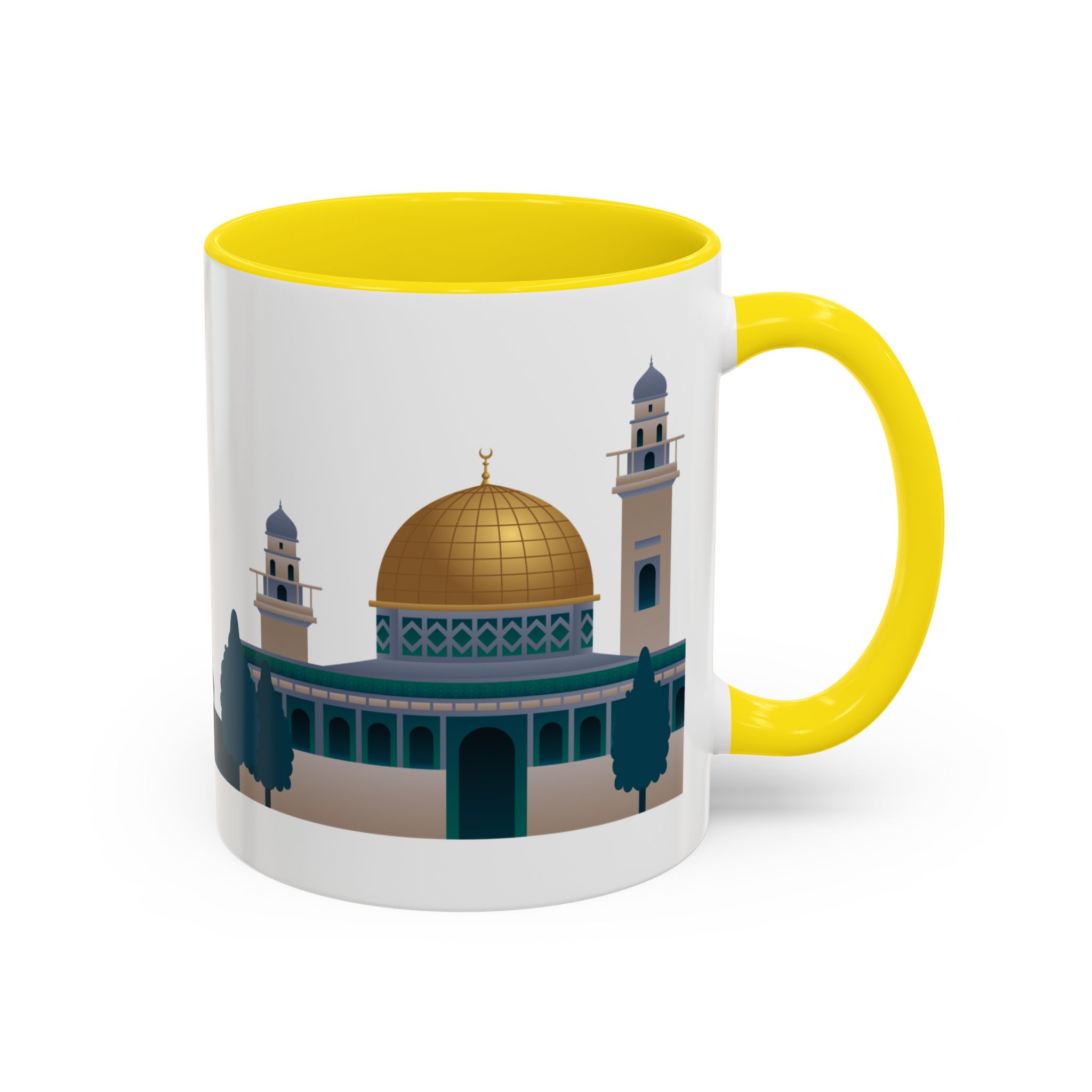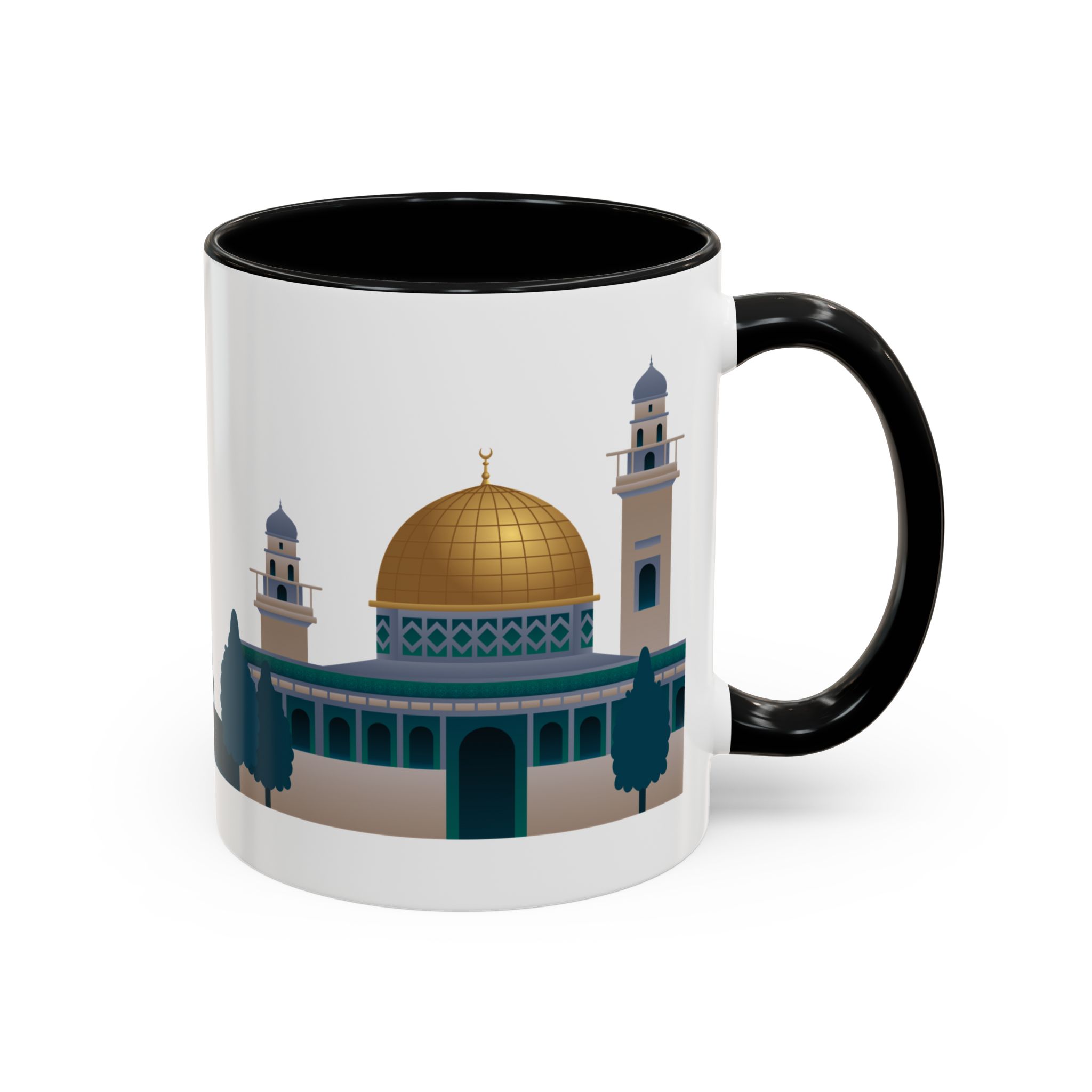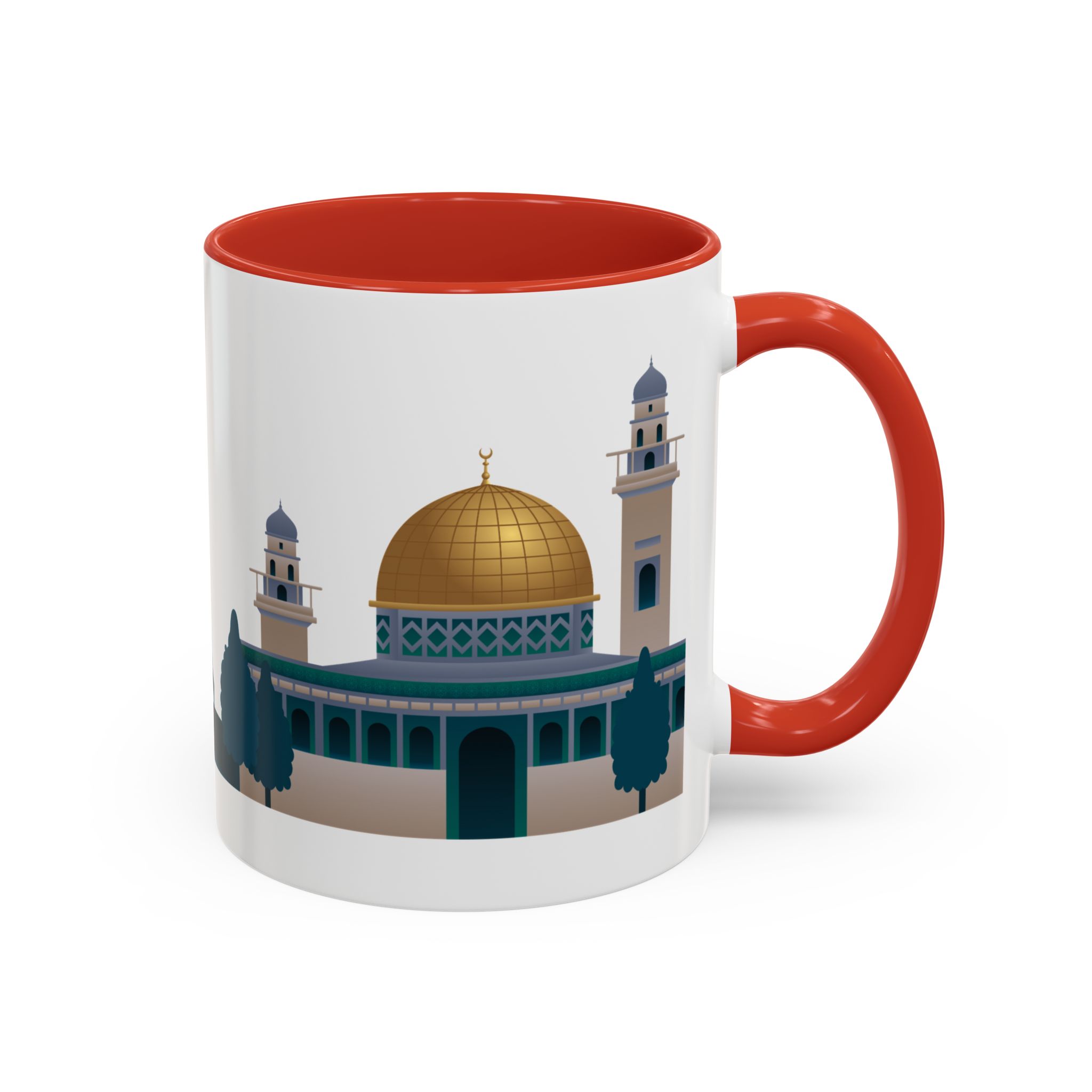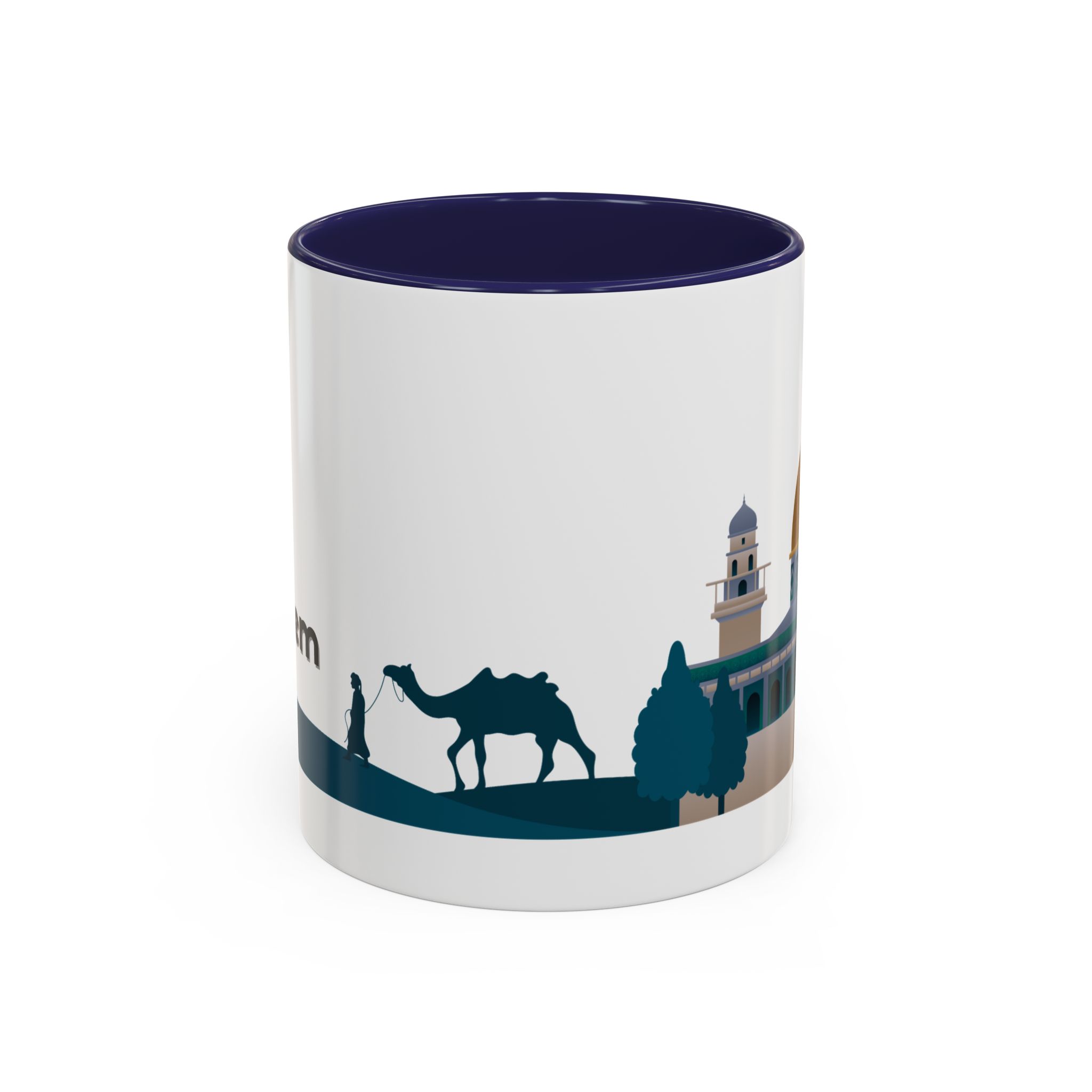 This ceramic accent mug features a panoramic skyline design with a golden dome, minarets, palm trees, and a camel silhouette, creating a calm travel-inspired scene. The glossy white exterior keeps the artwork bright, while the colored interior and handle add a stylish contrast. Durable and practical, it’s microwave- and dishwasher-safe, making it perfect for daily coffee, tea, or quiet moments of reflection. Designed to bring a sense of journey and atmosphere to every sip.