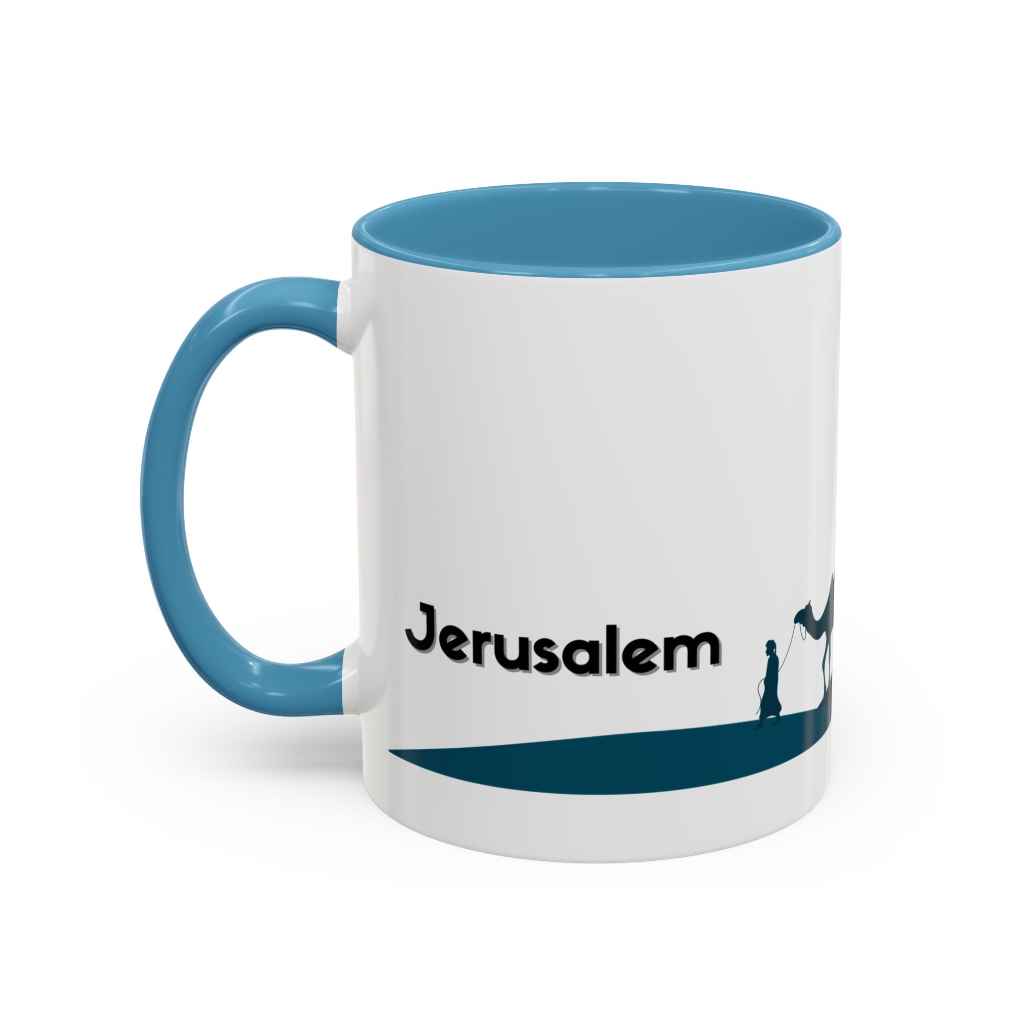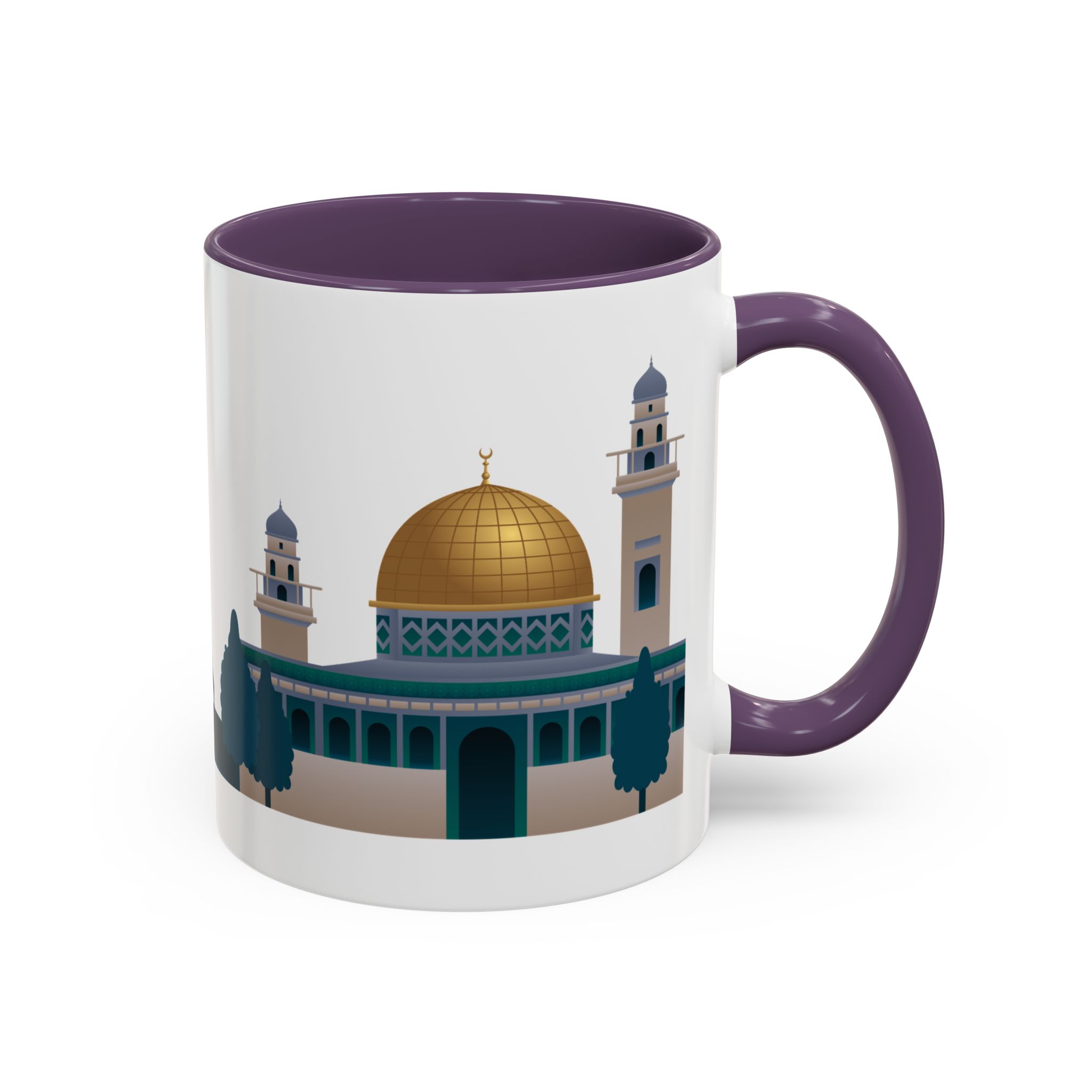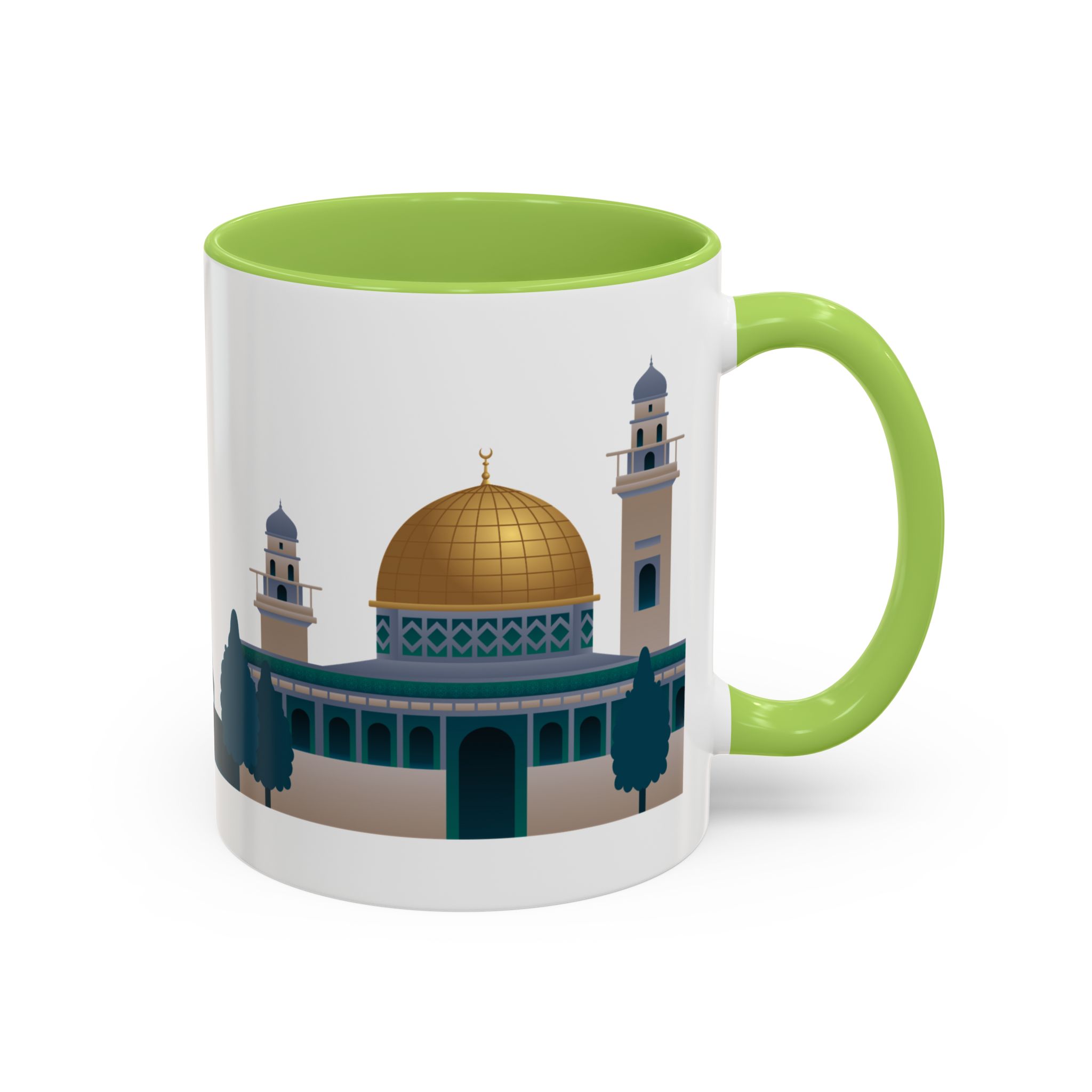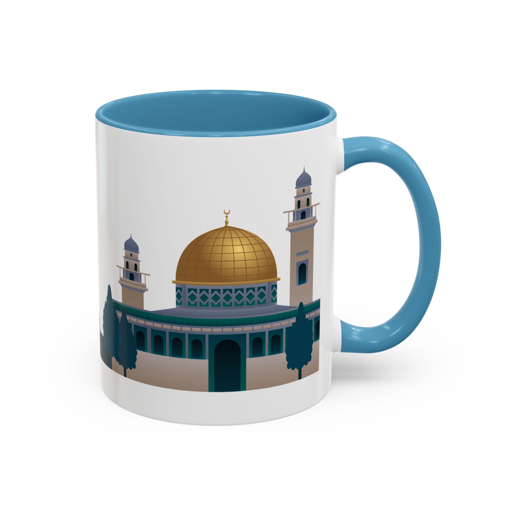 This ceramic accent mug features a panoramic skyline design with a golden dome, minarets, palm trees, and a camel silhouette, creating a calm travel-inspired scene. The glossy white exterior keeps the artwork bright, while the colored interior and handle add a stylish contrast. Durable and practical, it’s microwave- and dishwasher-safe, making it perfect for daily coffee, tea, or quiet moments of reflection. Designed to bring a sense of journey and atmosphere to every sip.