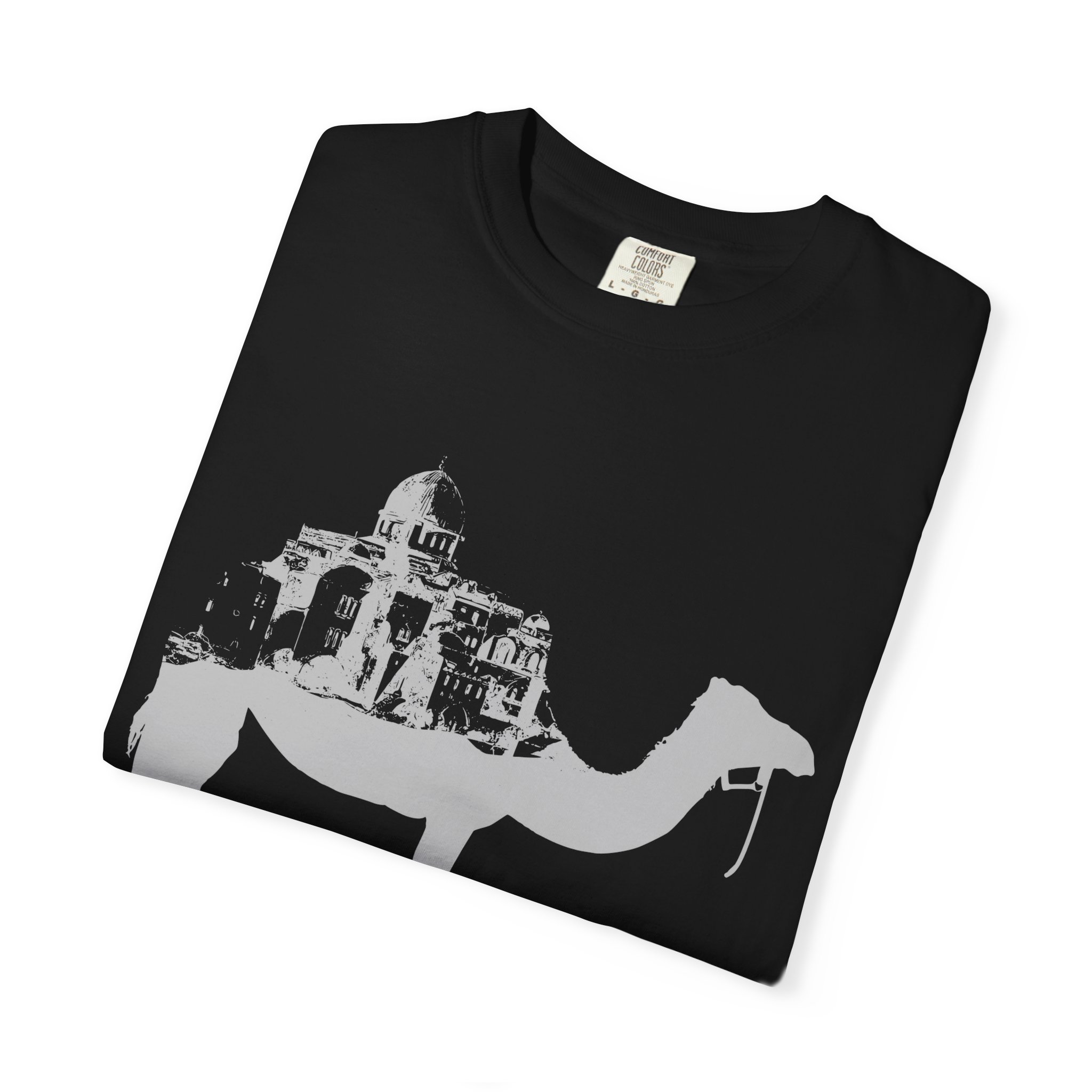 This heavyweight garment-dyed t-shirt features a symbolic design of a silhouetted camel carrying a glowing city with the phrase “Light Over Darkness.” Made from soft, ring-spun cotton, it offers a relaxed fit with a lived-in feel from the first wear. The muted front print and subtle back detail create a balanced, thoughtful look. Built with durable double-needle stitching and tubular knit construction, this tee holds its shape wash after wash and works equally well layered or worn on its own for understated, meaningful style.